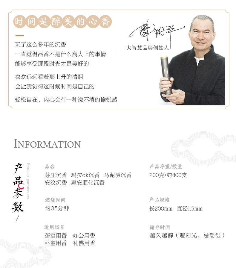 - 以沉香为媒,大智慧沉香述说中国人香事生活中的美与智慧。 将沉香与生俱来的雅与趣、净美的生活禅意, 融入现代人的生活场景。