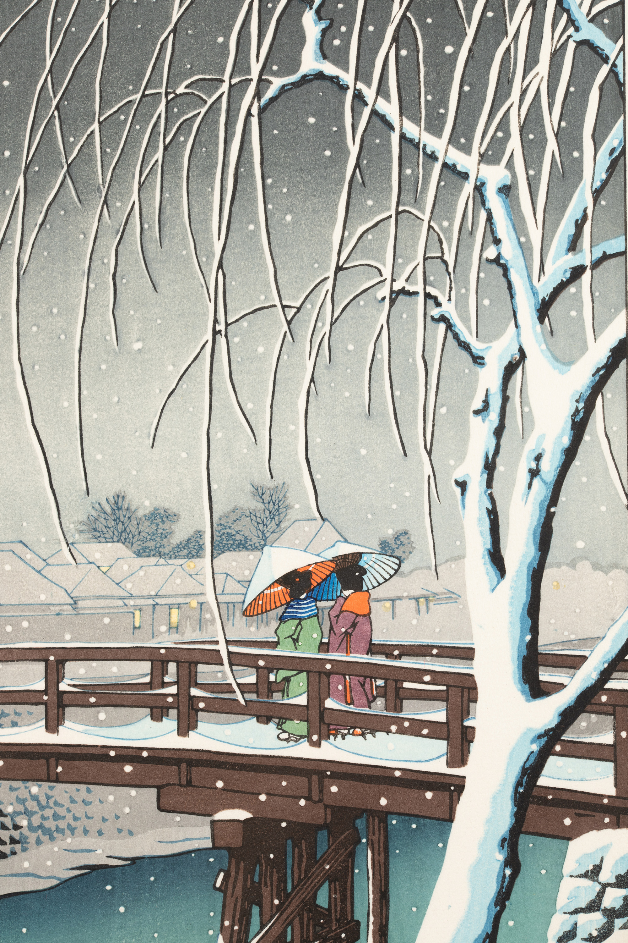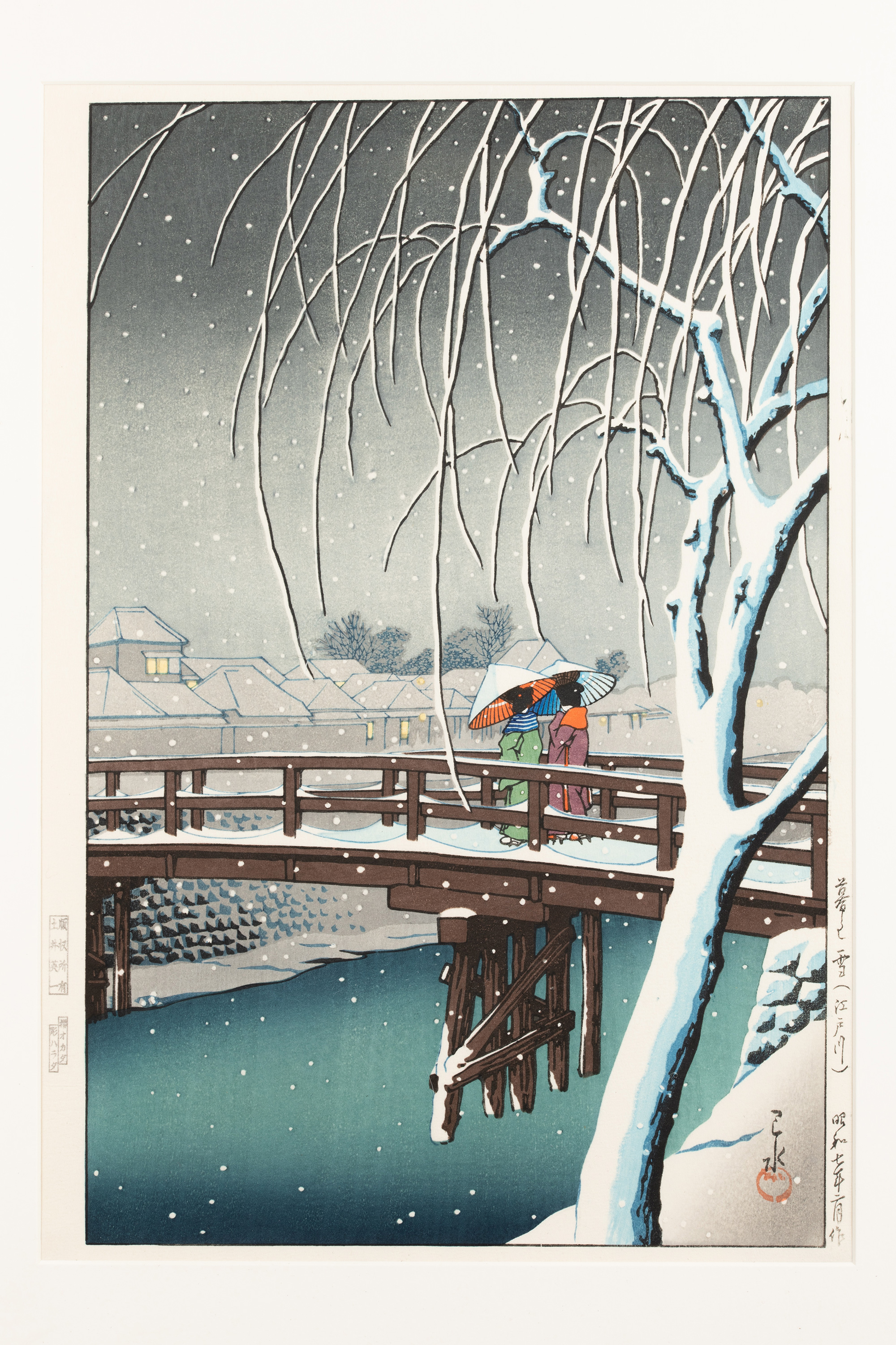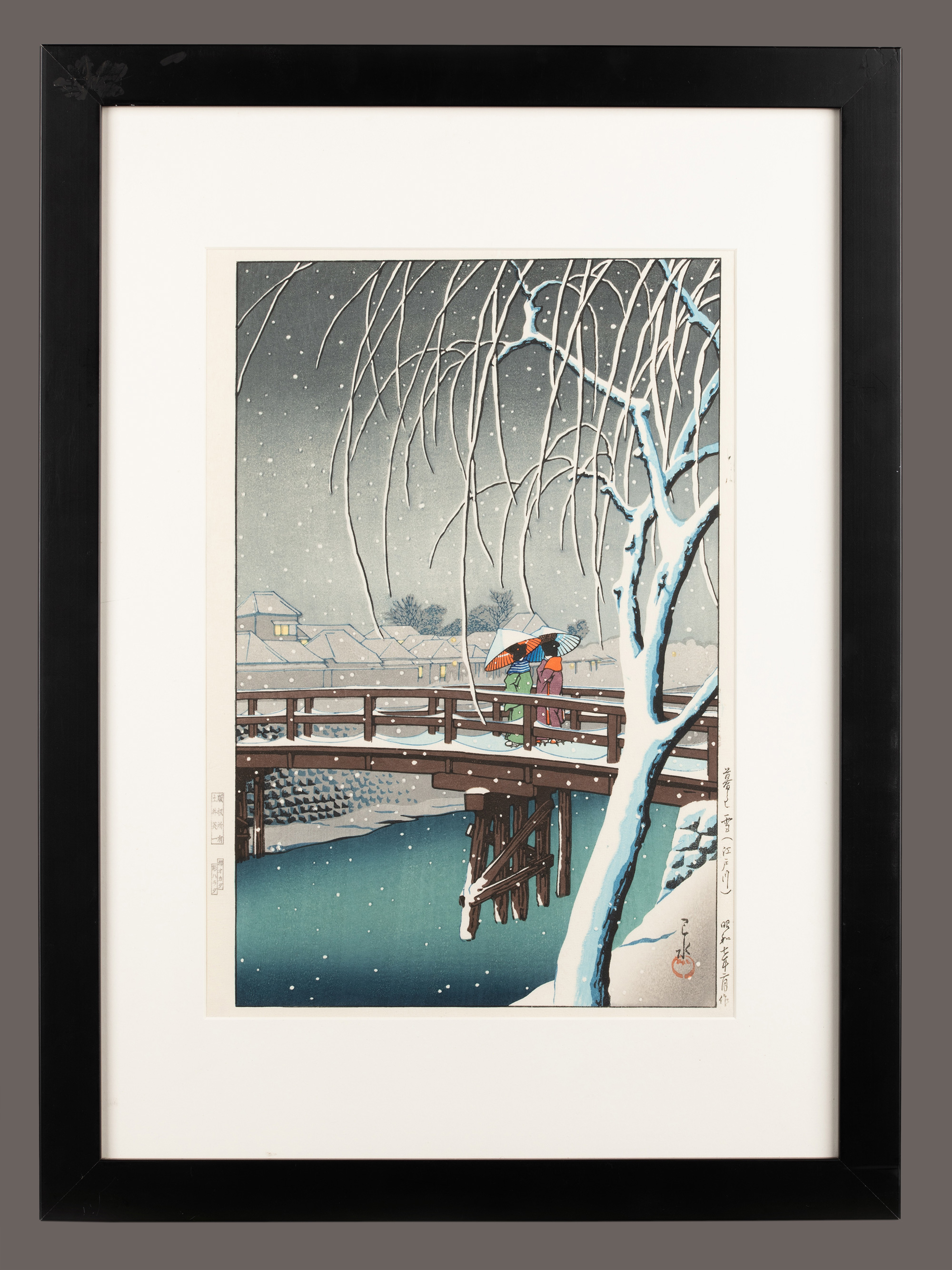 【已售】独角鹿西洋古董1932年日本昭和时代著名国宝级大师川濑巴水签名创作新版画《暮るる雪(江户川)》