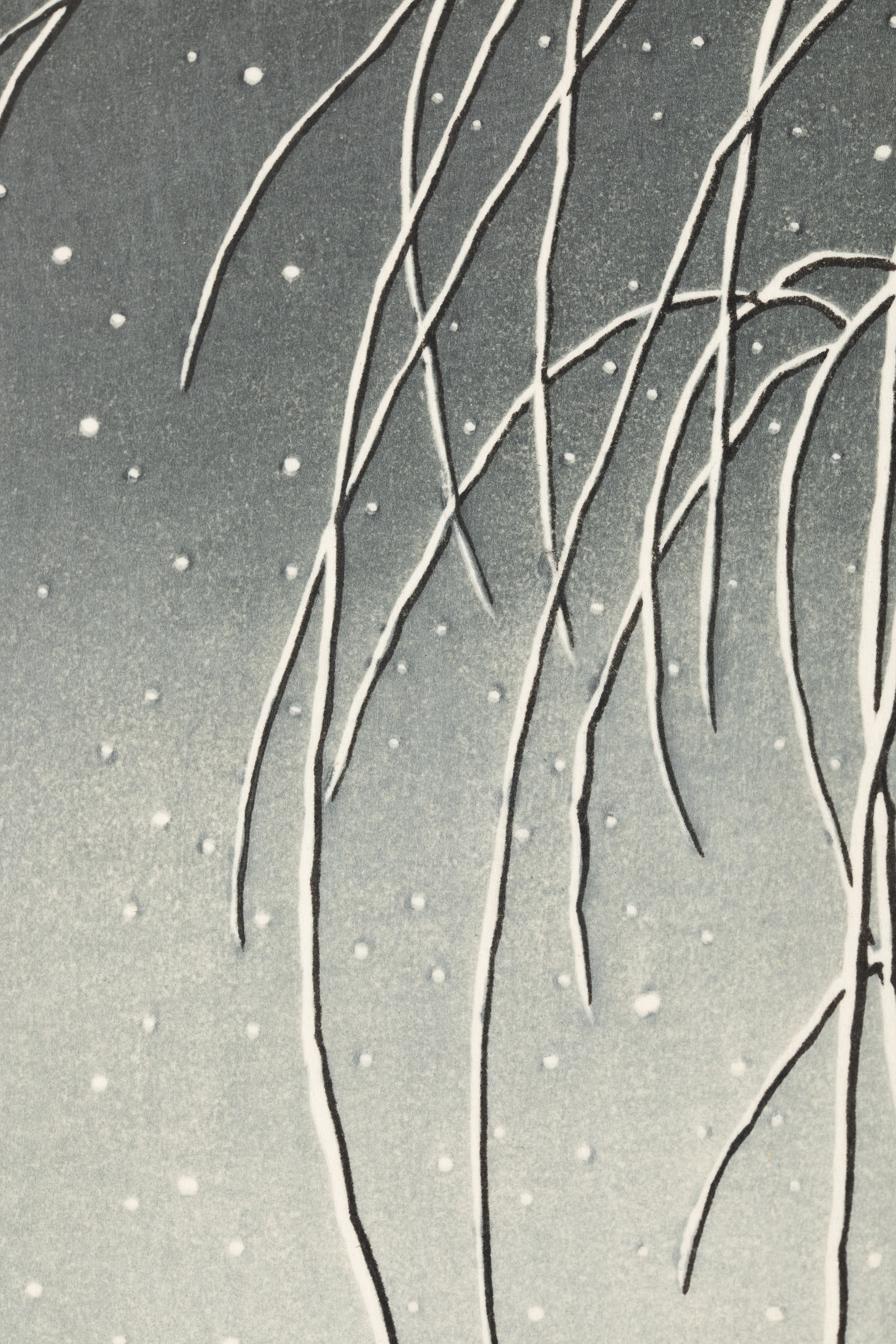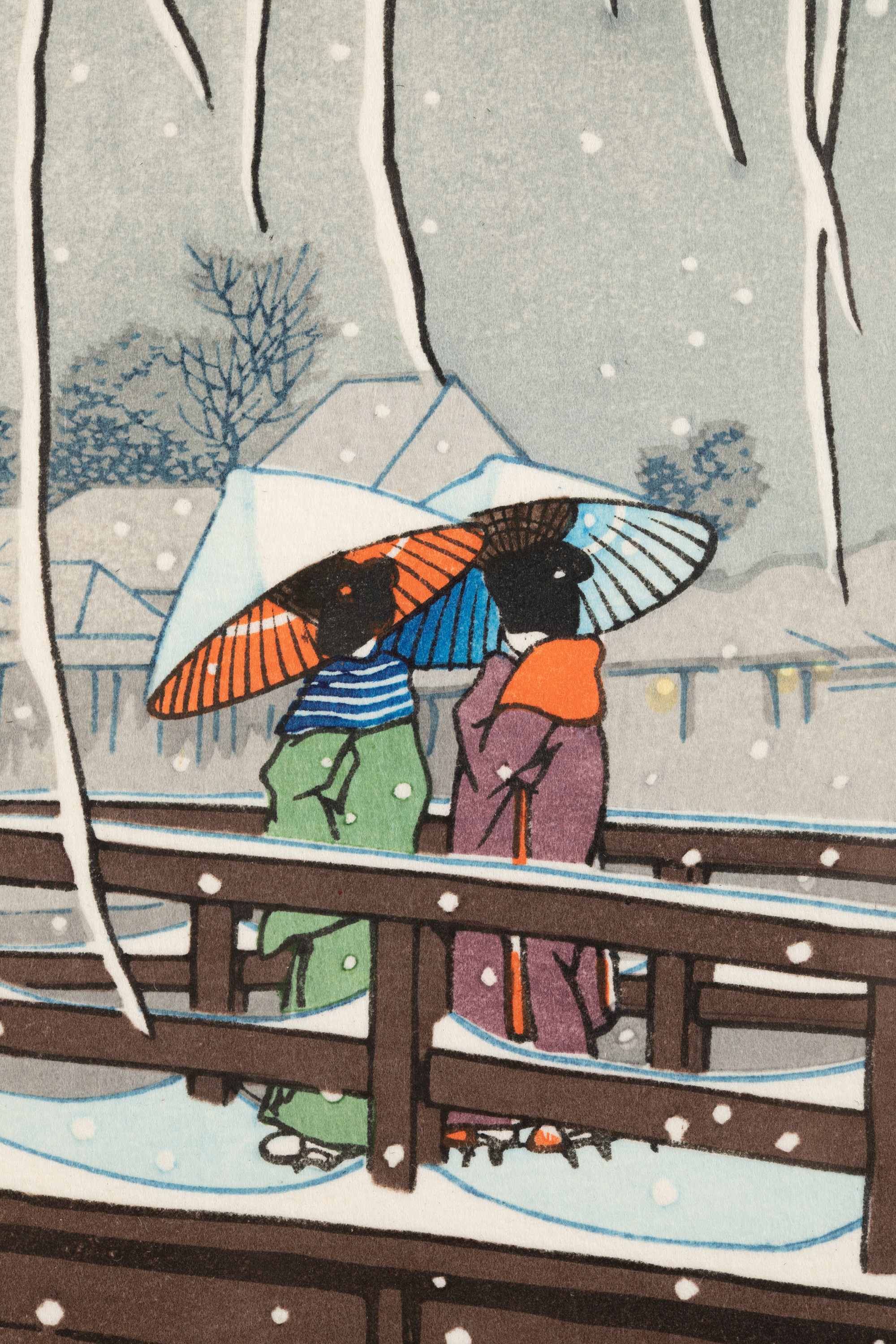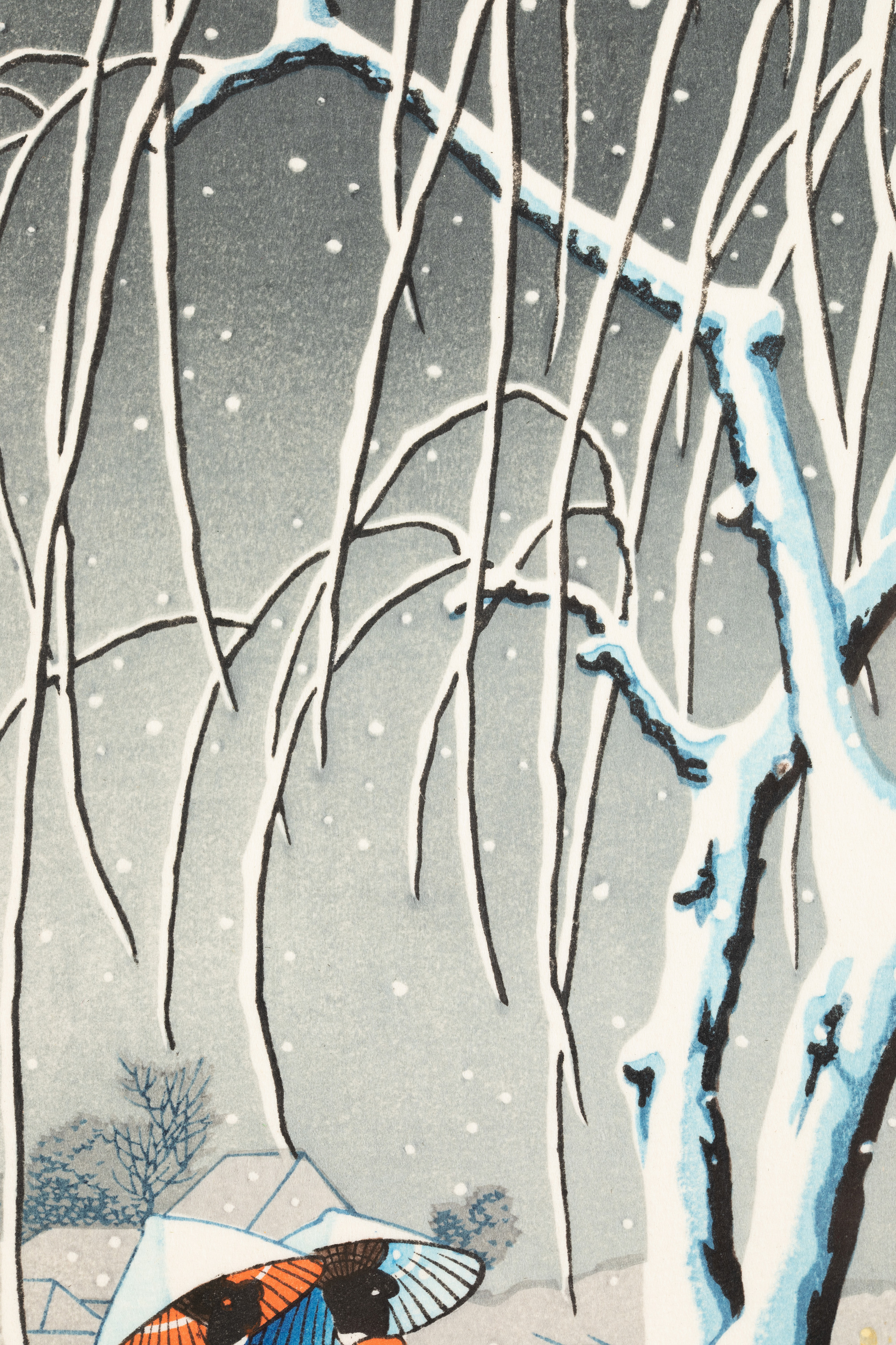 【已售】独角鹿西洋古董1932年日本昭和时代著名国宝级大师川濑巴水签名创作新版画《暮るる雪(江户川)》