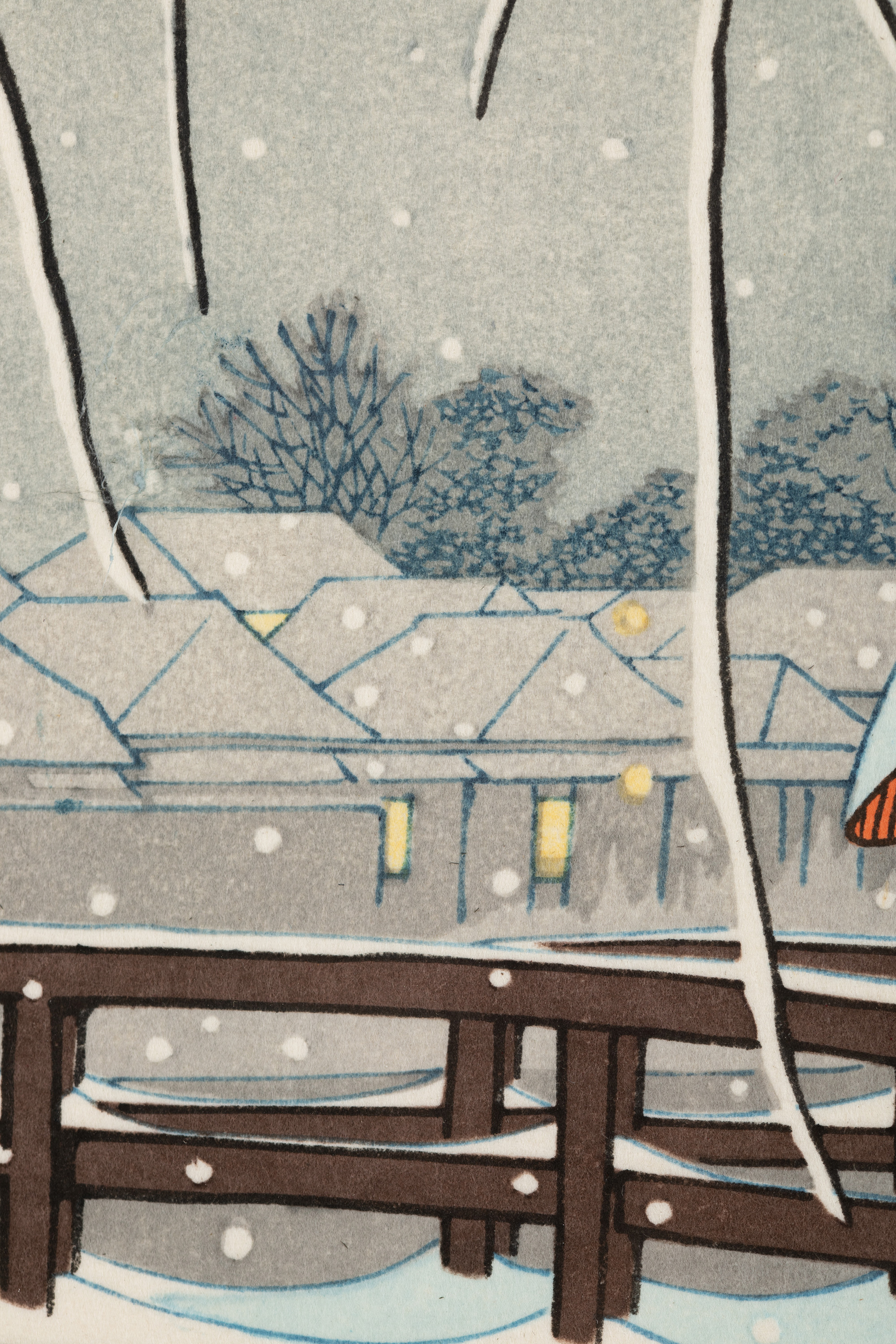 1932年日本昭和时代著名国宝级大师川濑巴水签名创作新版画《暮るる雪(江户川)》