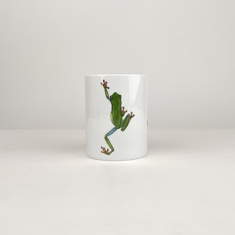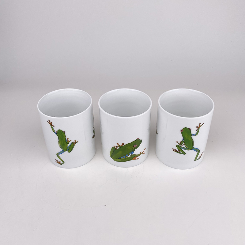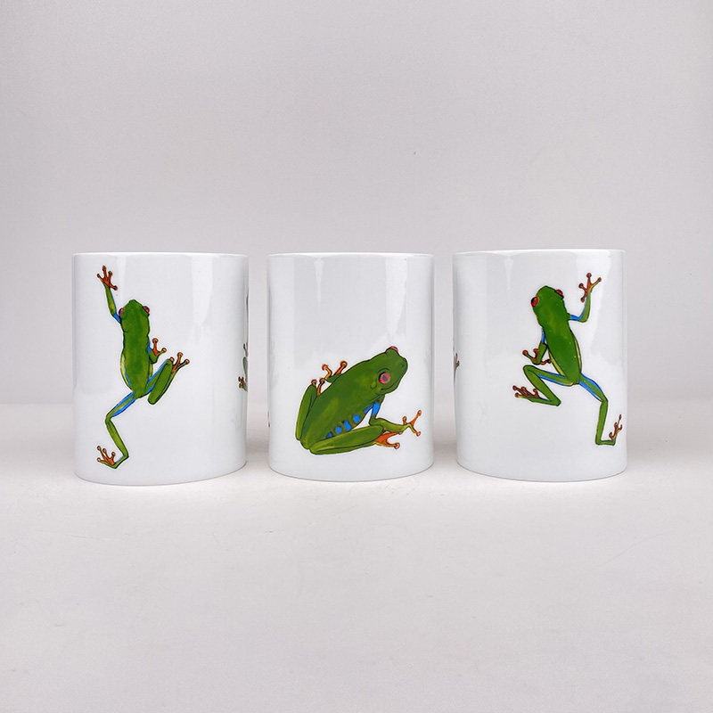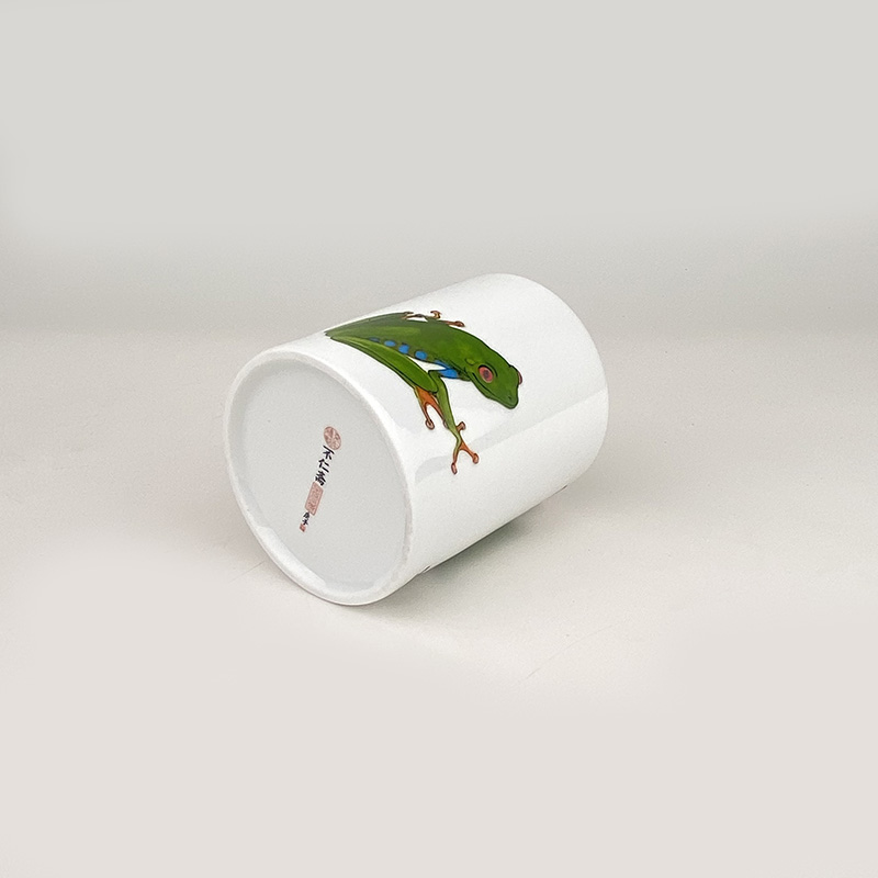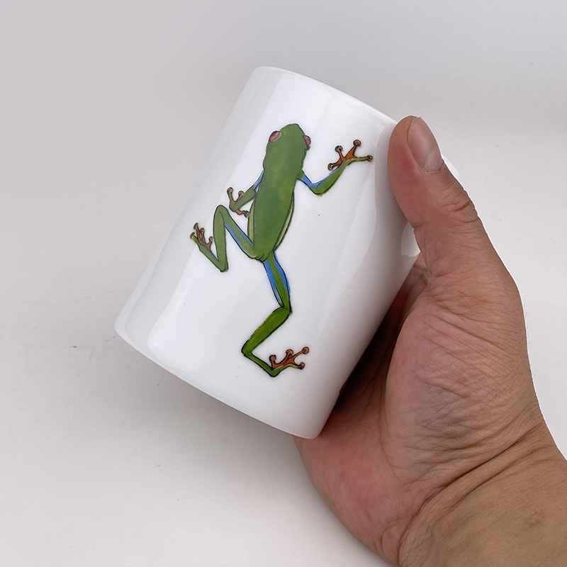不仁斋新款无把马克杯为不仁斋专有模具生产,景德镇高白瓷泥1300度烧制,无把的设计独特,摆放美观,红眼树蛙款由薛继业老师专门为这款无把马克杯绘制,三面三只动作不同的红眼树蛙,哪个角度都十分有趣可爱。高:11cm直径:9cm(尺寸比一般马克杯略大)