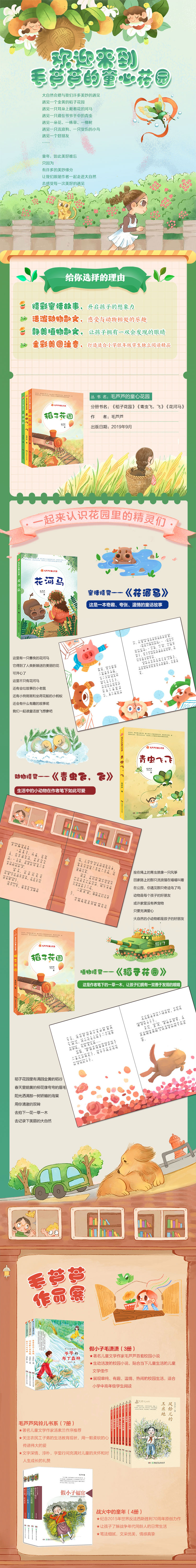 “毛芦芦的童心花园”是针对小学低年级学生打造的注音版故事集。作者心思细腻,观察事物细致入微,更擅长以充满情感的文字抒发对大自然万物的热爱之情。全系列包括《花河马》《青虫飞,飞》《稻子花园》三册,分别为想象奇特的童话、充满童真的动物散文和生机勃勃的植物散文,不一样的题材带来不同的阅读体验,能丰富读者的阅读感受。