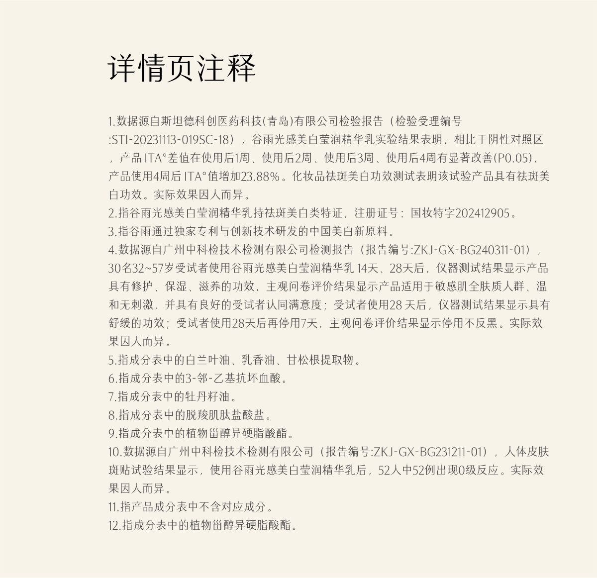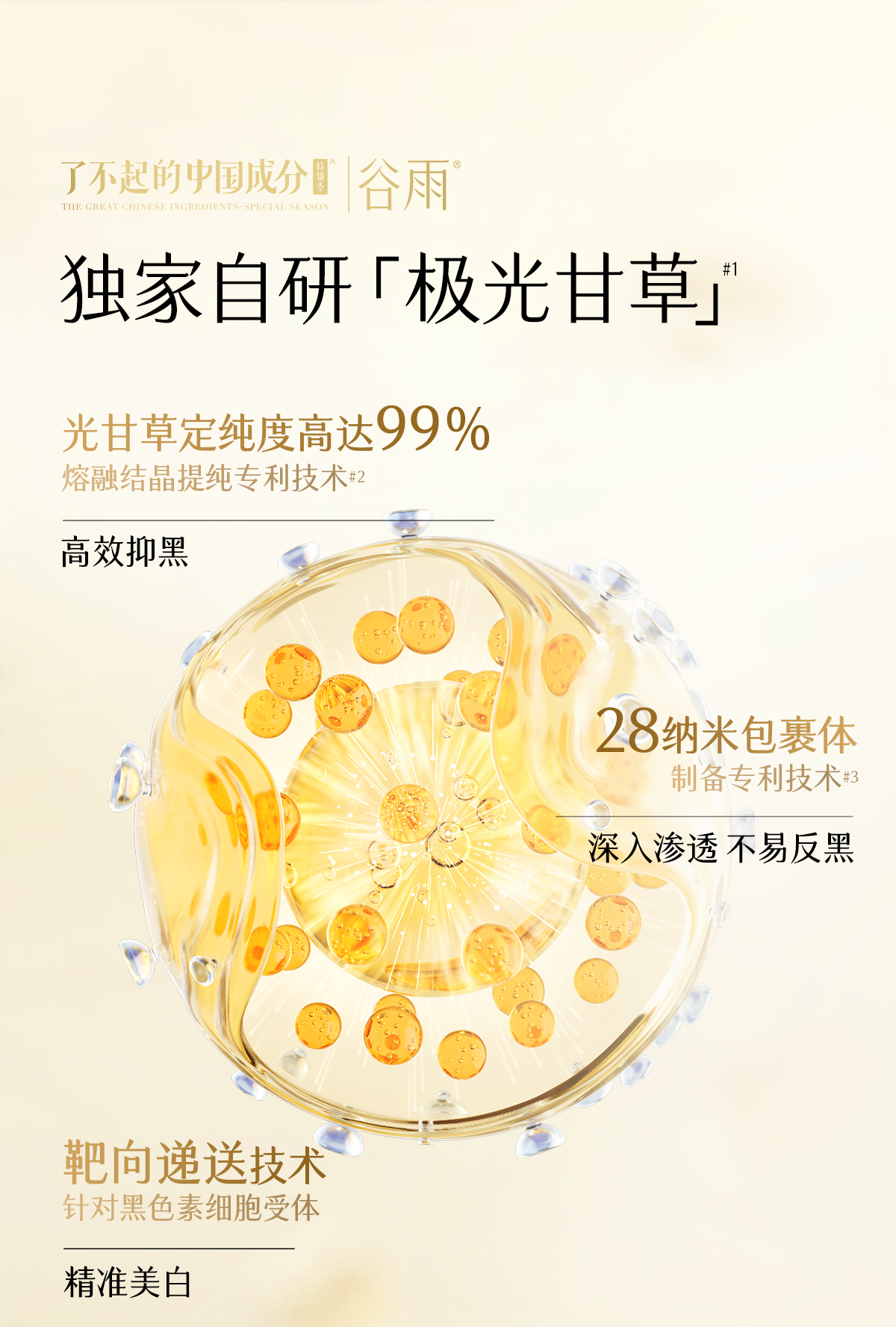 - 谷雨,更适合中国人肤质的植萃美白。专研中华珍稀美白植萃光甘草定,深入研究中国人肤质特点,打造中国女性独有的仙气白。
