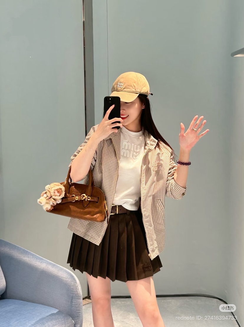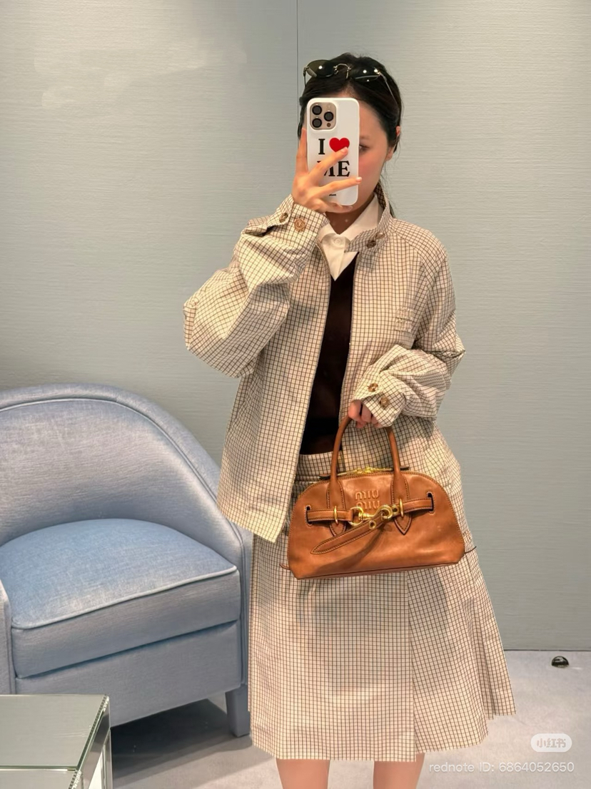 miu今年也是照着26流行色去搬的,低饱和度的沙色细格子,非常的清新复古时髦,文艺中性复古的风格,加上时髦的小立领,可以系上,可以解开,更多时髦的可塑性。