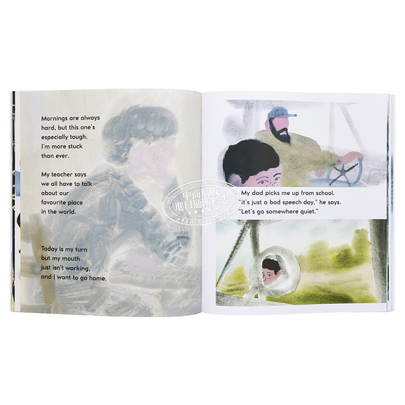 在被问到不能说话和被盯着看的一天之后,一个男孩和他的父亲去河边安静了一段时间。“这只是一个糟糕的演讲日,”爸爸说。但男孩无法停止思考所有看着他的嘴唇扭曲和旋转的眼睛。当他的父亲指着河流冒泡、翻腾、旋转和撞击时,男孩找到了一种思考自己说话方式的方法。连河水都断断续续。喜欢他。“我说话像一条河,”他说。