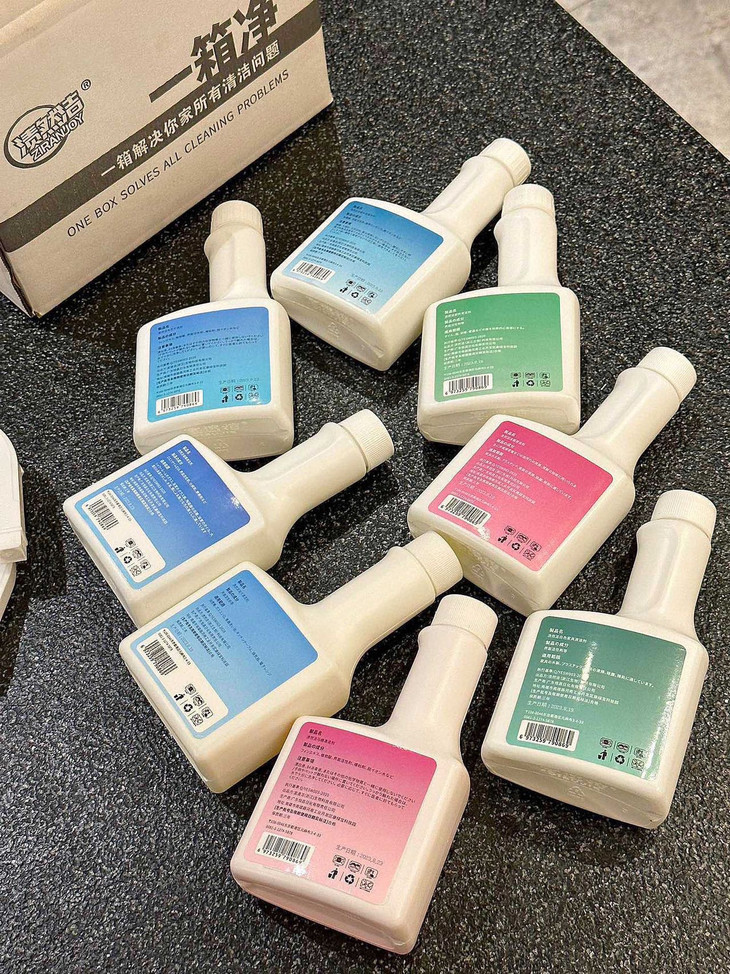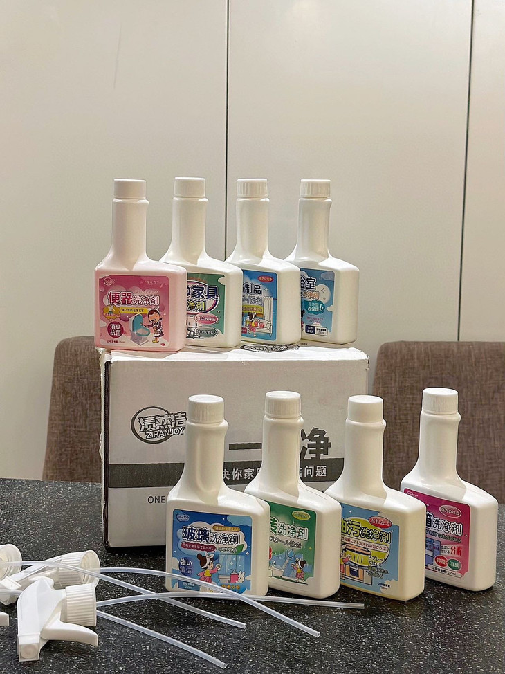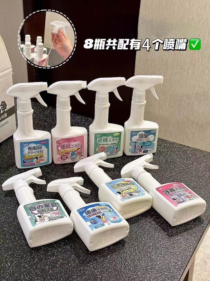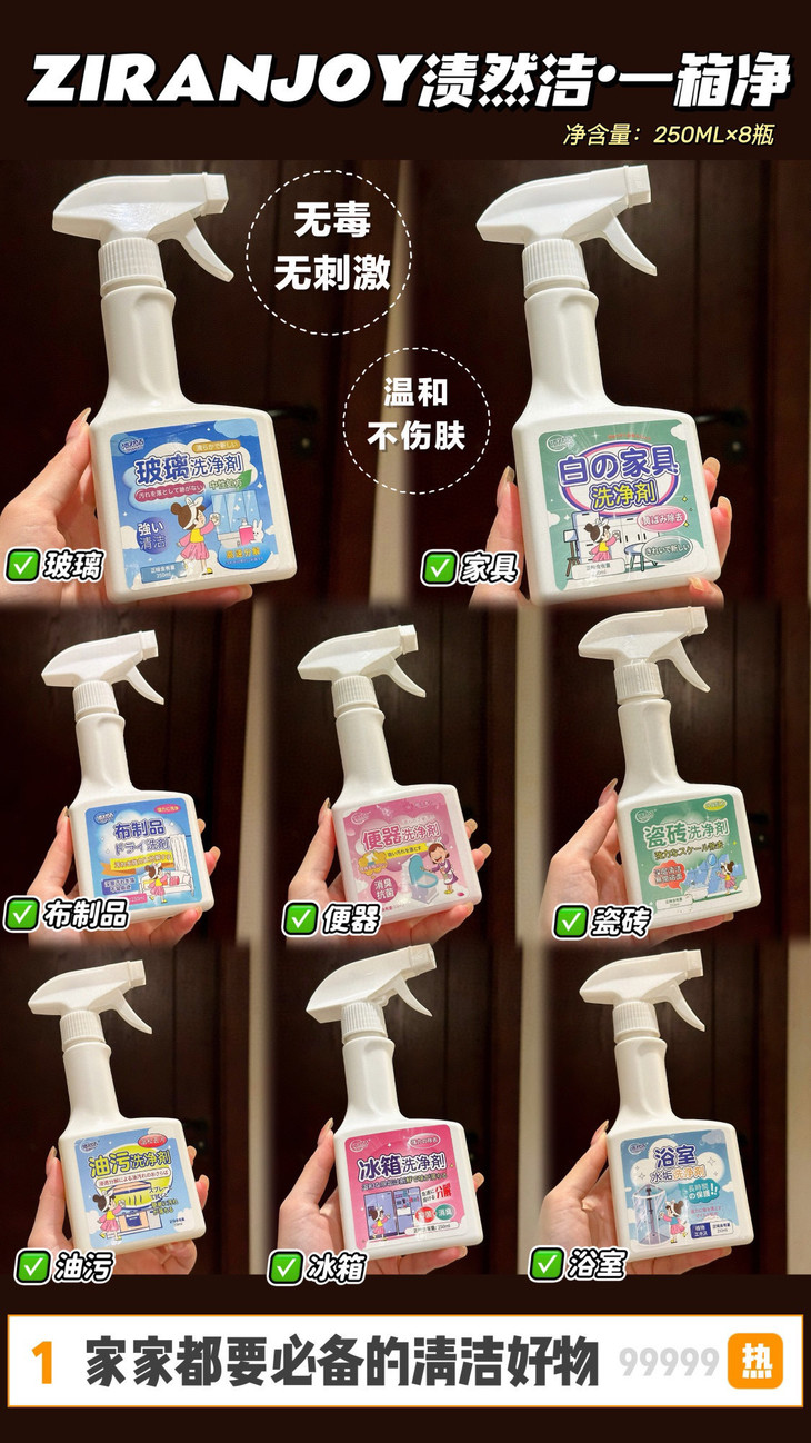 【ZIRANJOY渍然洁·一箱净】 玻璃洗净剂,家具洗净剂,布制品洗净剂 便器洗净剂,瓷砖洗净剂,油污洗净剂 冰箱洗净剂,浴室洗净剂 8瓶共配有4个喷头
