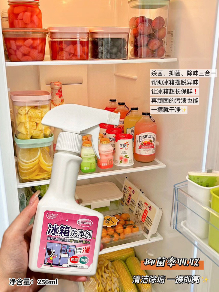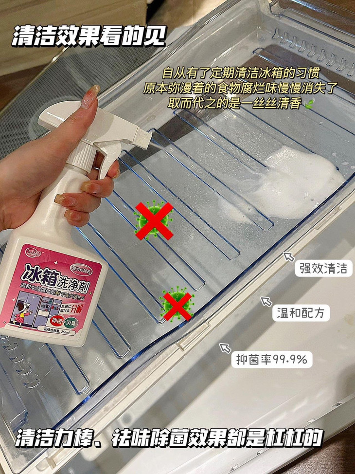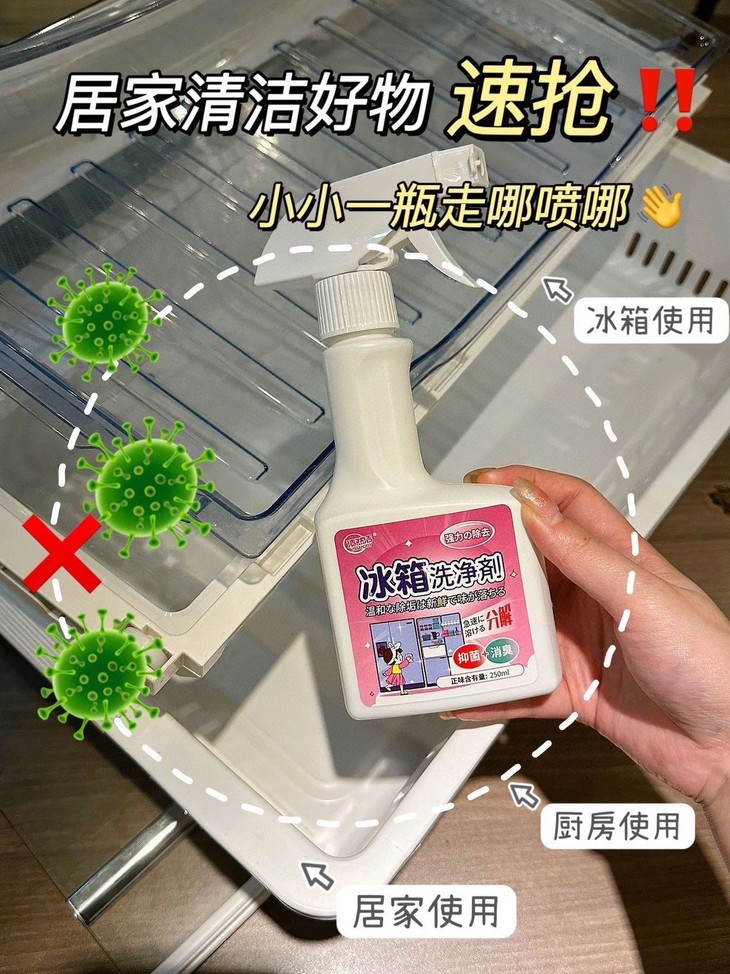▪️冰箱洗净剂 ⚠️⚠️⚠️你的冰箱在告急‼ ❌打开冰箱异味扑面而来 ❌新鲜蔬果放不久就蔫了 ❌食物窜味冰箱里湿哒哒 冰箱出现这些情况就是在提醒你 该使用冰箱洗净剂了!! 避免危害身体健康,影响冰箱效用! ✅杀菌✅去异味✅清洁