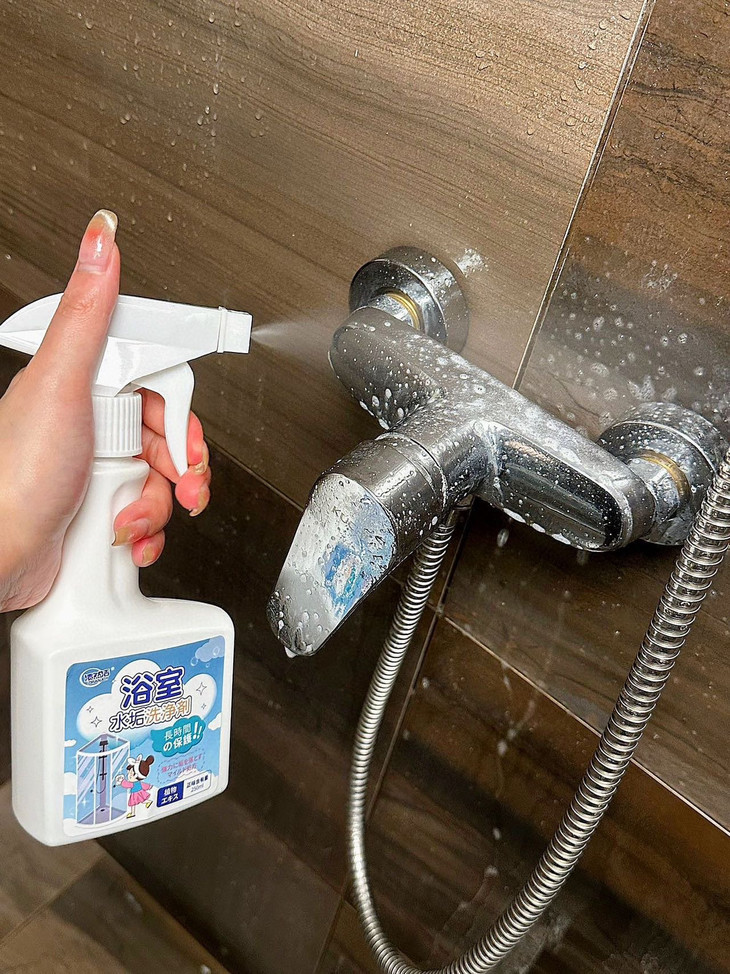 直接喷在洗手池台面上、 水龙头上,淋浴间玻璃门上、 墙壁上、地板上... 停留片刻后用水冲净, 又是一个崭新的浴室