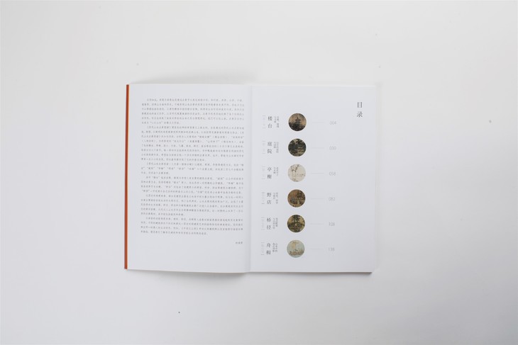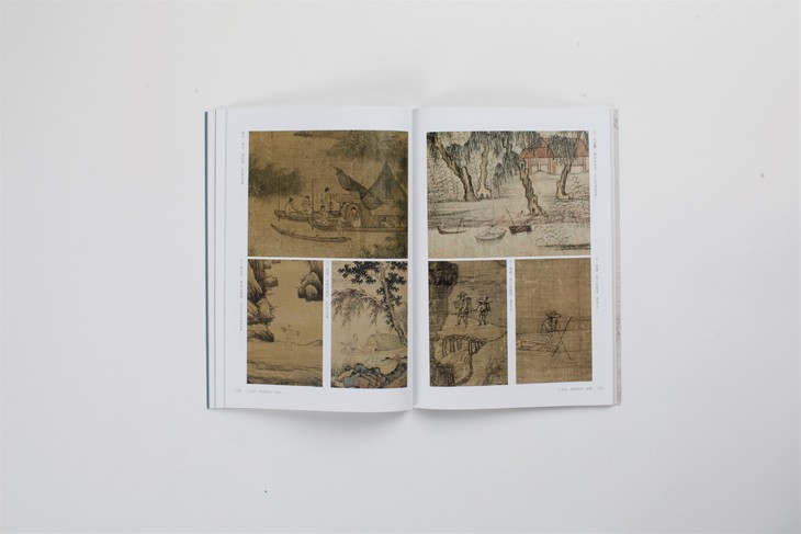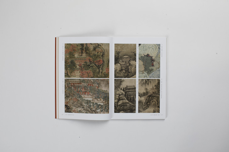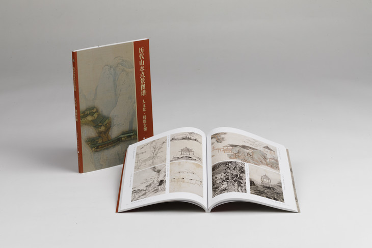 《历代山水点景图谱·人文景·楼阁台榭》以建筑、桥梁、舟船等建筑为主,包括“楼台”“庭院”“亭榭”“野店”“桥径”“舟楫”六个点景主题,共收录约三百七十余幅经典作品、四百余个点景局部。其中“楼台”包括宫殿、楼阁与寺观三类主要的建筑点景。“庭院”以山中的院落与园林点景为主,收录规模较“楼台”更小,但也具有一定规模的山中建筑。“亭榭”集中选取各类亭子与水榭。“野店”则包含了规模更小的草堂、村舍、驿站等建筑与建筑群。至于“桥径”一节则展示各式各样的桥梁与山间小径,“舟楫”则是对山水画中各类舟船的总集。