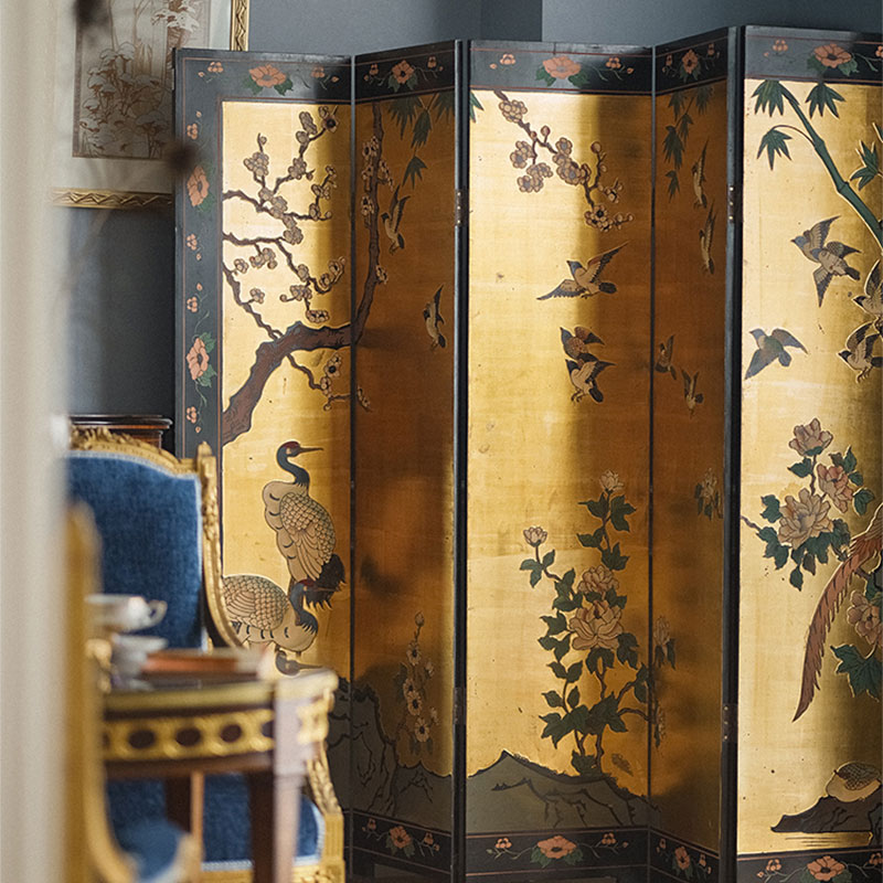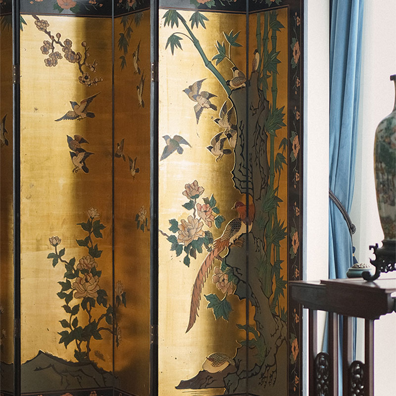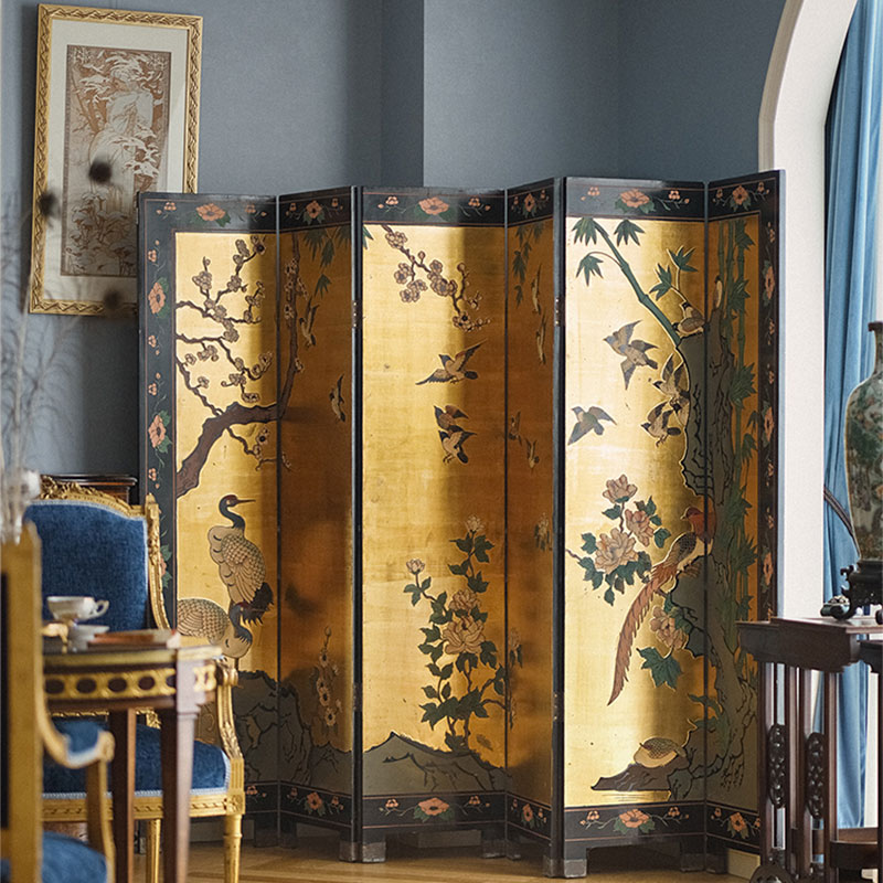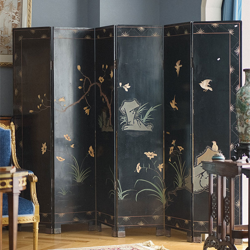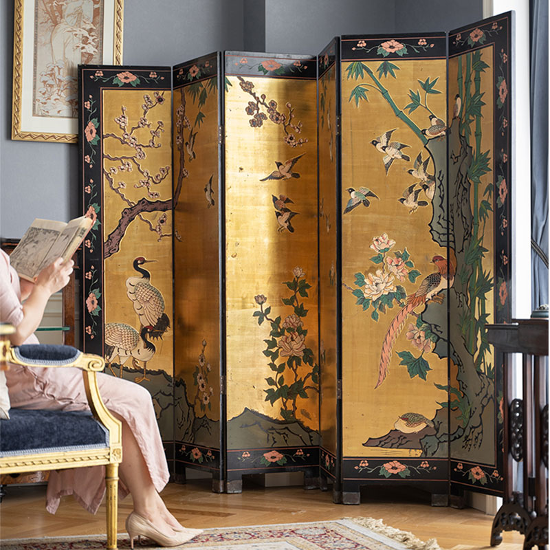 20世纪初中国出品「花开富贵」主题金地款彩雕漆六曲屏风