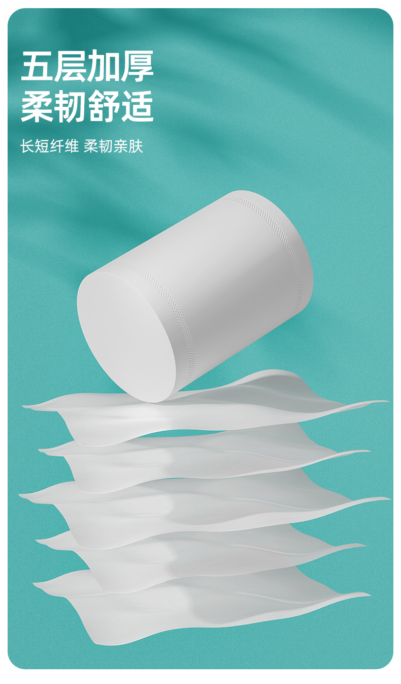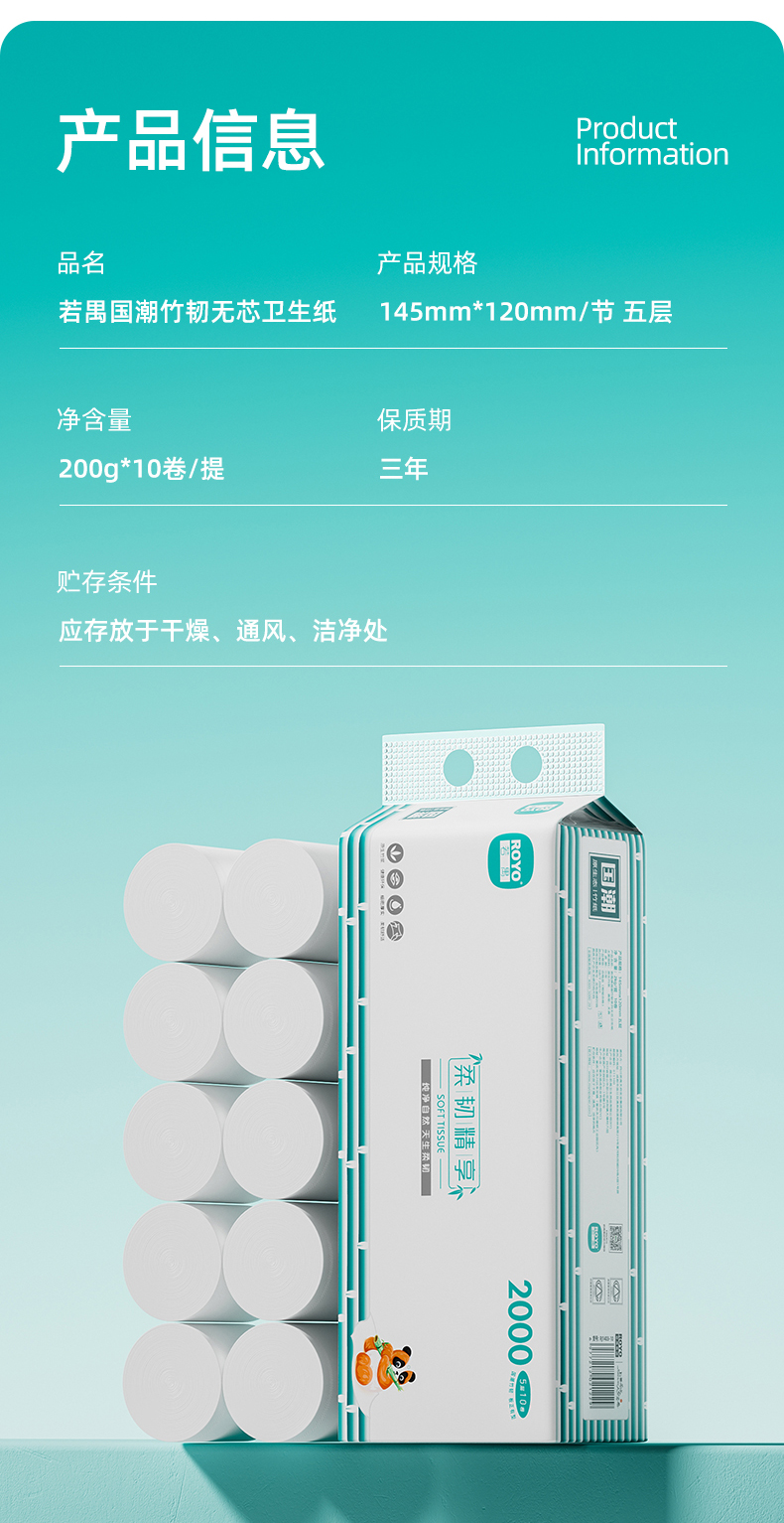 若禺无芯卷纸国潮竹韧系列5层加厚2000克/提原生竹浆圆卷1件10卷6提RJ1403