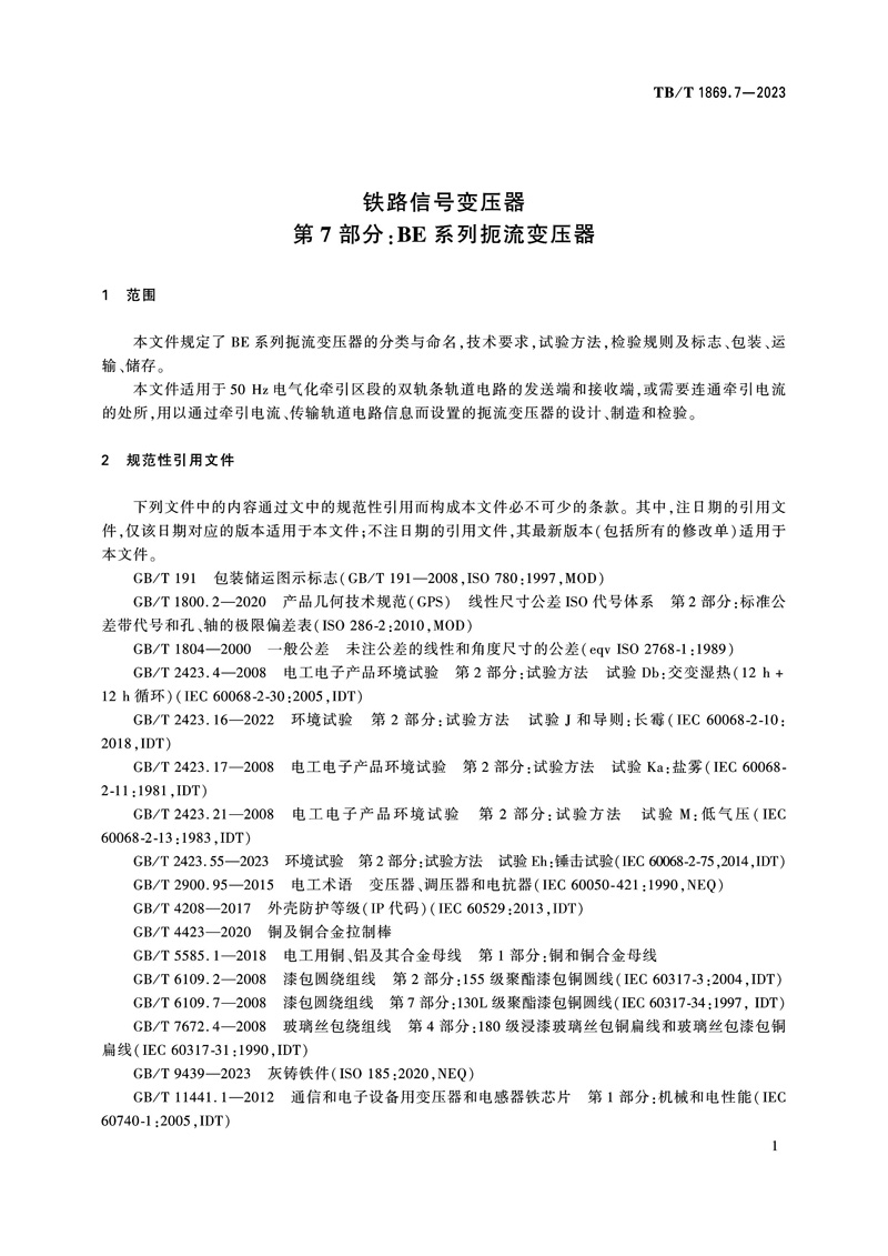 6922 铁路信号变压器 第7部分:BE系列扼流变压器(TB/T1869.7-2023)