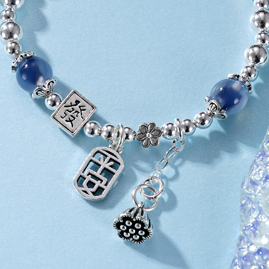 【寓意】:将晶莹剔透的糖心玛瑙精心雕琢,与纯银圆珠串联搭配,并点缀平安福牌和莲蓬小坠饰,整条手链洋溢着甜蜜气息。寓意美貌财富双收,值得入手。