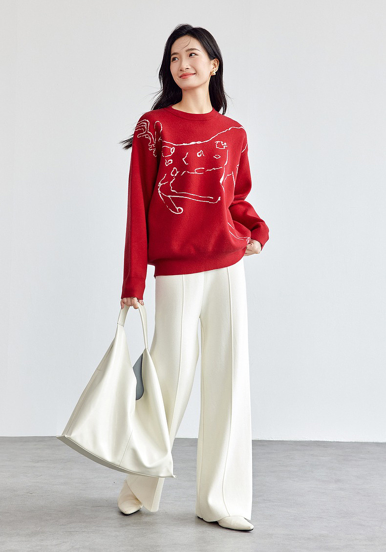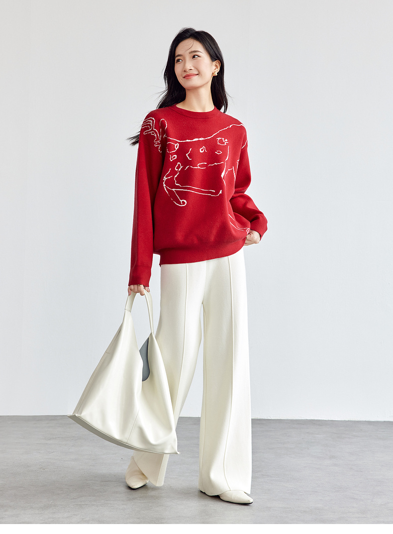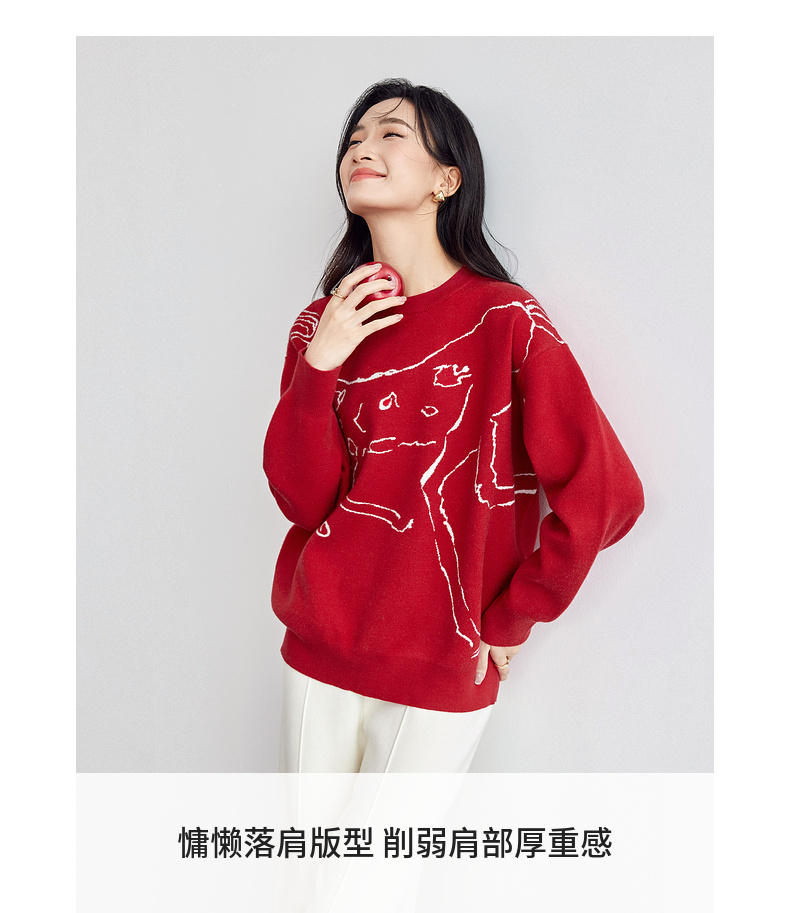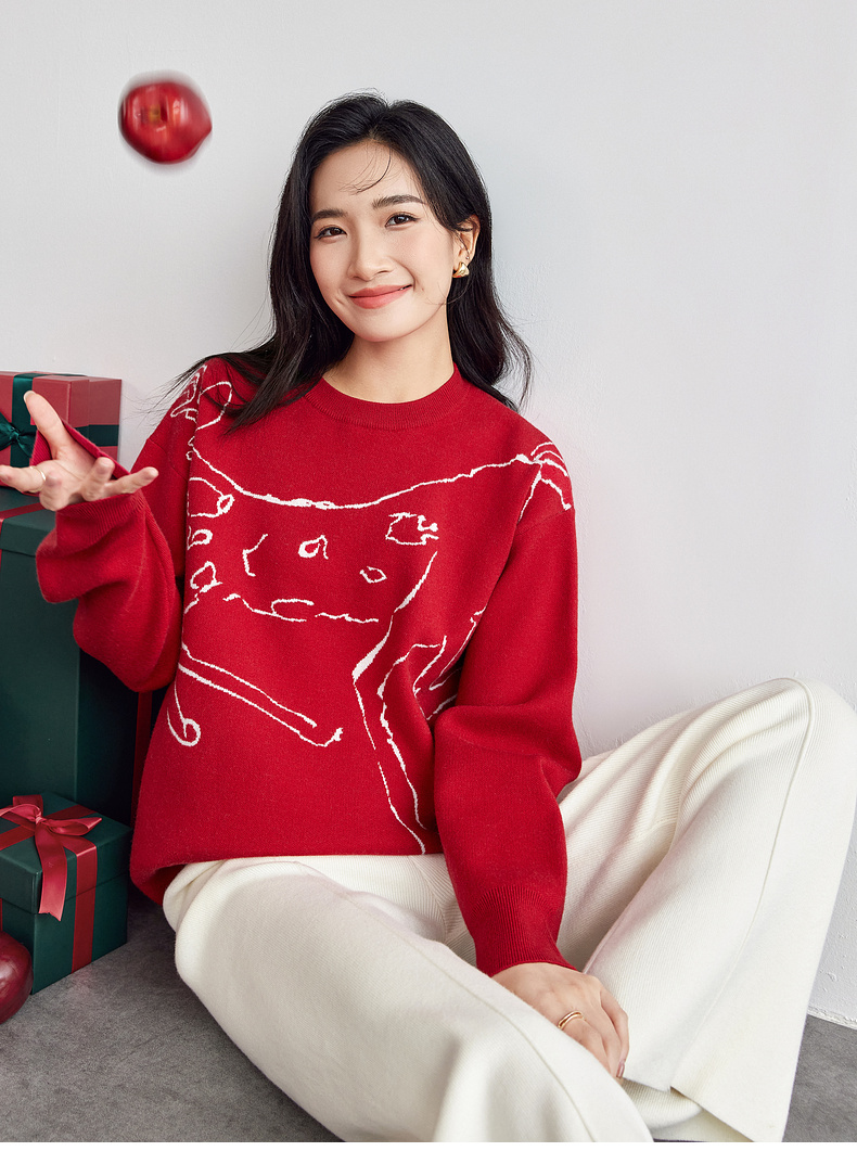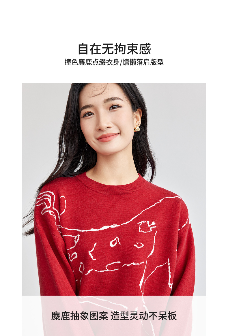 【内购】圣诞派对艺术手绘麋鹿圣诞新年氛围感慵懒宽松圆领套头毛衣-W51E58099