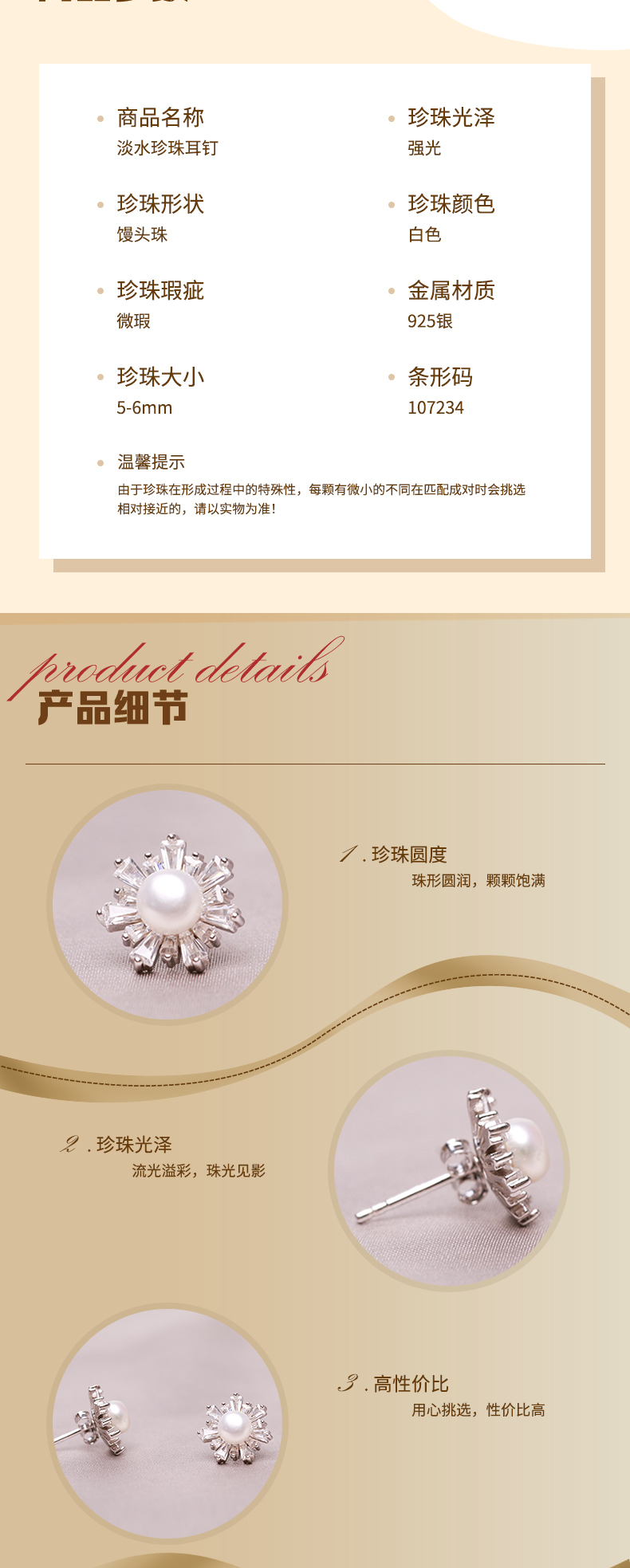 美裕 '银925淡水珍珠耳钉 '5-6mm白 107234