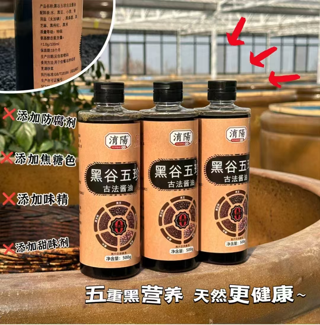 【黑谷五珍古法酱油】只用5种“黑色黄金”食材——黑豆、黑米、黑芝麻、黑桑葚、黑枸杞,古法酿造180天,真没有任何添加!