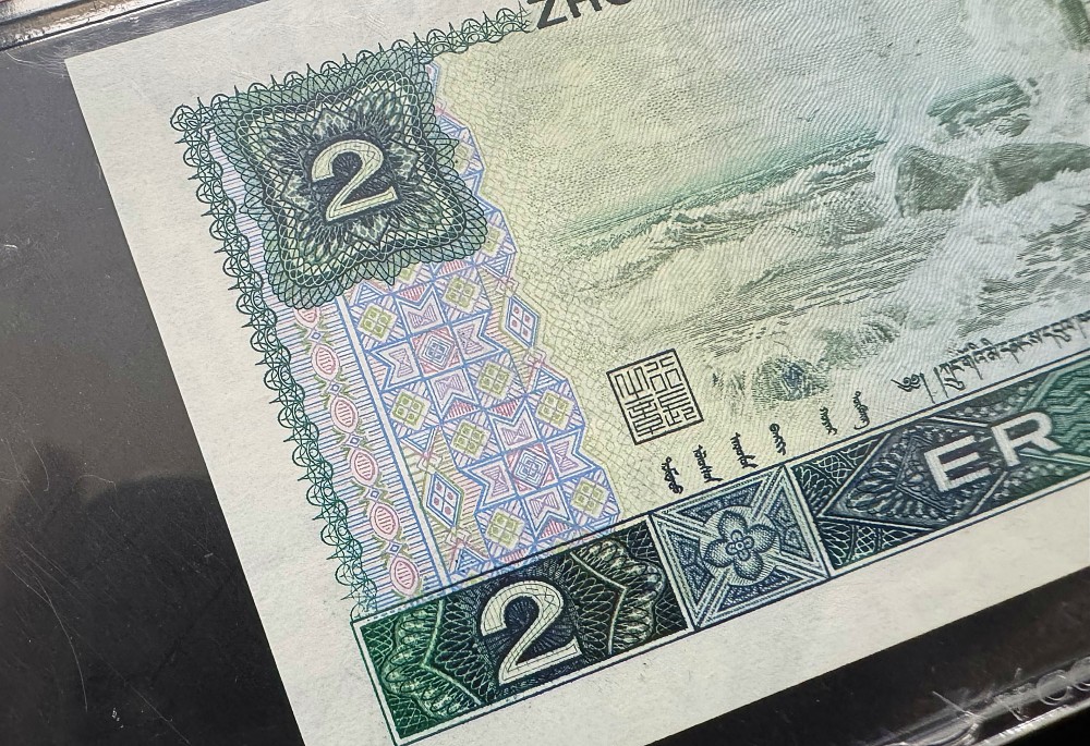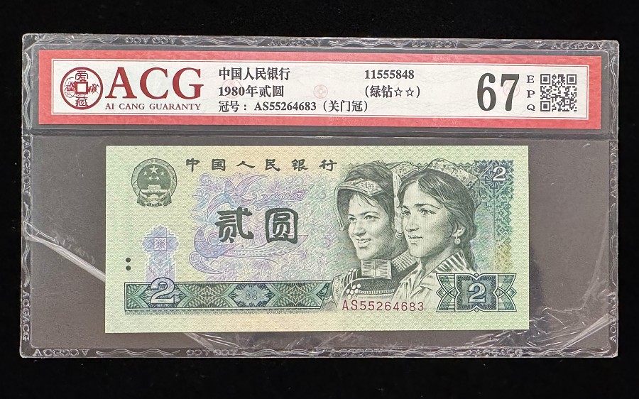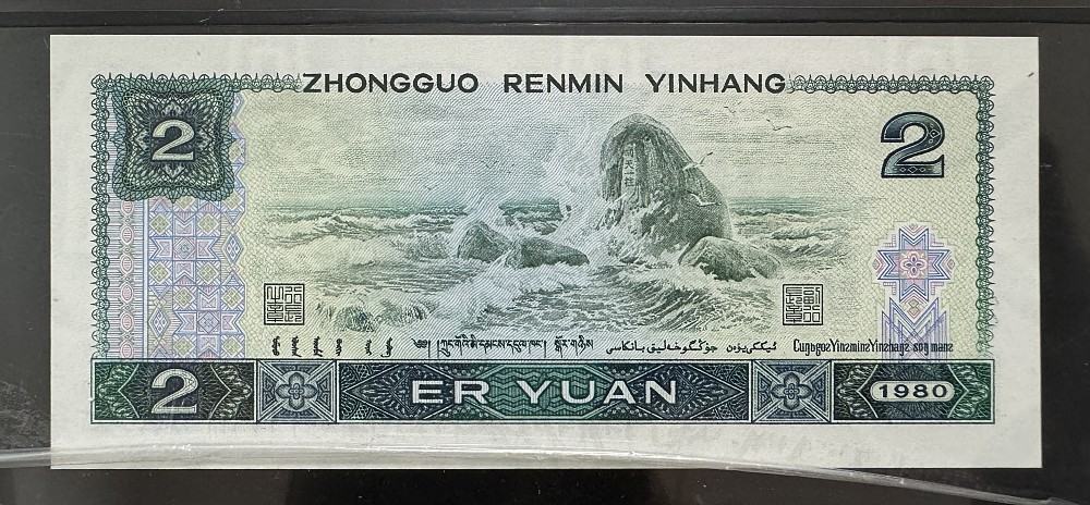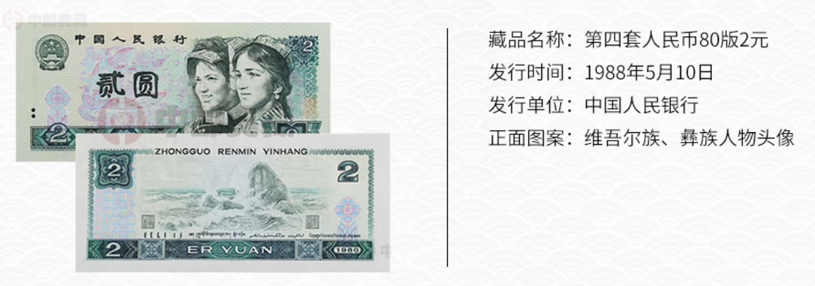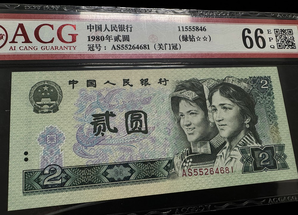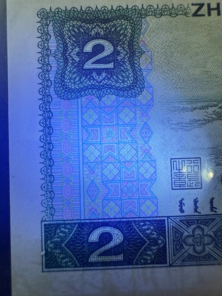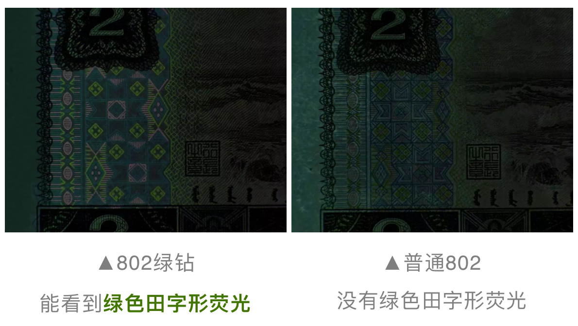 802“绿钻”,是1980年版2元纸币的特殊荧光版本,由于其在荧光灯下会呈现绿色“田“字形图案,看起来像一颗颗钻石而得名。