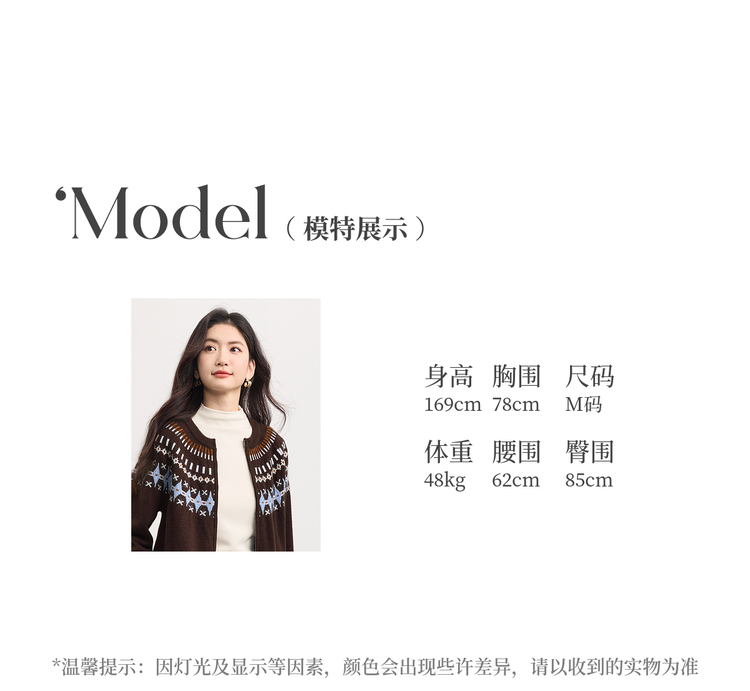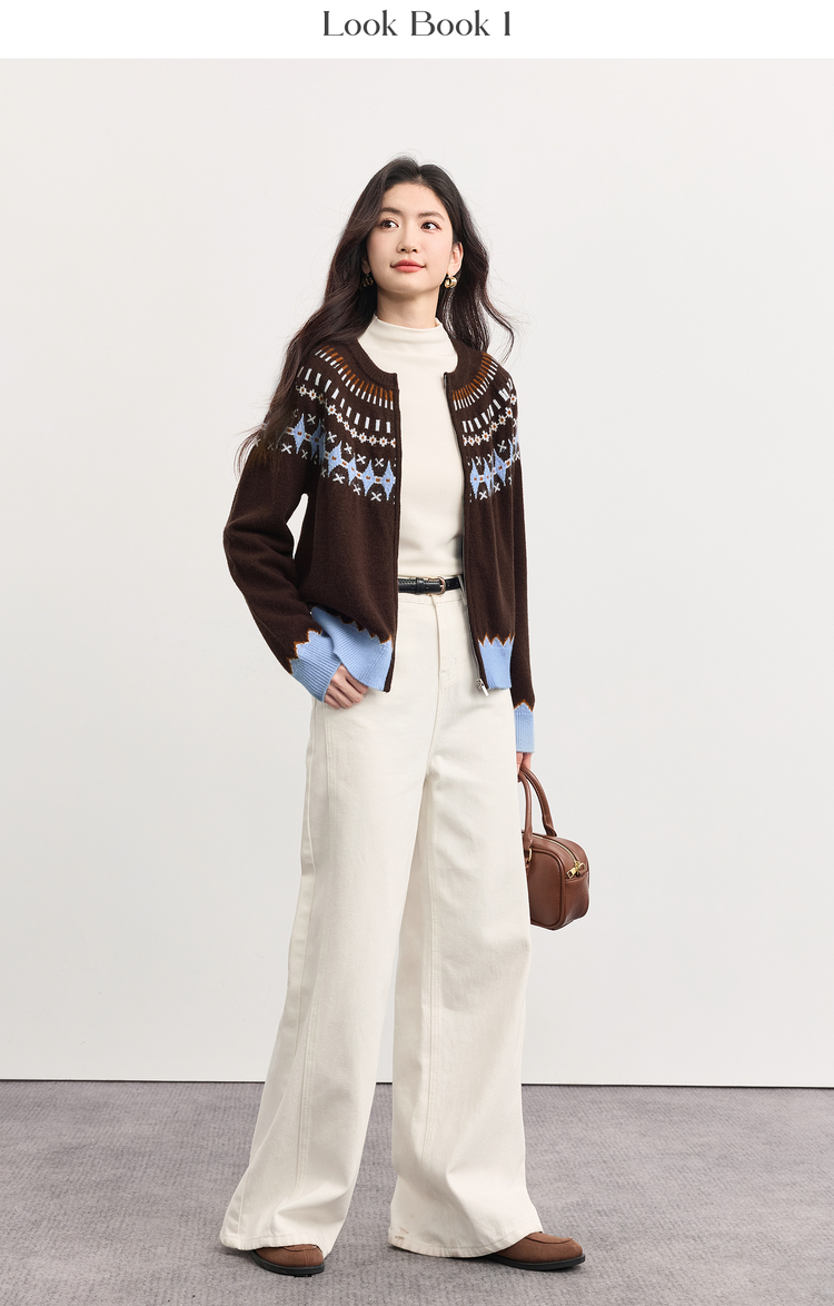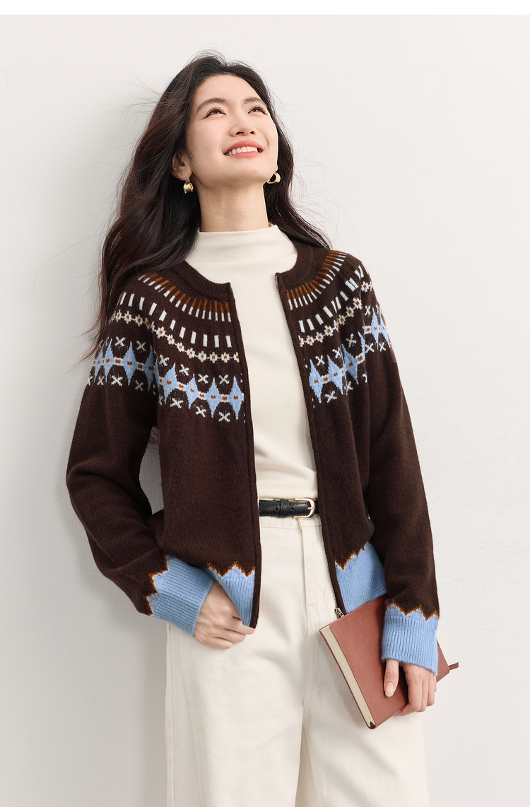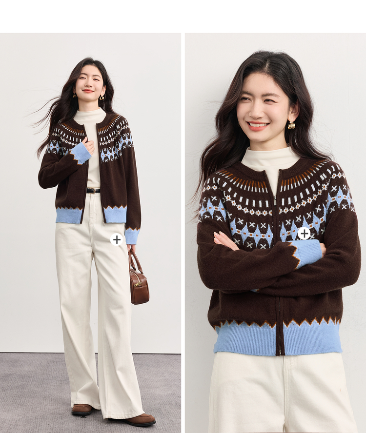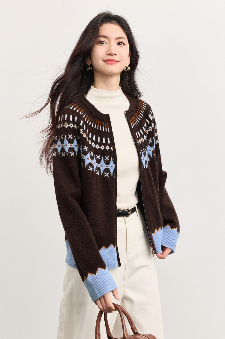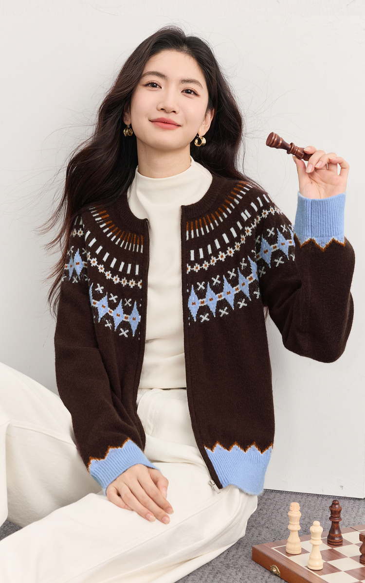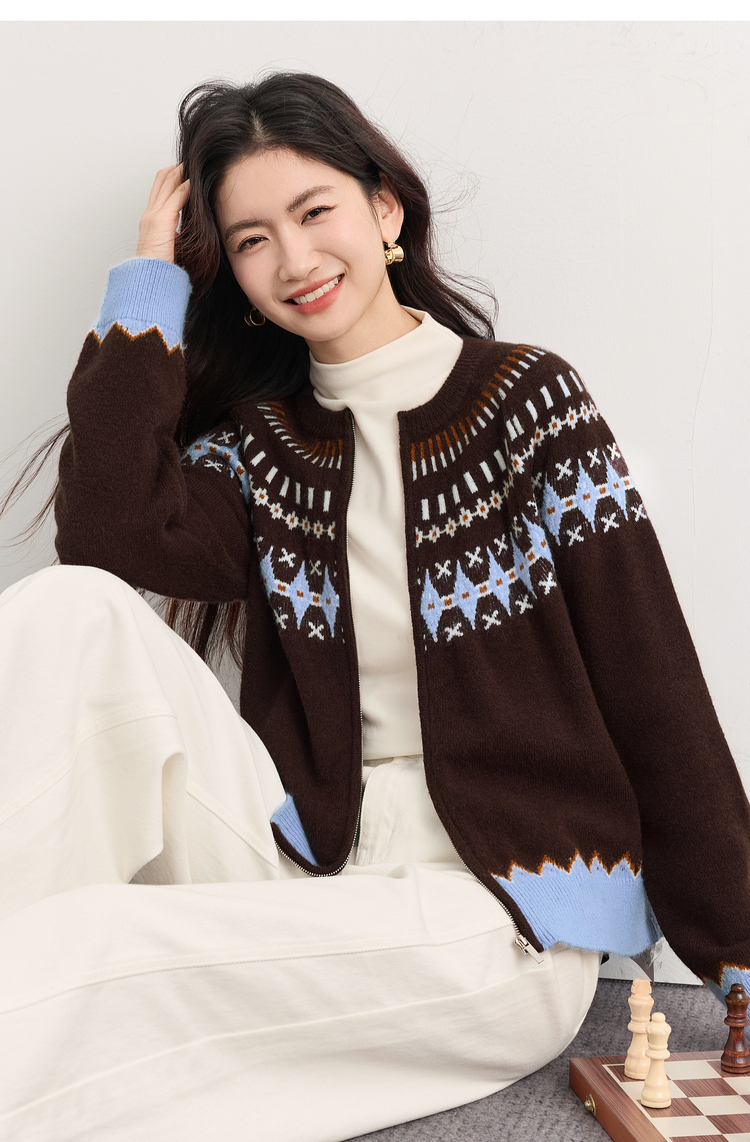 【10/23新品】熙世界费尔岛毛衣开衫女秋冬圆领复古提花拉链针织外套