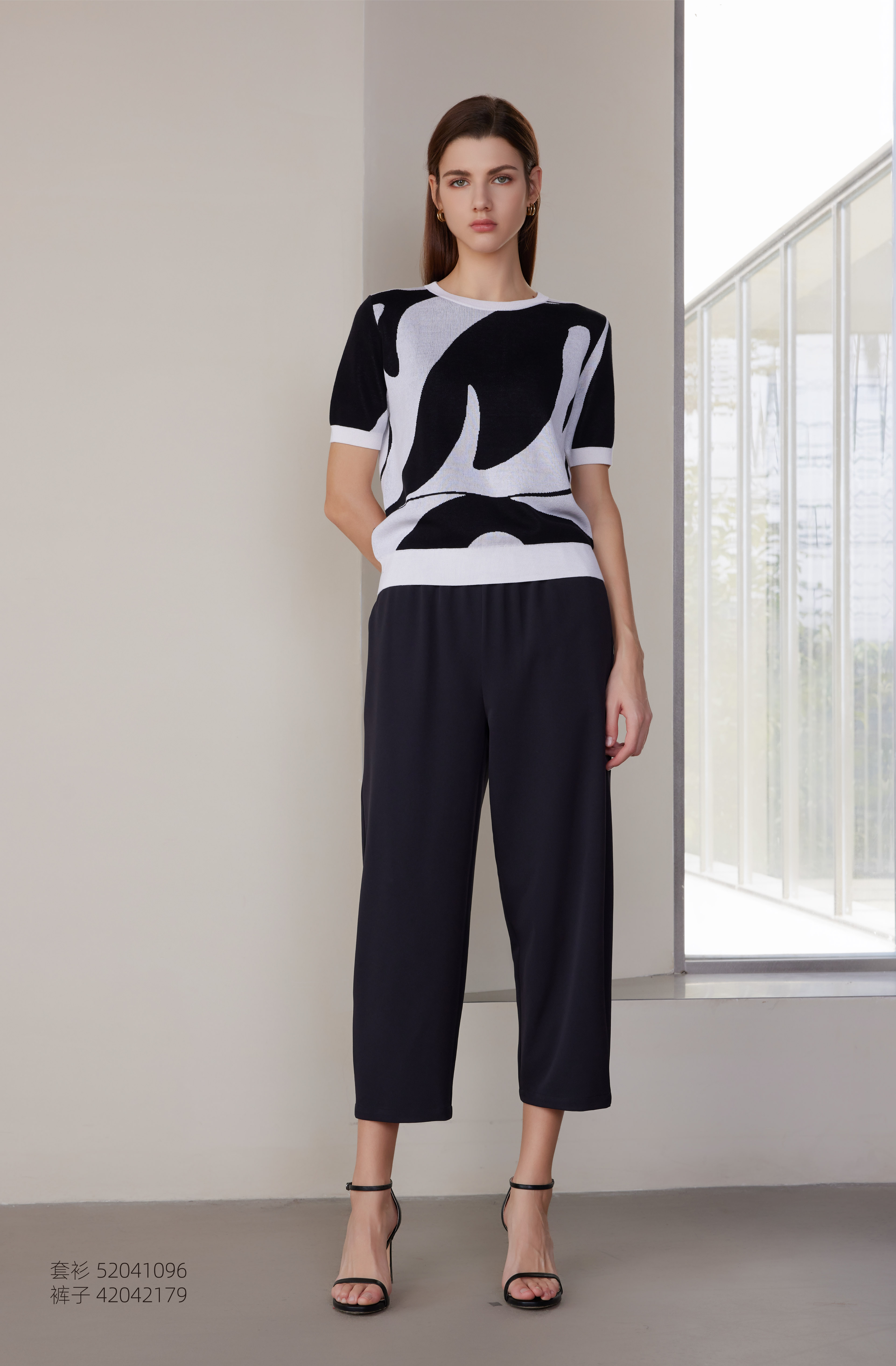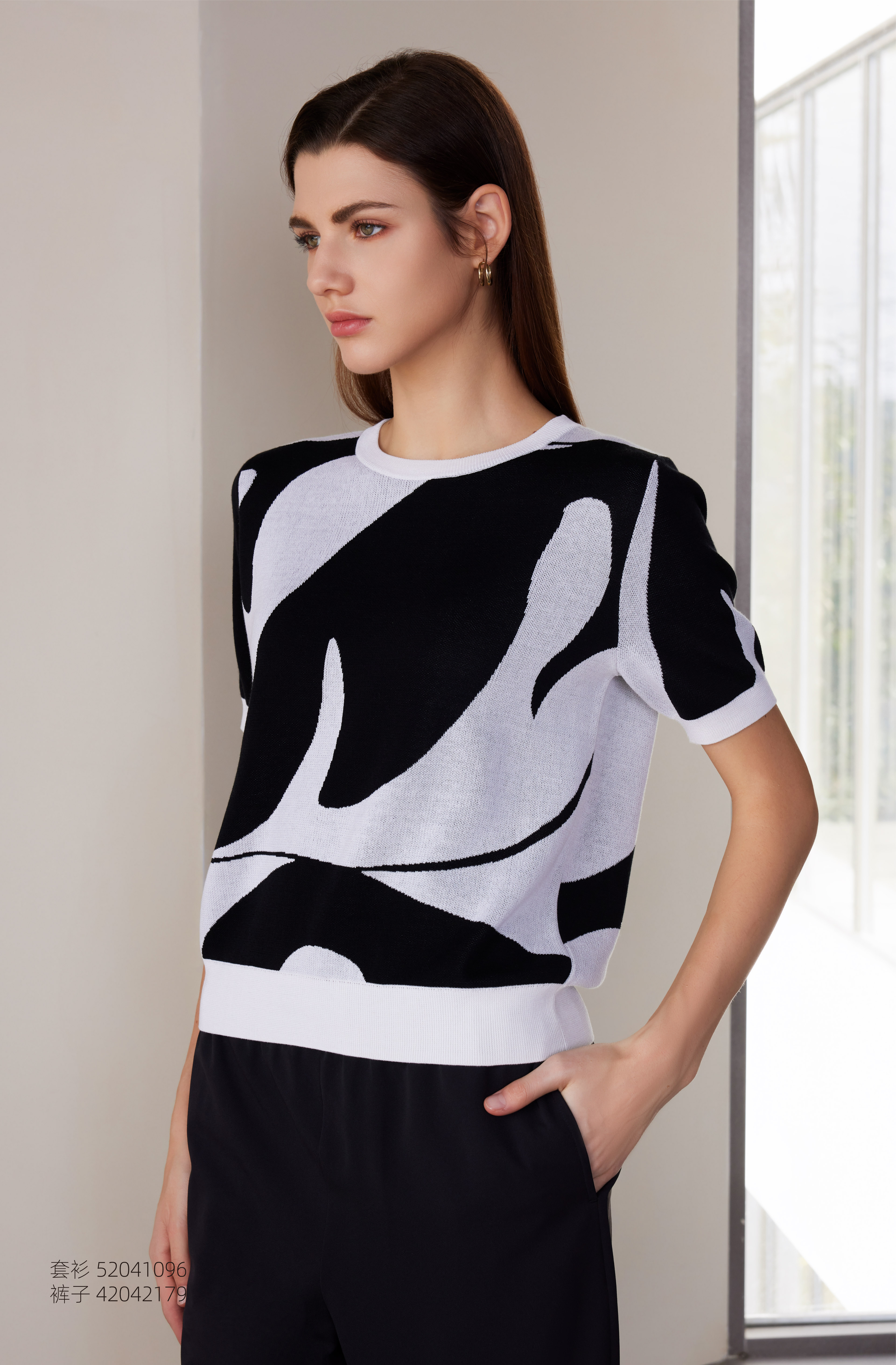 【圆领短袖针织套衫】24年春夏新品女士圆领短袖黑白花针织套衫