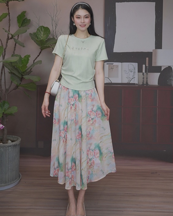 司歌刺绣印花连衣裙圆领短袖收腰优雅端庄A891054X