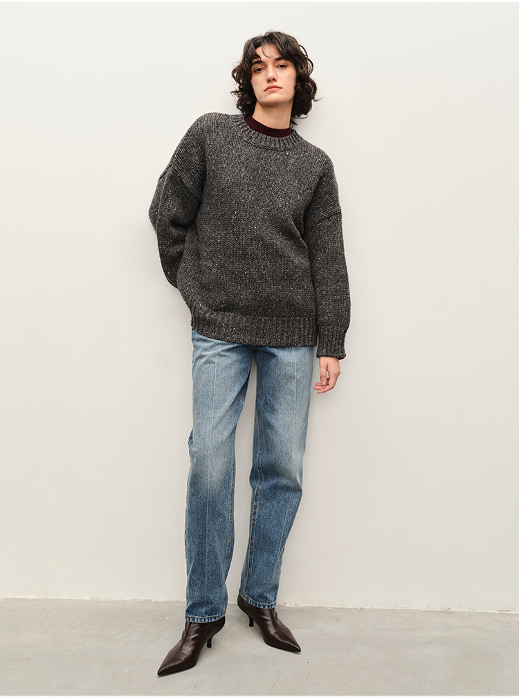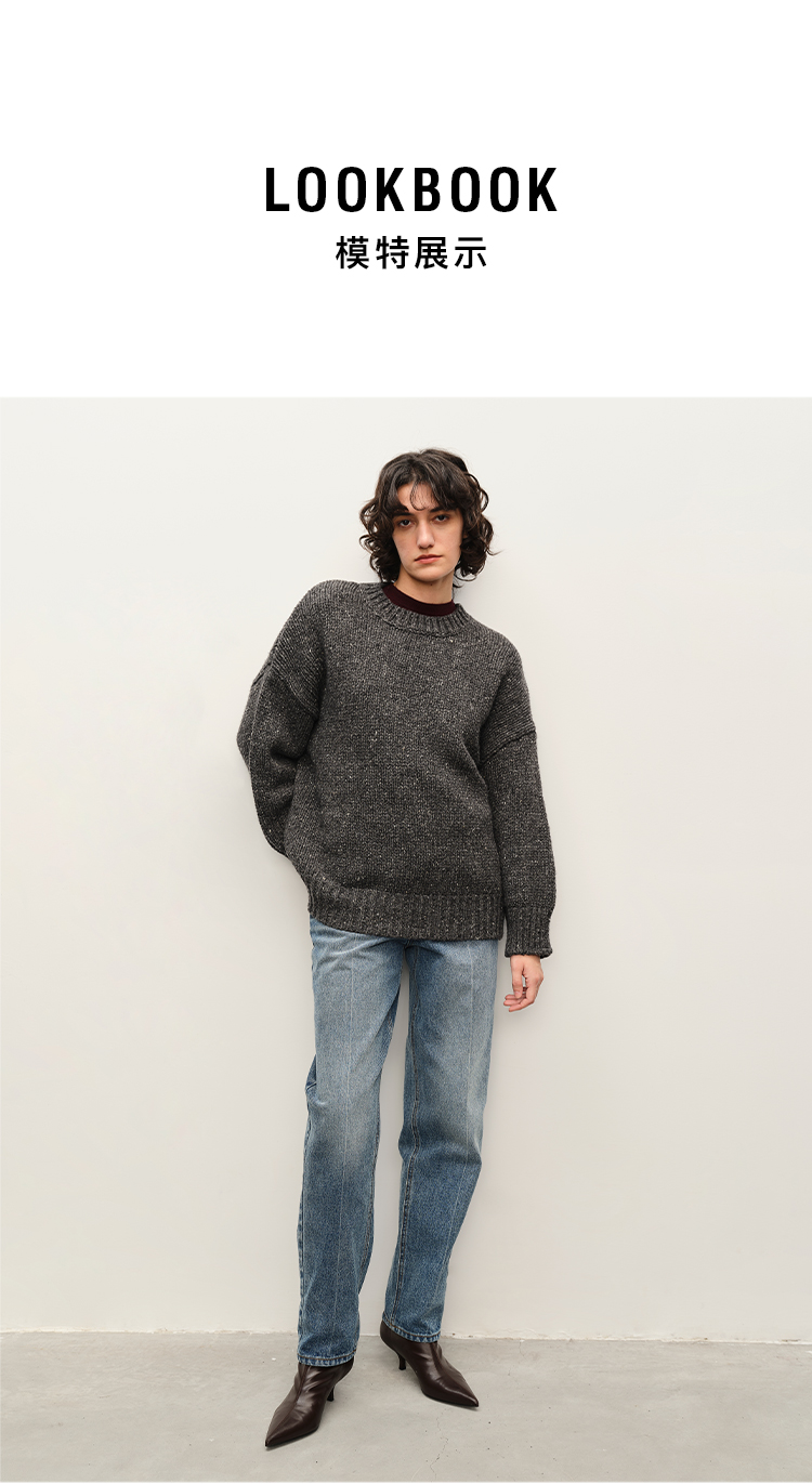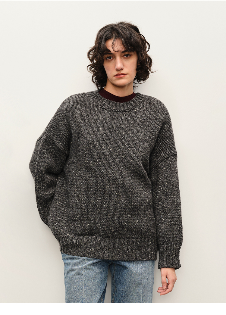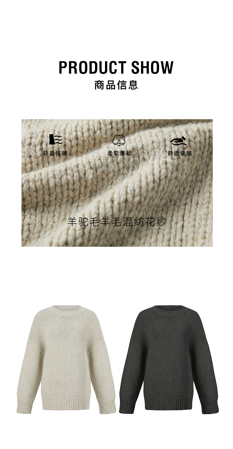 HIDEMI 极简大廓形圆领粗棒针羊驼毛羊毛混纺花纱宽松慵懒毛衣