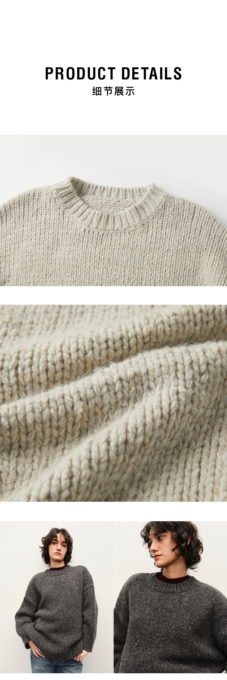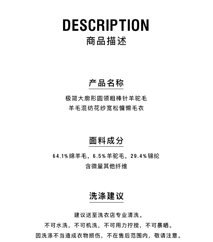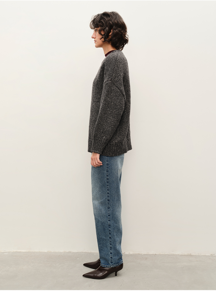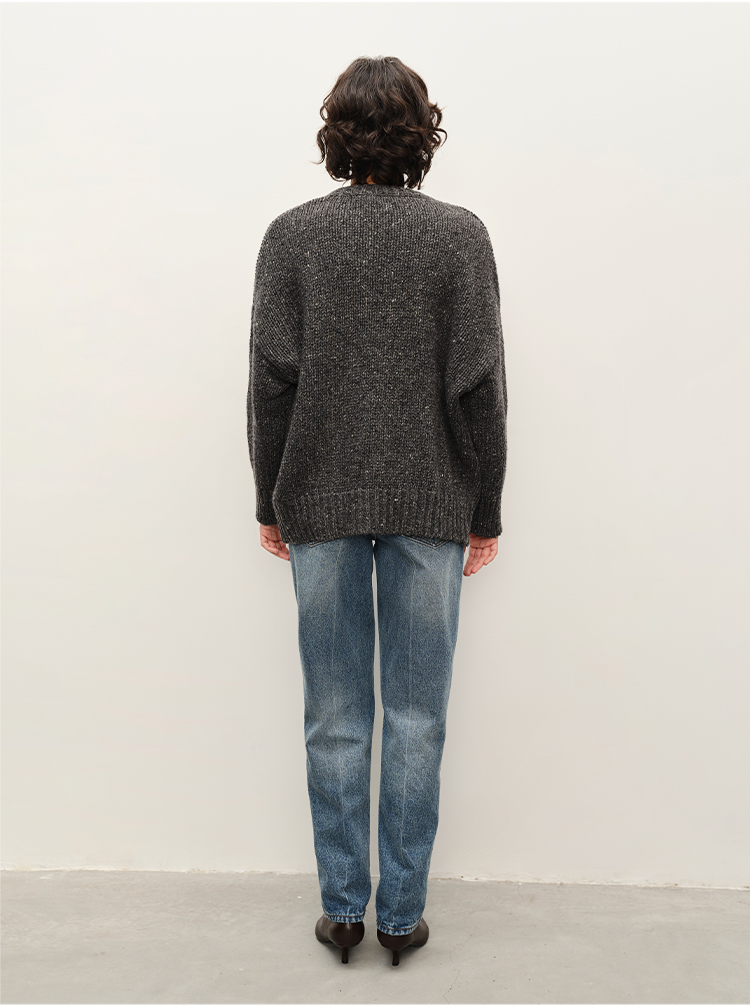 HIDEMI 极简大廓形圆领粗棒针羊驼毛羊毛混纺花纱宽松慵懒毛衣