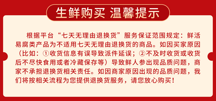【卖家提醒】签收后请尽快打开检查,如果有任何质量问题请在签收24小时内提供照片联系客服为您处理,谢谢。请留一个可以确保收货的地址,由买家自己的原因导致的延迟收货,出现产品变质卖家不处理售后。有特殊收货时间要求的,例如周六日无法收货,请拍下留言告知或者请联系客服确认下,谢谢!不留言的发出后不支持退货敬请谅解。