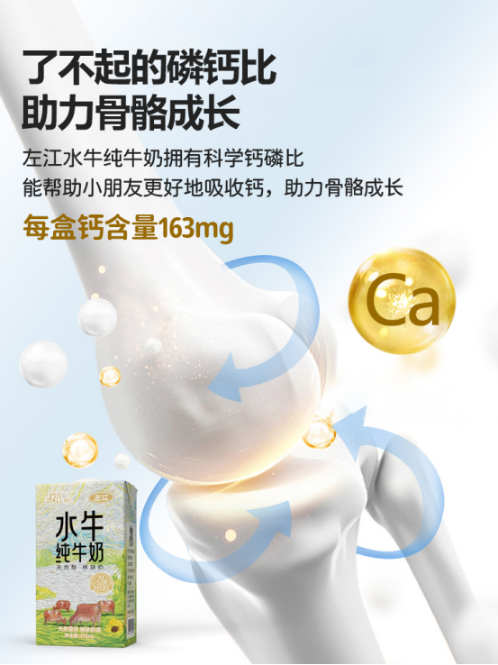 咱们的左江A2水牛纯牛奶在营养这方面肯定是“奶界尖子生”啦! 每盒水牛奶含5.0g优质蛋白、163mg原生高钙。 远远高于欧盟标准!