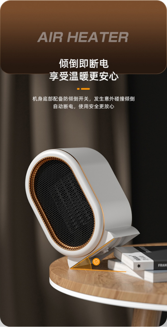 倾倒即断电 享受温暖更安心 机身底部配备防倾倒开关, 发生意外碰撞倾倒自动断电,使用安全更放心!