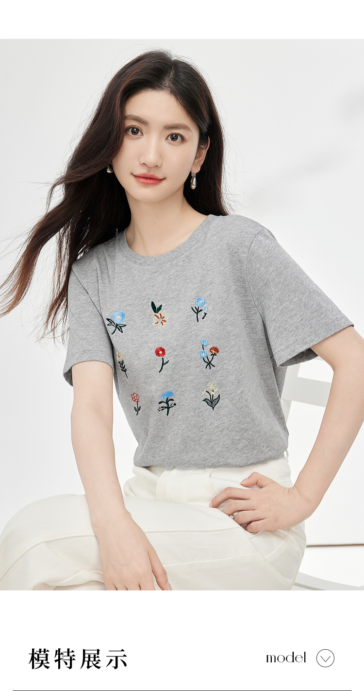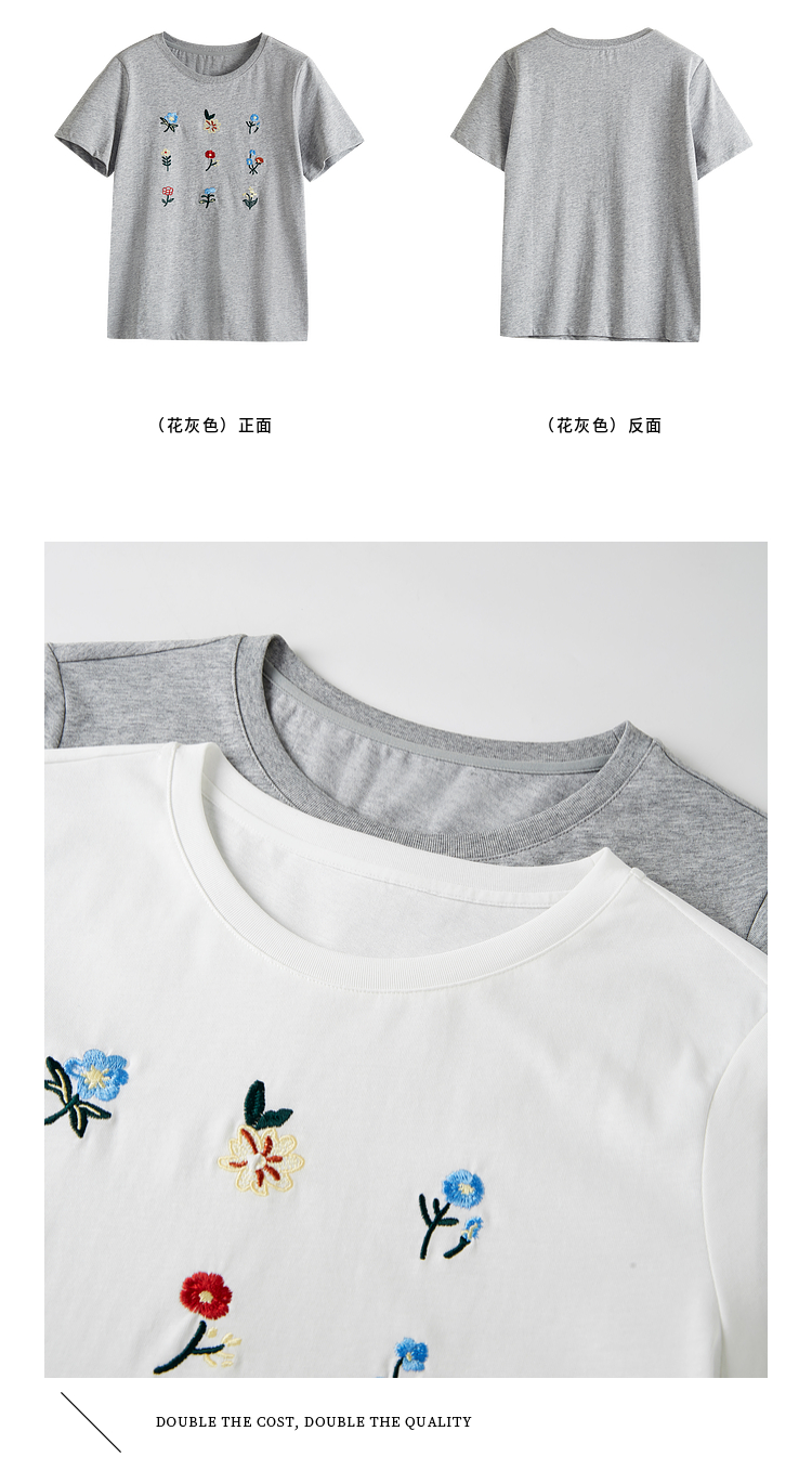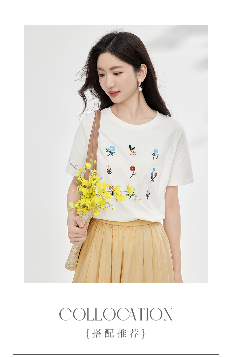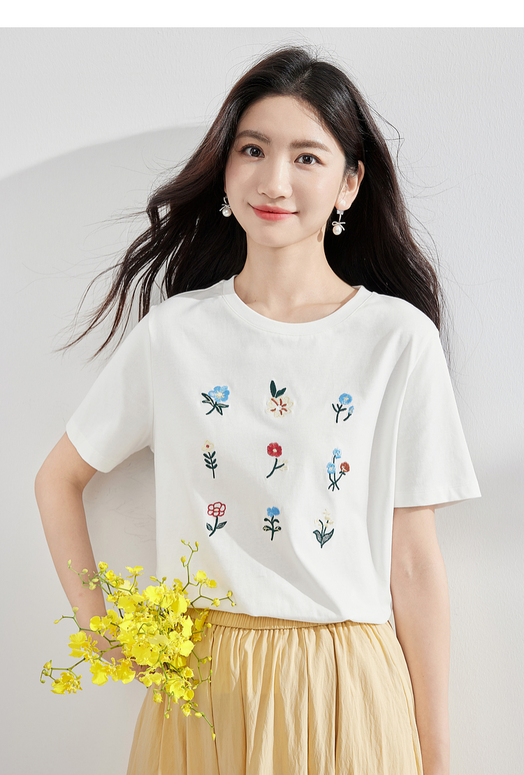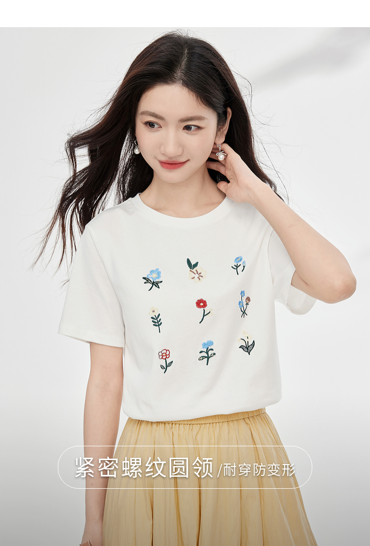 【专属特价】熙世界田园风刺绣花朵T恤短袖女夏新款清新时尚正肩圆领纯棉上衣