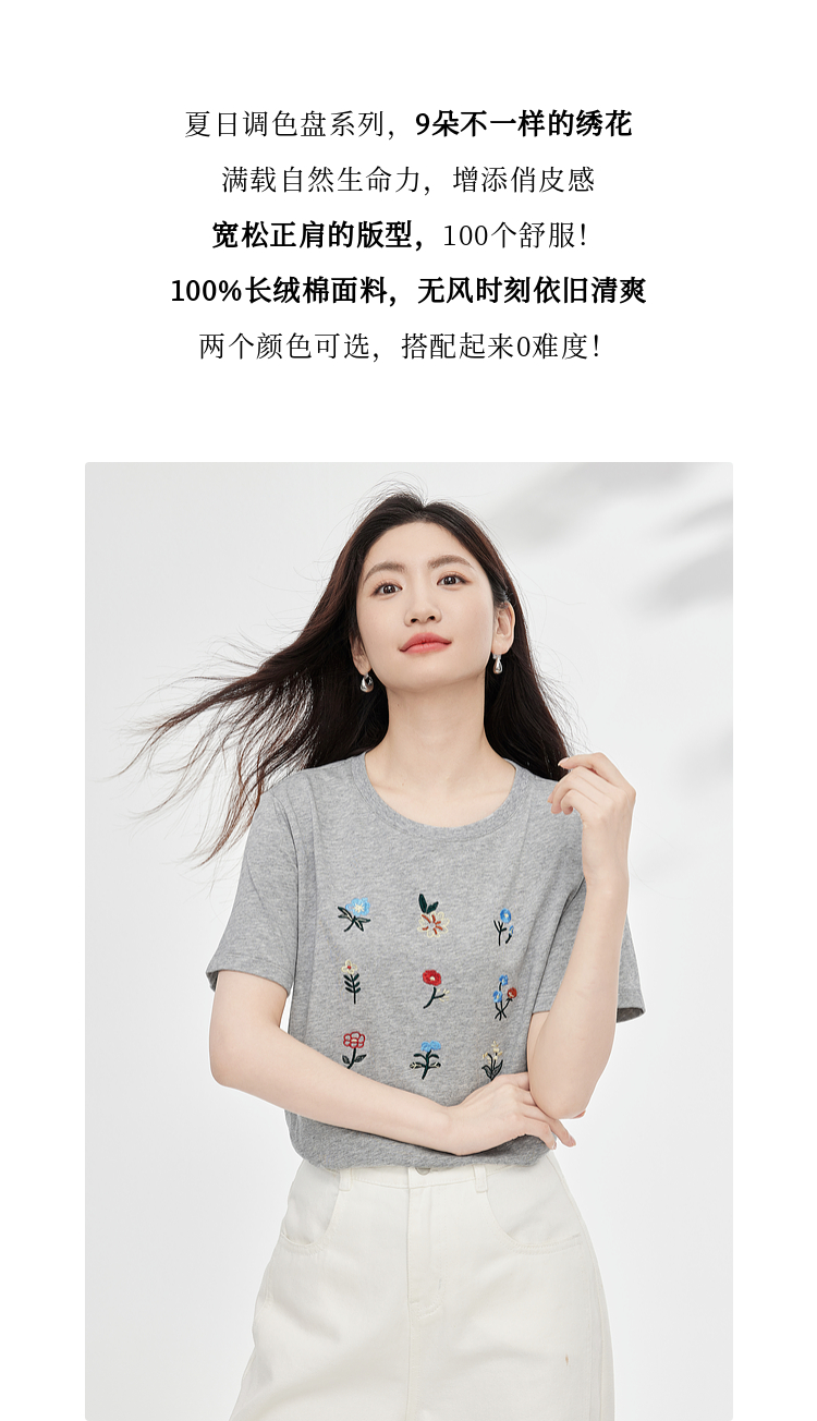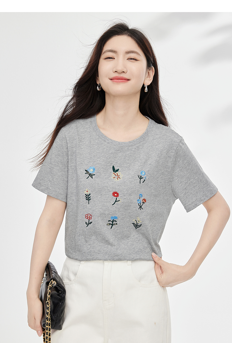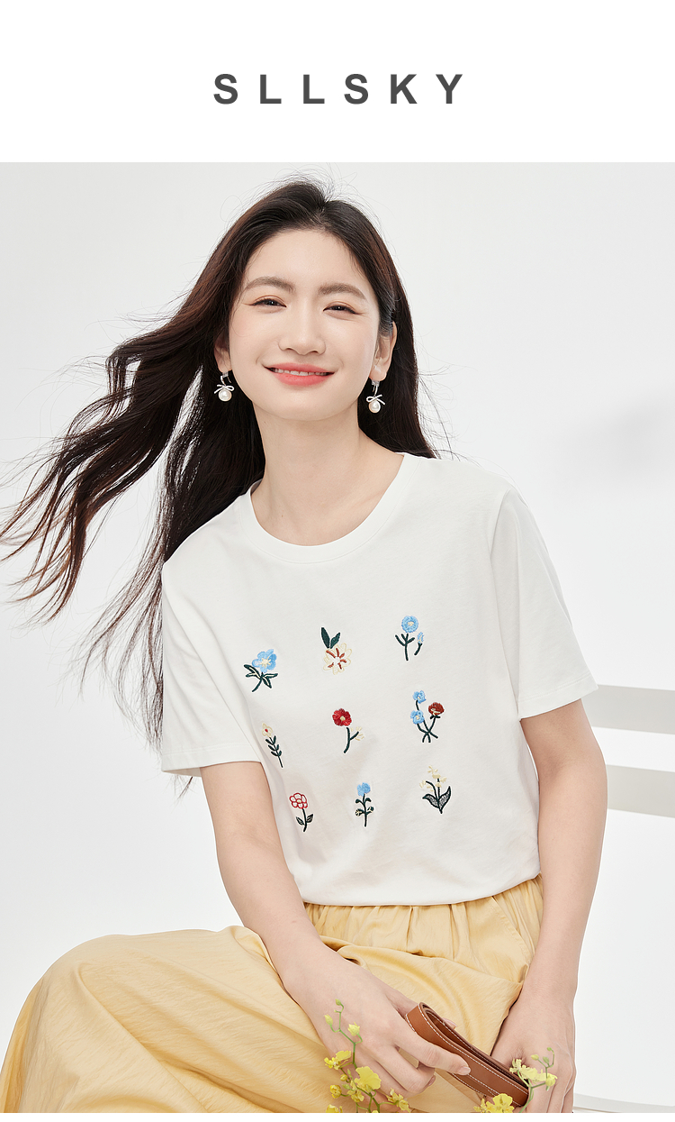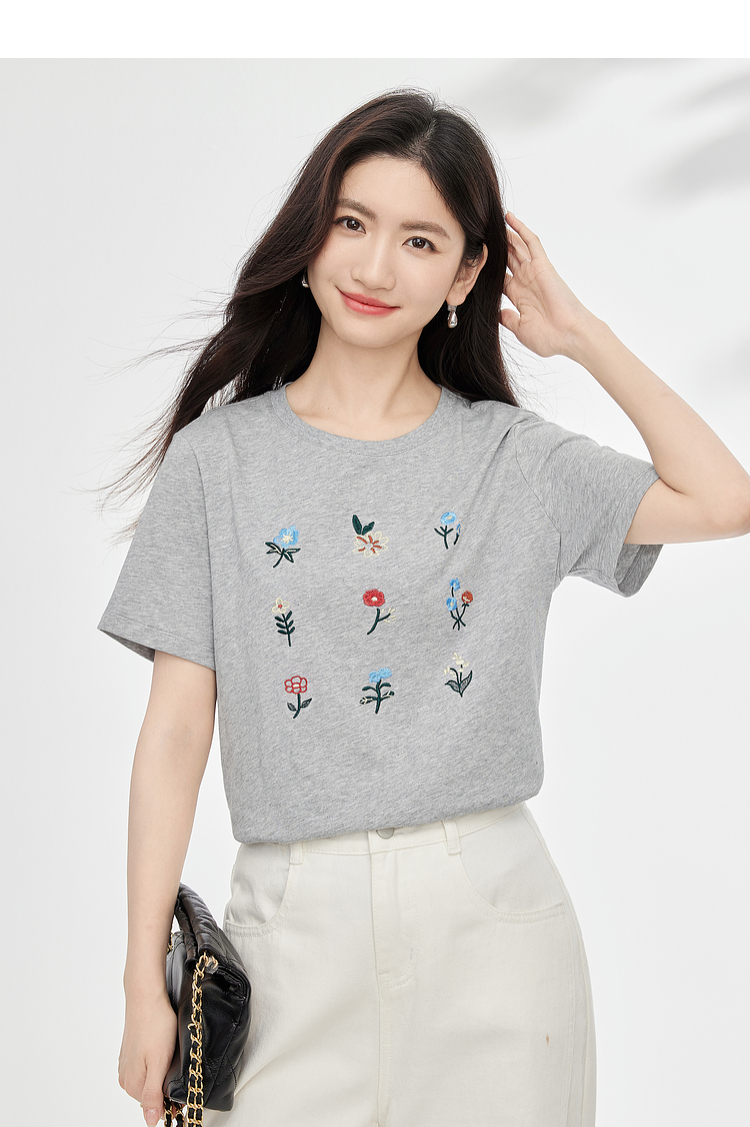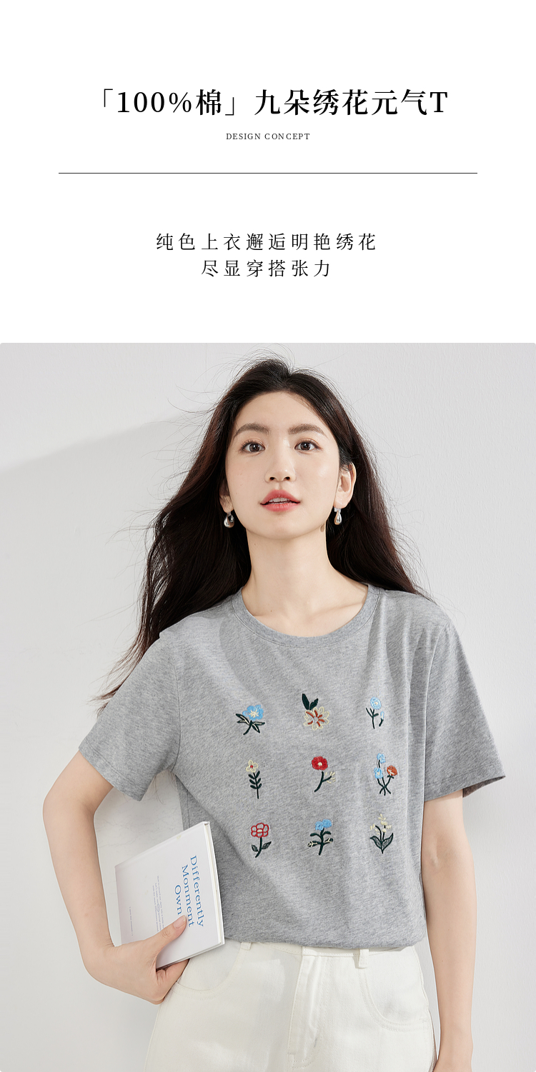 【专属特价】熙世界田园风刺绣花朵T恤短袖女夏新款清新时尚正肩圆领纯棉上衣