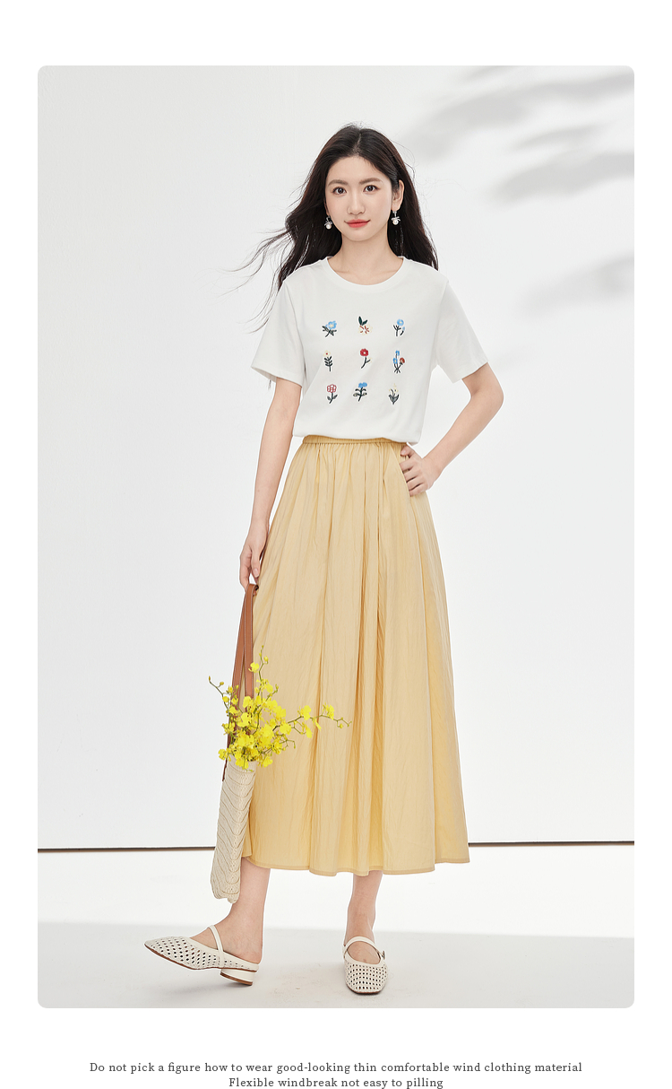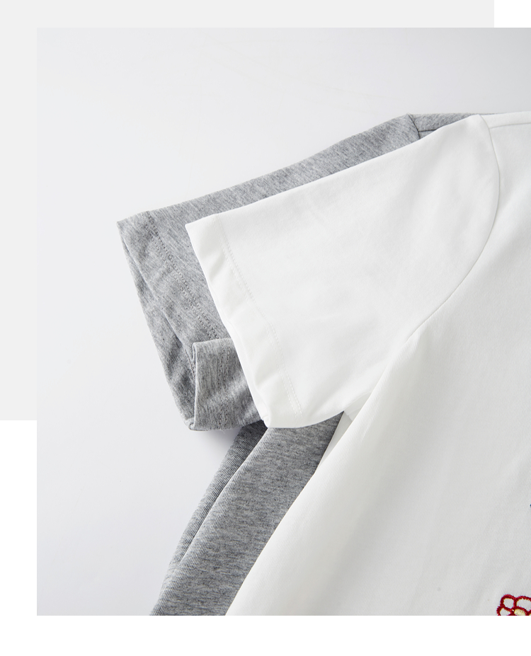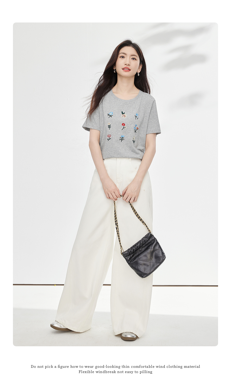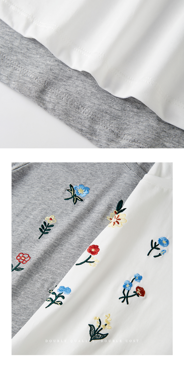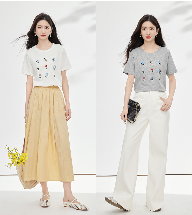 【专属特价】熙世界田园风刺绣花朵T恤短袖女夏新款清新时尚正肩圆领纯棉上衣