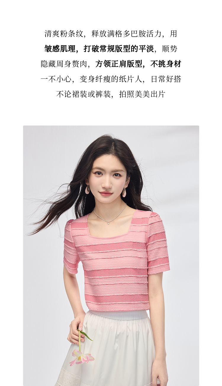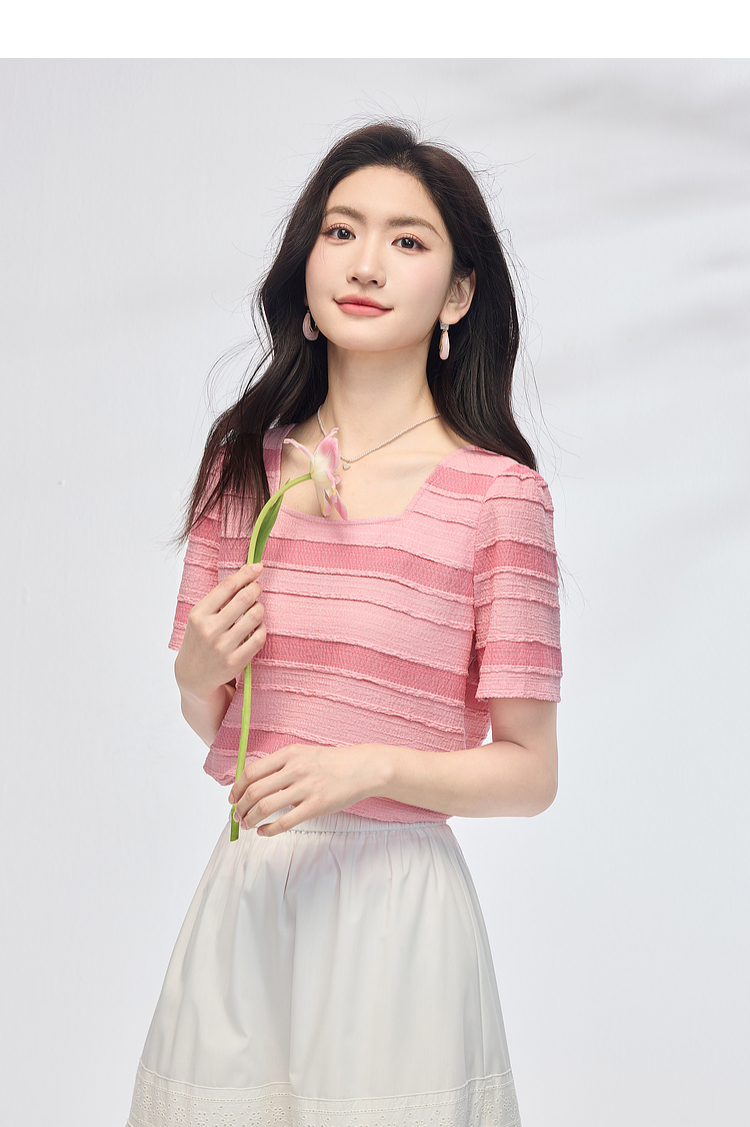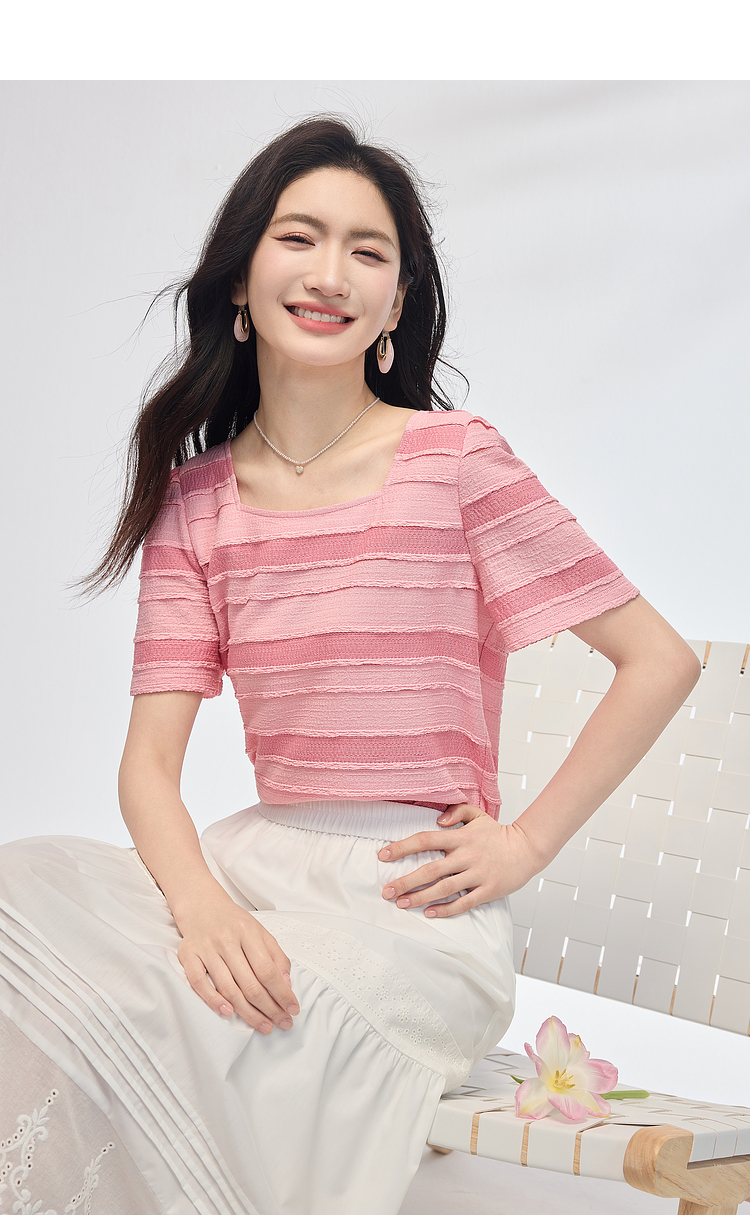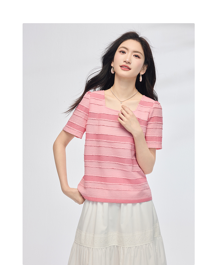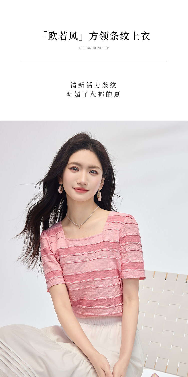 熙世界多巴胺粉色条纹方领T恤女短袖正肩肌理感上衣2025夏日新款