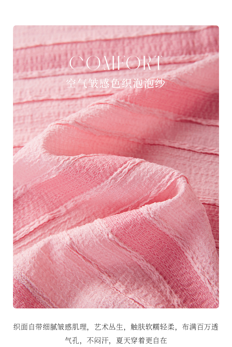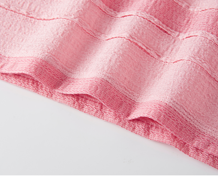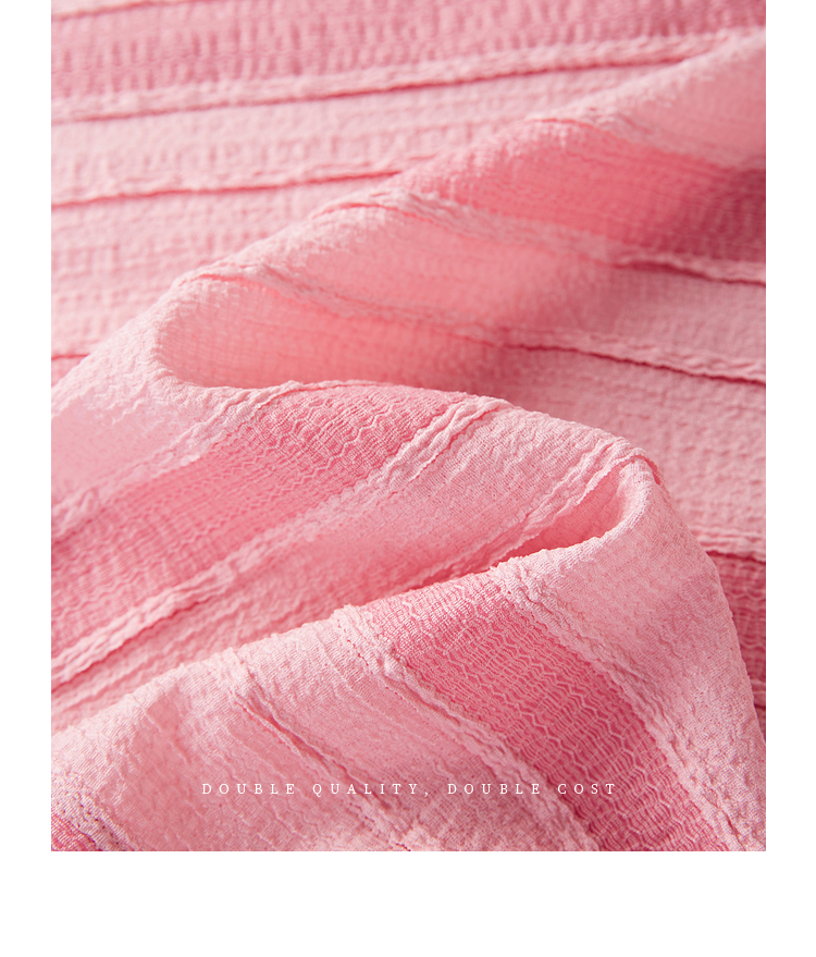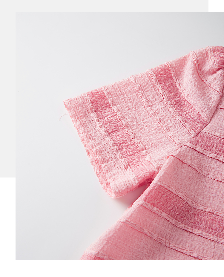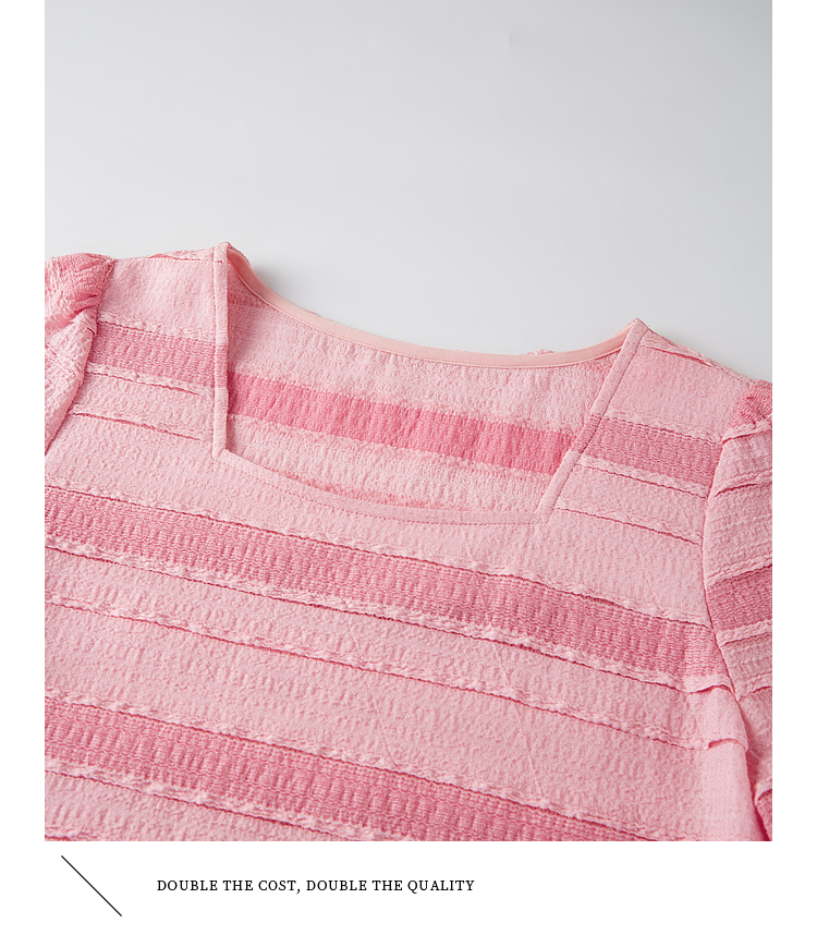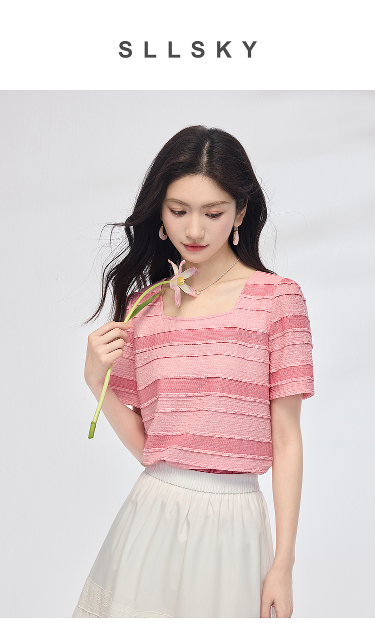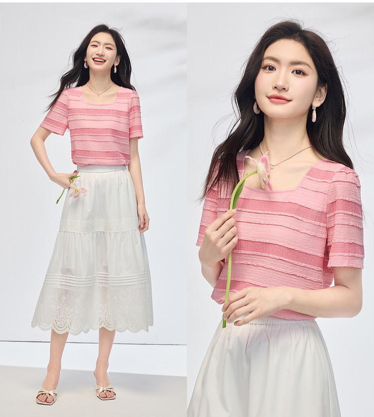 熙世界多巴胺粉色条纹方领T恤女短袖正肩肌理感上衣2025夏日新款