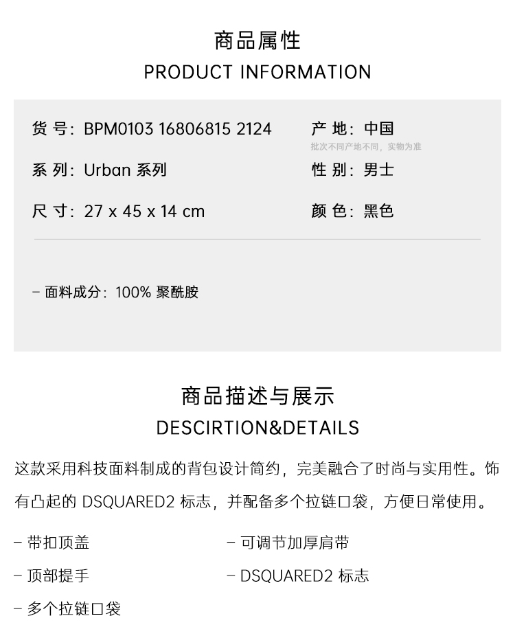 【一】DSQUARED2 男士 Urban 系列 字母徽标贴片双肩包 黑色 BPM0103 16806815 2124