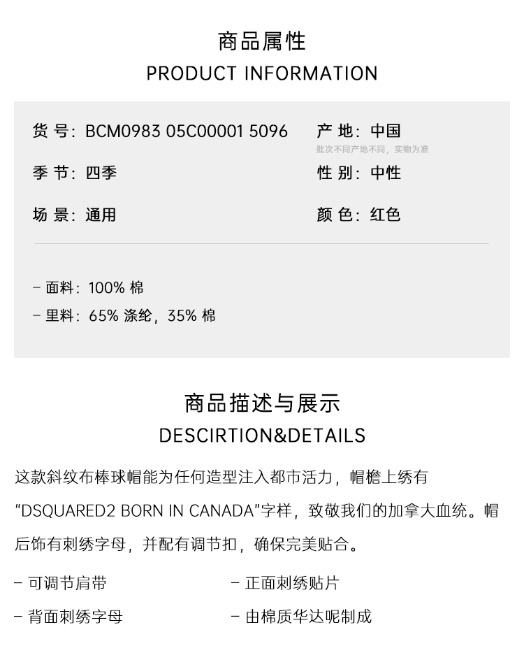 DSQUARED2 中性徽标贴片刺绣棉质棒球帽 红色 BCM0983 05C00001 5096