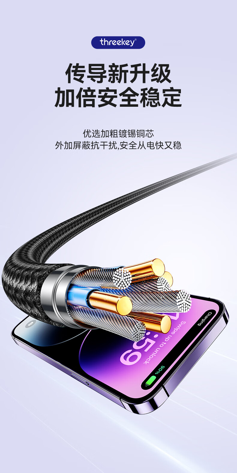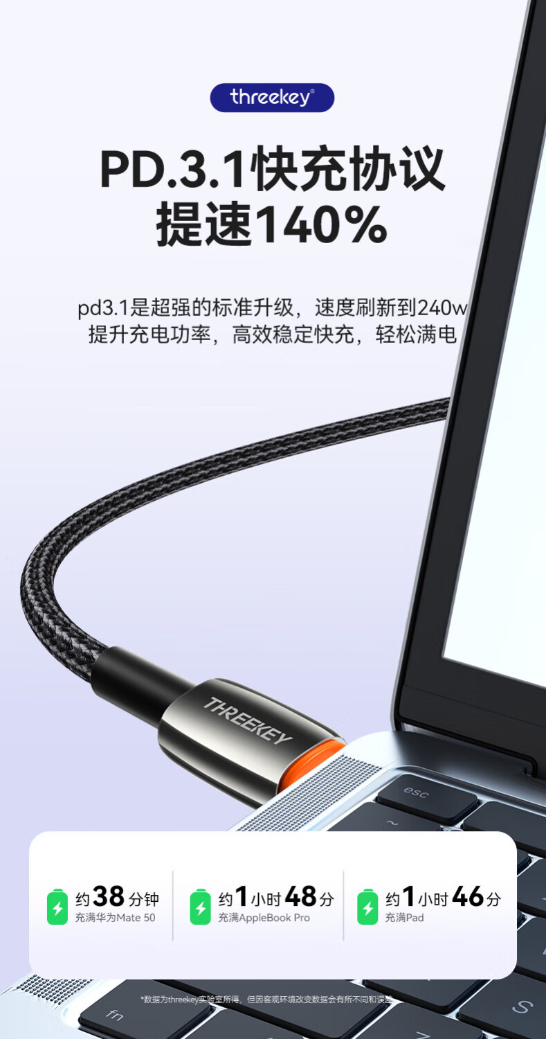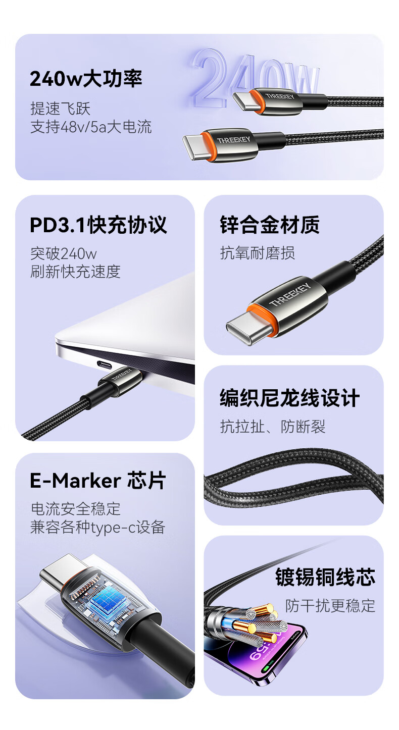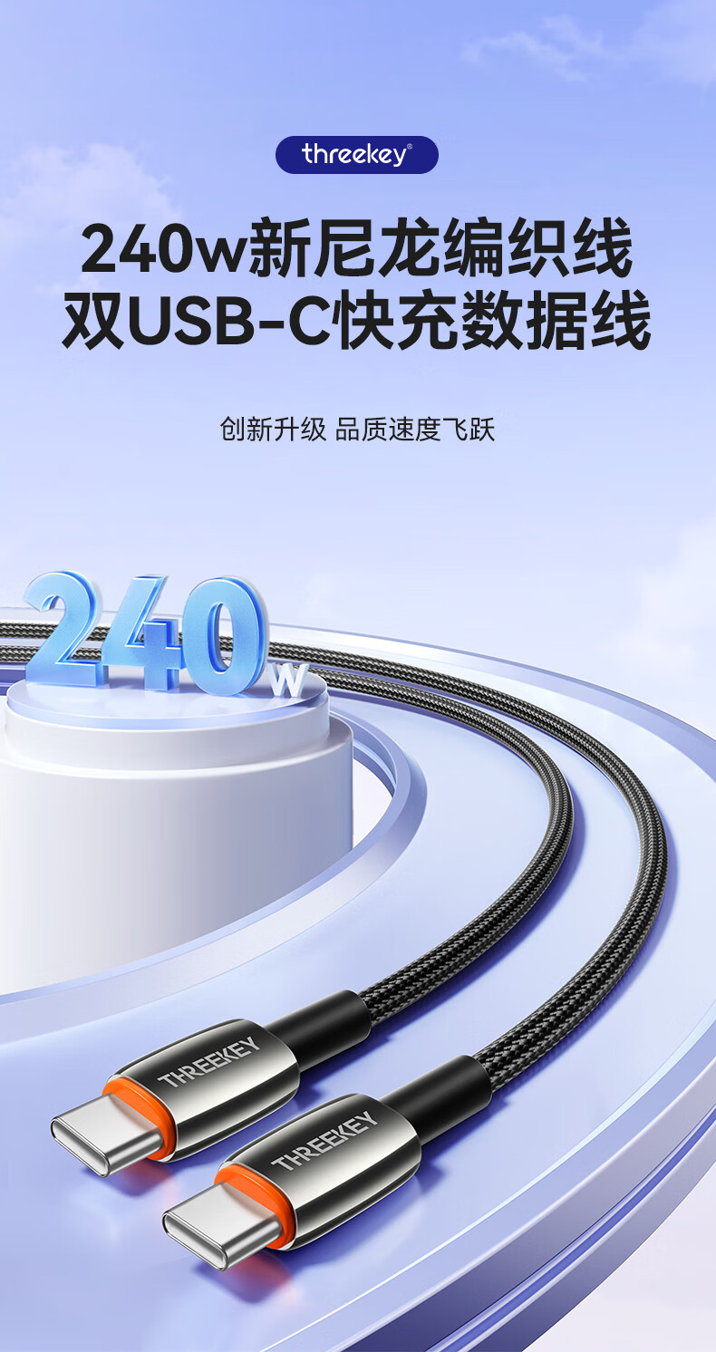 THREEKEY适用iphone15华为type-c240w超级快充数据线tpye-c快充编织充电线 黑色