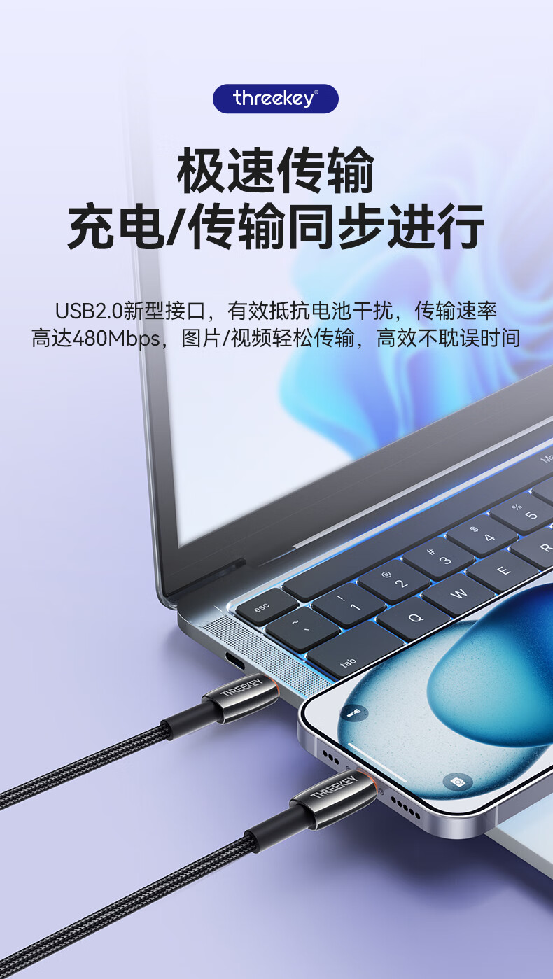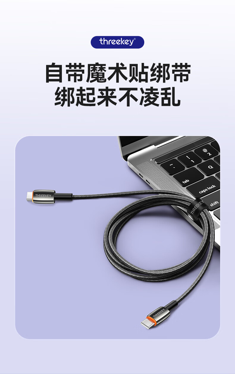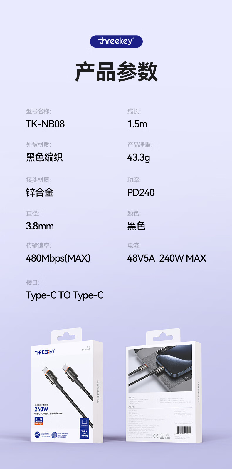 THREEKEY适用iphone15华为type-c240w超级快充数据线tpye-c快充编织充电线 黑色