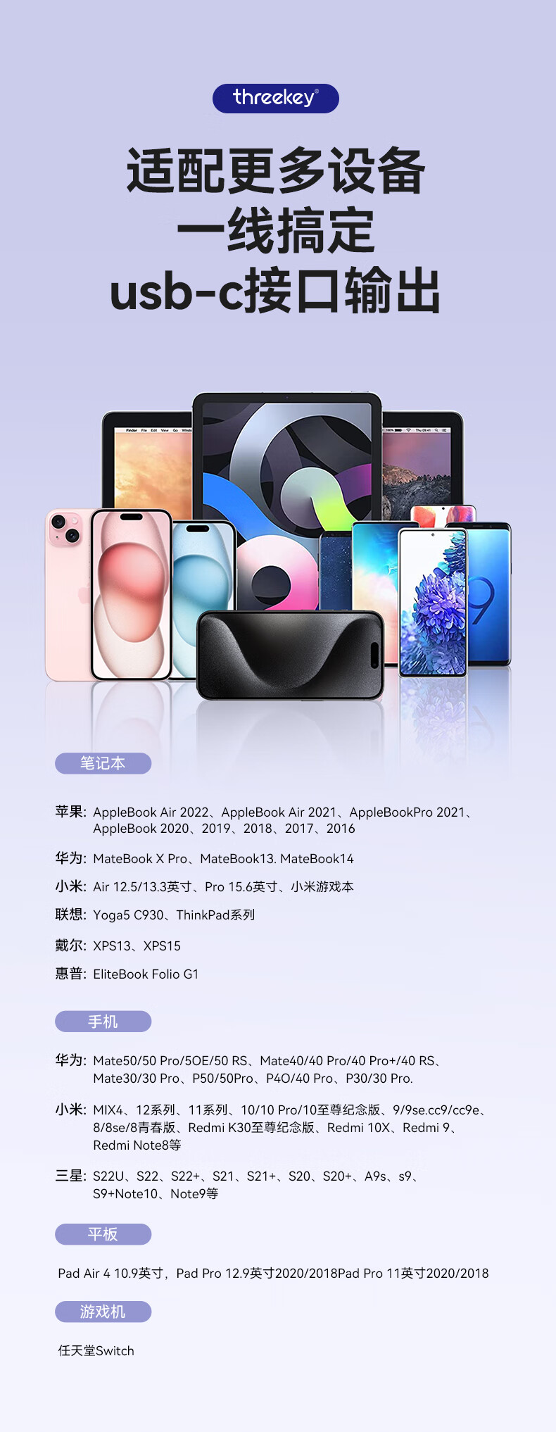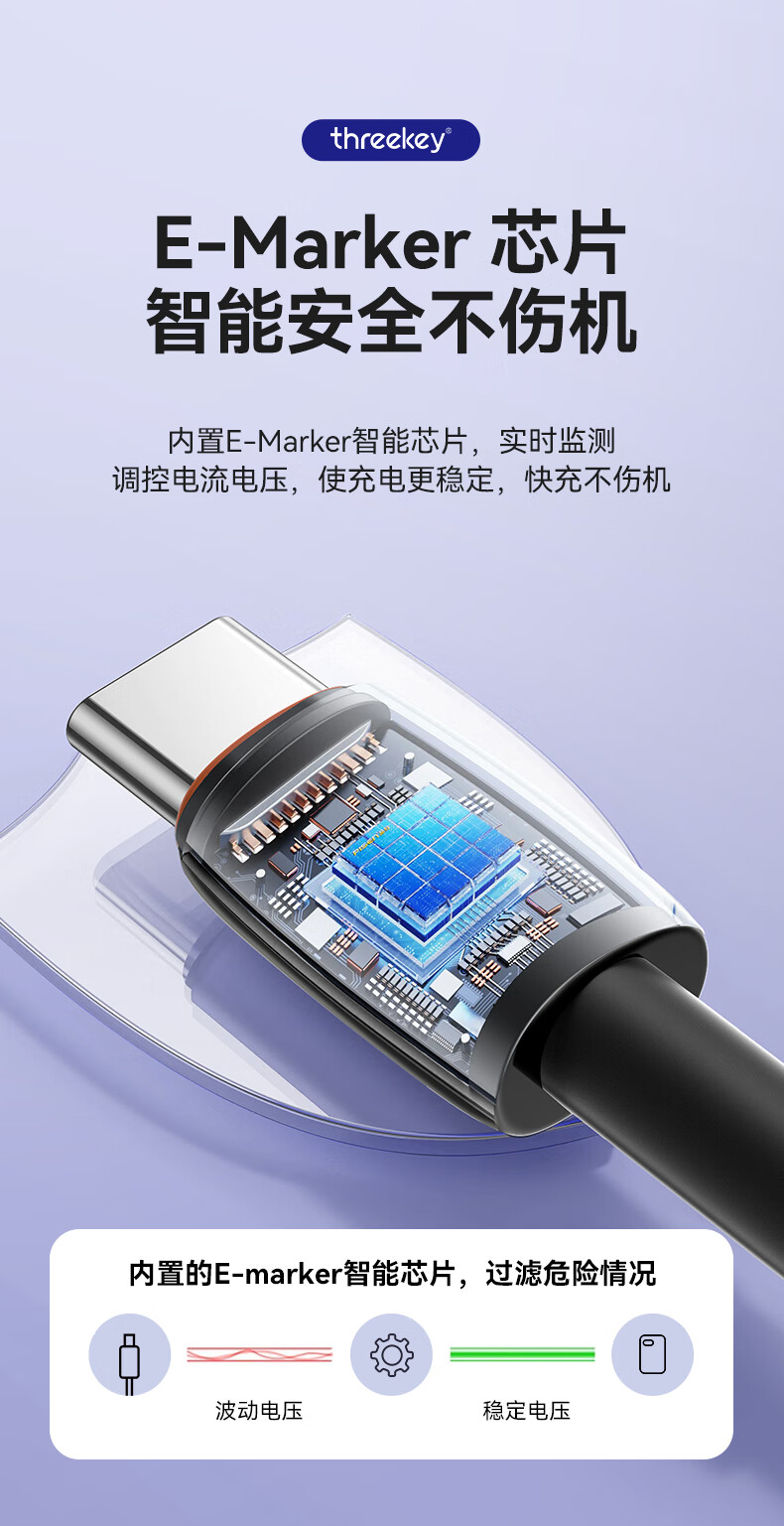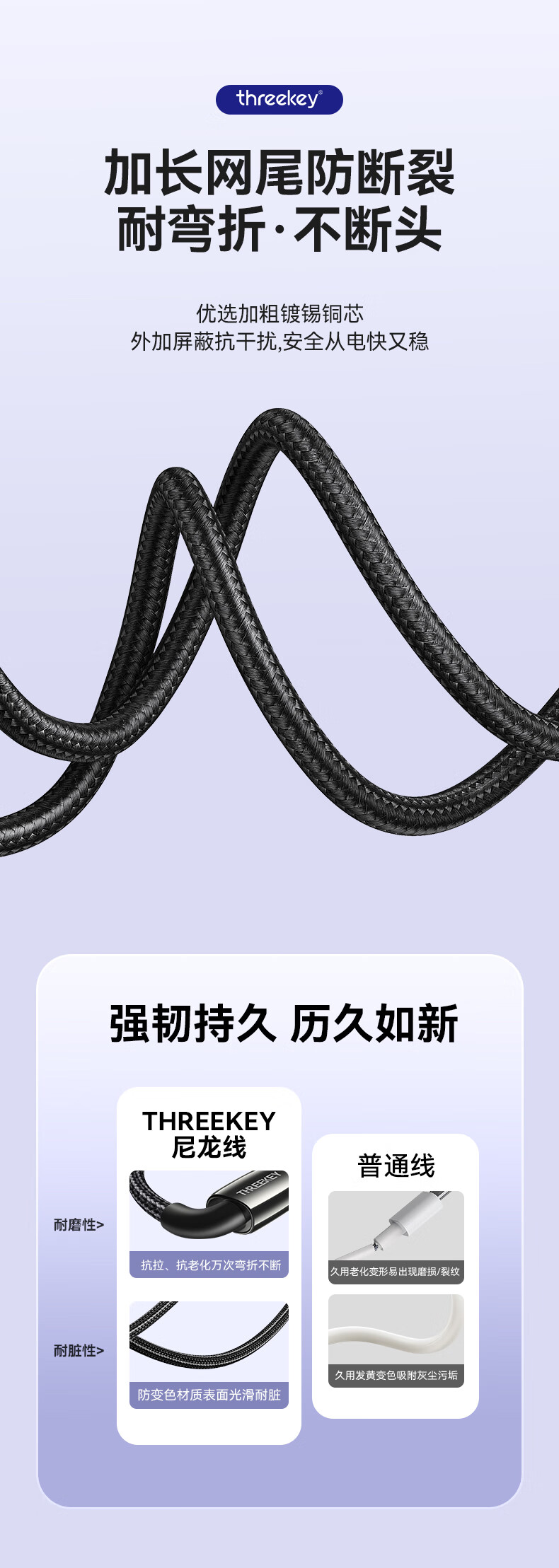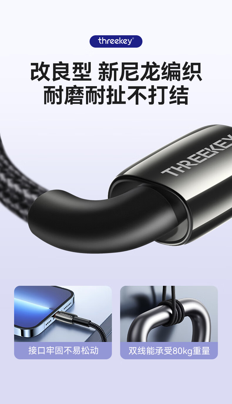 THREEKEY适用iphone15华为type-c240w超级快充数据线tpye-c快充编织充电线 黑色