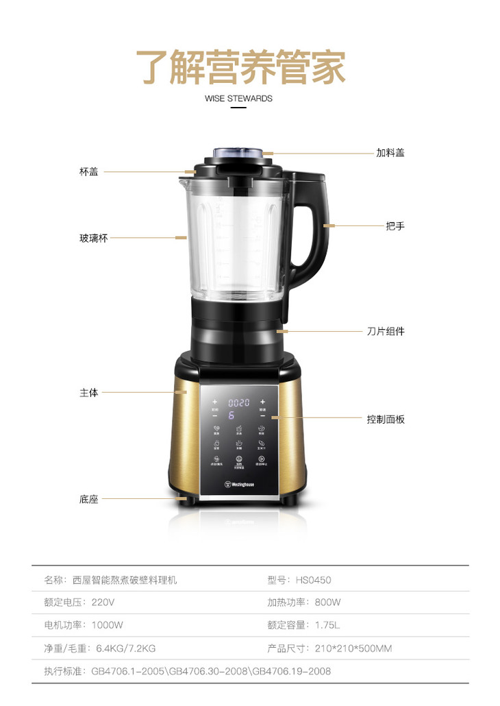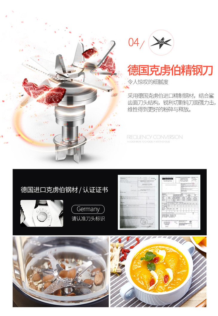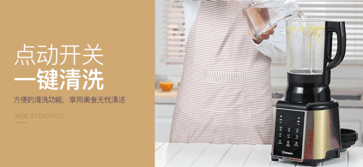 功能:榨汁、碎肉、碎冰、干磨、搅拌、制奶昔、混合、绞肉、煮粥、熬汤、一键清洗