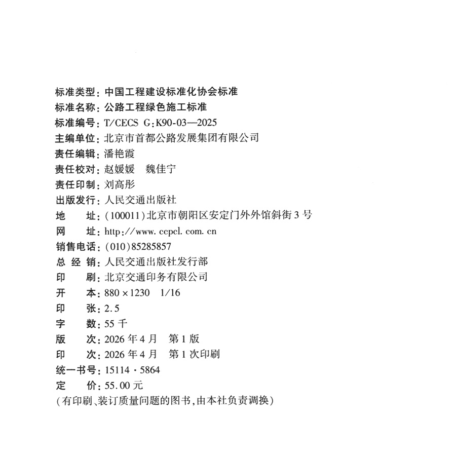 书名:公路工程绿色施工标准(T/CECS G:K90-03—2025)
