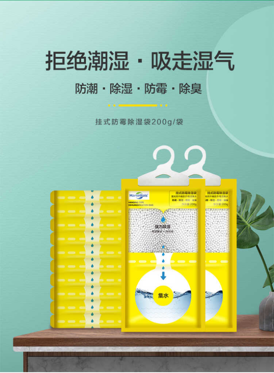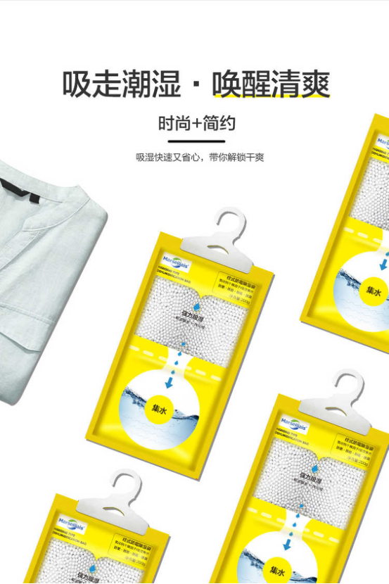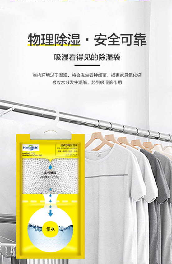 除湿袋由两部分组成,上面是氯化钙颗粒,下面集水袋,可有效将空气的水分吸收并集中。 除湿袋“湿”刻选择我们,除湿看得见 梅雨季节屋内潮湿,要做好除湿的准备! 悬挂式除湿袋它含吸湿集水一次完成,真正的除湿防霉产品。
