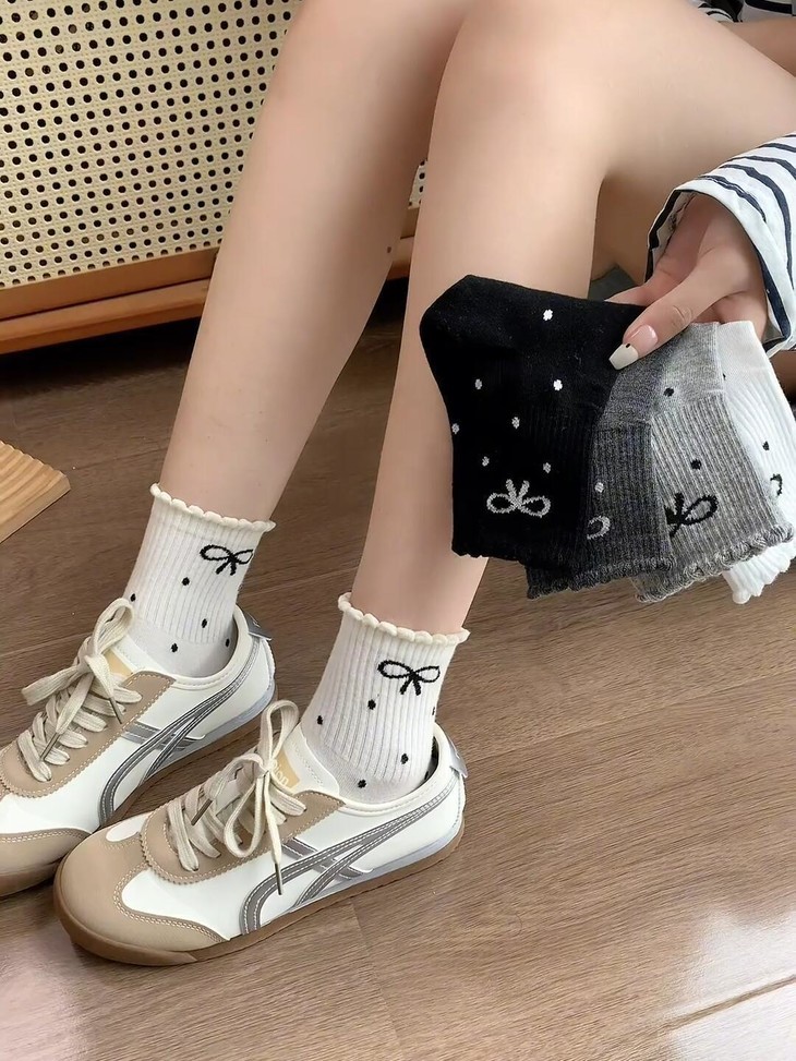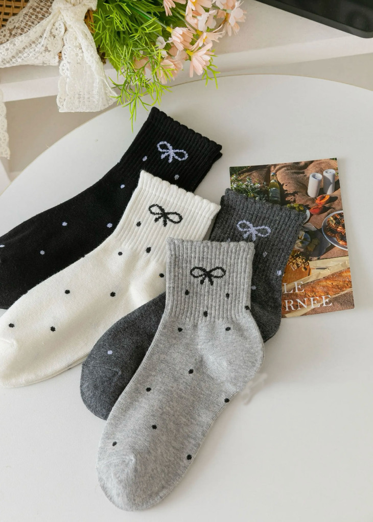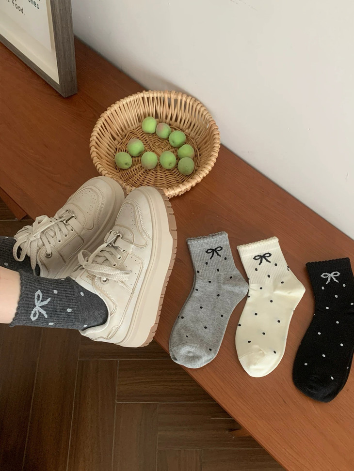 好看到犯规😁波点蝴蝶结袜🧦绝美来袭 想让你的秋冬look增添一丝青春气息 这款波点花边蝴蝶结袜子 绝对是你的不二之选✅ 它不仅颜值爆表,还非常百搭。无论是搭配短裙还是牛仔裤,都能轻松hold住,而且,这双袜子的材质超级舒适,穿上它 你的双脚绝对会感受到满满的宠爱💗 别犹豫了,赶紧入手这款波点花边蝴蝶结堆堆袜,让你的每一步都充满可爱和时尚感!