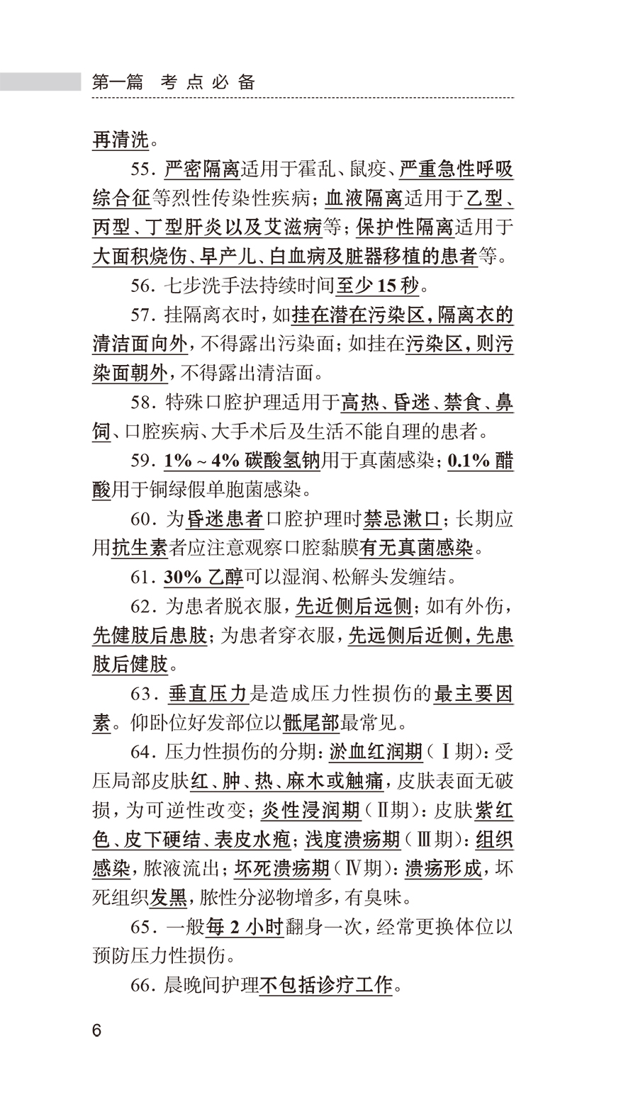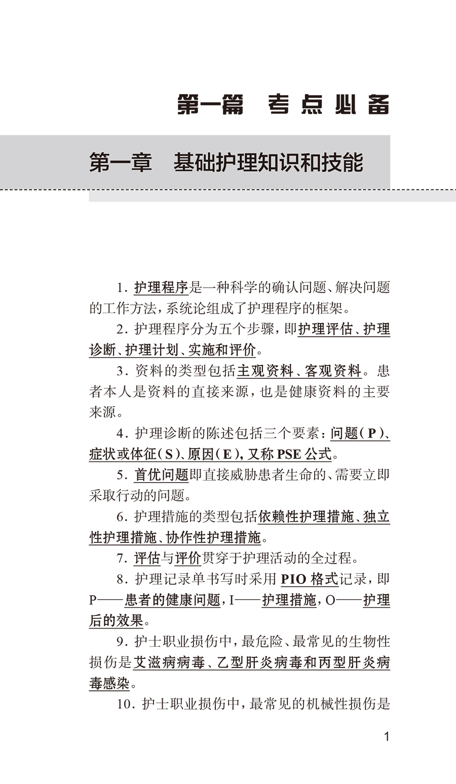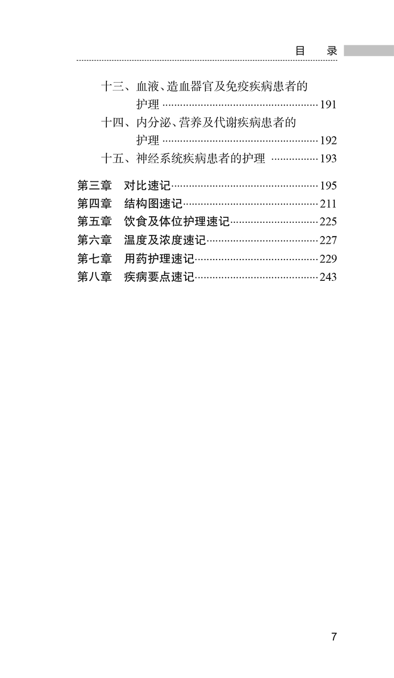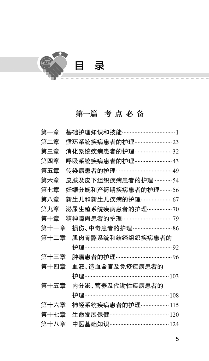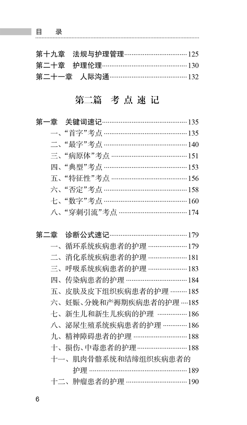第一篇 考 点 必 备 第一章 基础护理知识和技能/1 第二章 循环系统疾病患者的护理/23 第三章 消化系统疾病患者的护理/32 第四章 呼吸系统疾病患者的护理/43 第五章 传染病患者的护理/49 第六章 皮肤及皮下组织疾病患者的护理/54 第七章 妊娠分娩和产褥期疾病患者的护理/56 第八章 新生儿和新生儿疾病的护理/67 第九章 泌尿生殖系统疾病患者的护理/70 第十章 精神障碍患者的护理/79 第十一章 损伤、中毒患者的护理 /86 第十二章 肌肉骨骼系统和结缔组织疾病患者的护理/92 第十三章 肿瘤患者的护理/96 第十四章 血液、造血器官及免疫疾病患者的护理/103 第十五章 内分泌、营养及代谢性疾病患者的护理/108 第十六章 神经系统疾病患者的护理/ 115 第十七章 生命发展保健/120 第十八章 中医基础知识/124 第十九章 法规与护理管理/125 第二十章 护理伦理/130 第二十一章 人际沟通/132 第二篇 考 点 速 记 第一章 关键词速记/135 一、 “ 首字”考点 /135 二、 “ 最字”考点 /140 三、 “ 病原体”考点 /151 四、 “ 典型”考点 /153 五、 “ 特征性”考点 /156 六、 “ 否定”考点 /158 七、 “ 数字”考点 /160 八、 “ 穿刺引流”考点 /174 第二章 诊断公式速记/179 一、 循环系统疾病患者的护理 /179 二、 消化系统疾病患者的护理 /181 三、 呼吸系统疾病患者的护理 /183 四、 传染病患者的护理 /184 五、 皮肤及皮下组织疾病患者的护理 /185 六、 妊娠、分娩和产褥期疾病患者的护理 /185 七、 新生儿和新生儿疾病的护理 /186 八、 泌尿生殖系统疾病患者的护理 /186 九、 精神障碍患者的护理 /188 十、 损伤、中毒患者的护理 /188 十一、 肌肉骨骼系统和结缔组织疾病患者的护理 /189 十二、 肿瘤患者的护理 /190 十三、 血液、造血器官及免疫疾病患者的护理 /191 十四、 内分泌、营养及代谢疾病患者的护理 /192 十五、 神经系统疾病患者的护理 /193 第三章 对比速记/195 第四章 结构图速记/ 211 第五章 饮食及体位护理速记/225 第六章 温度及浓度速记/227 第七章 用药护理速记/229 第八章 疾病要点速记/243