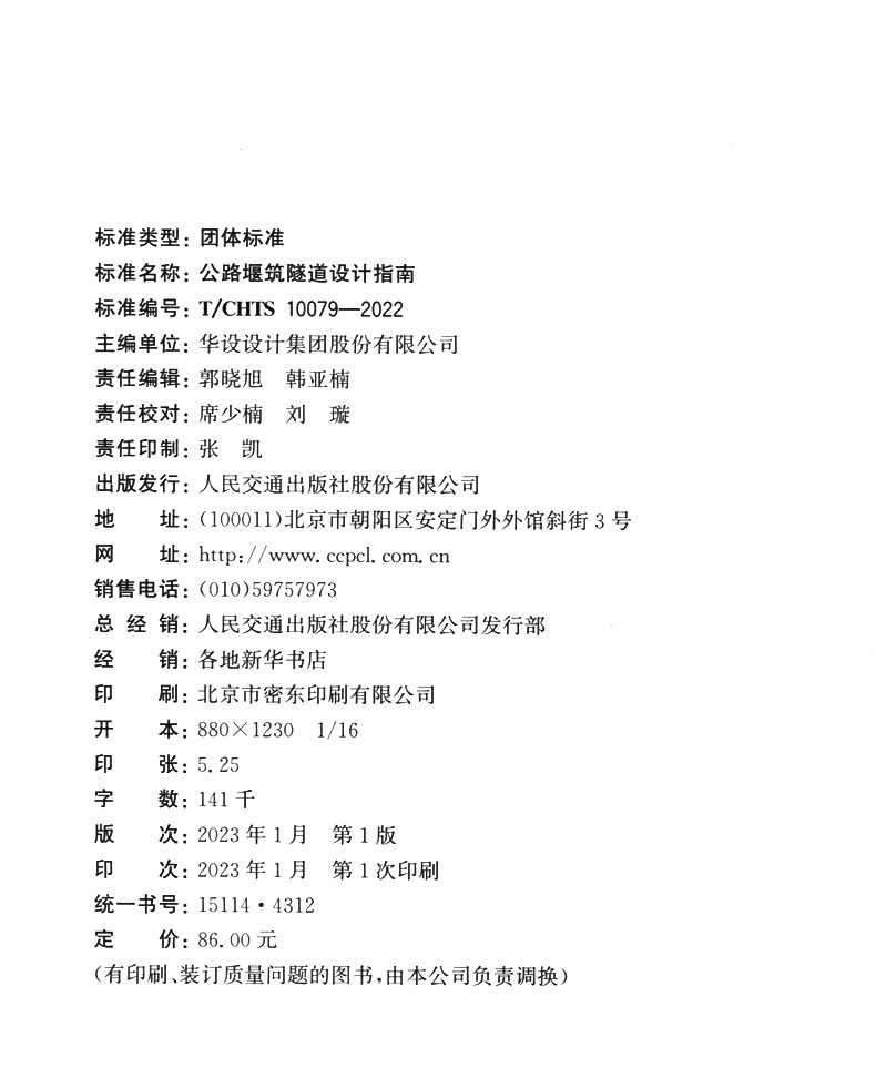 书名:公路堰筑隧道设计指南(T/CHTS 10079-2022)