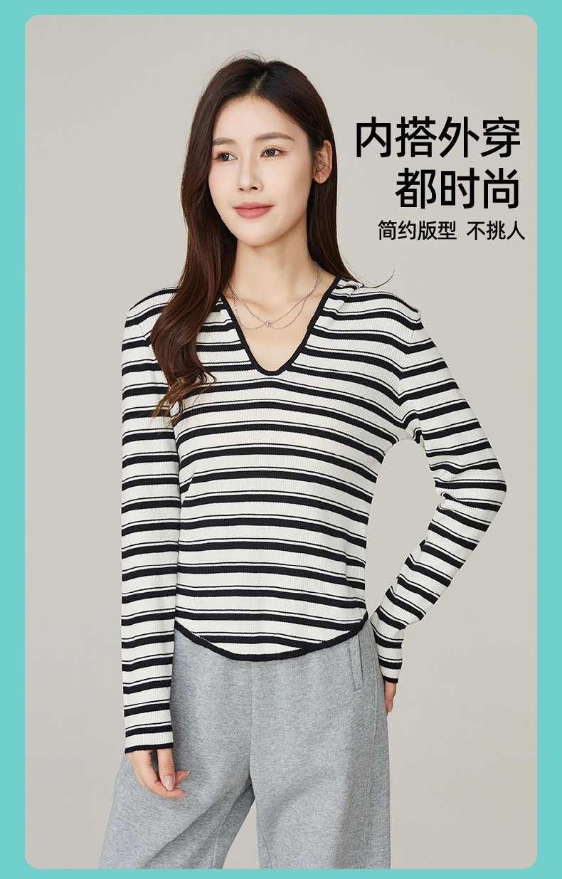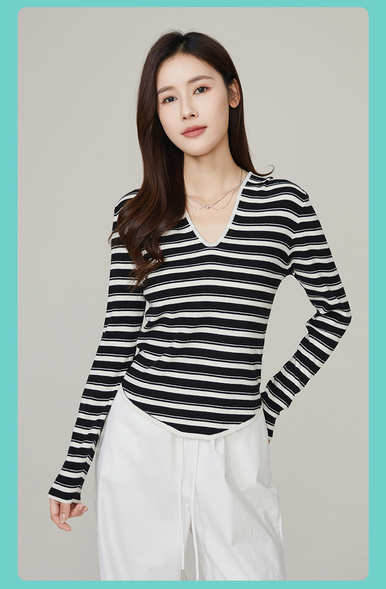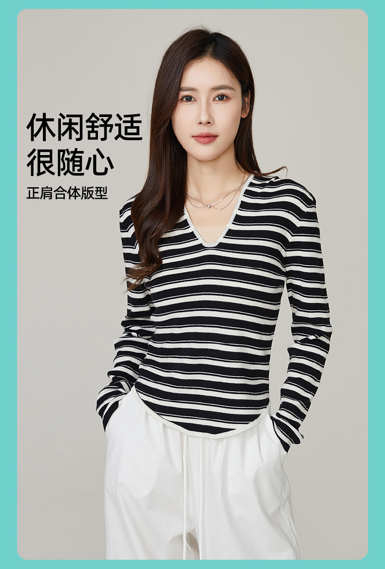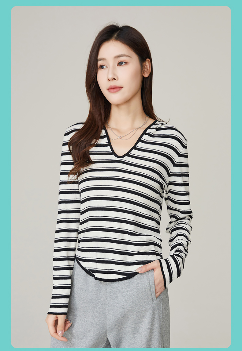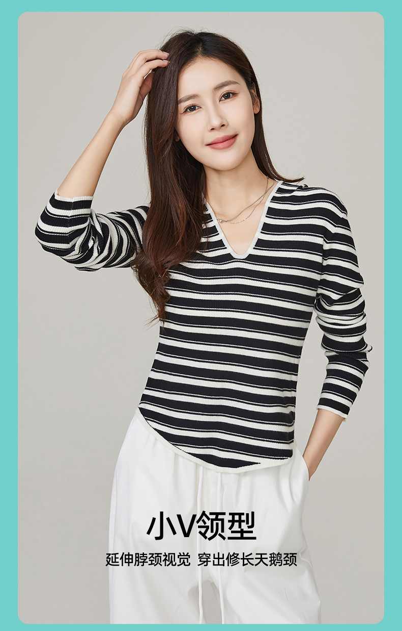【羊毛条纹帽衫】逸阳秋新品V领连帽针织显瘦软糯长袖上衣5050