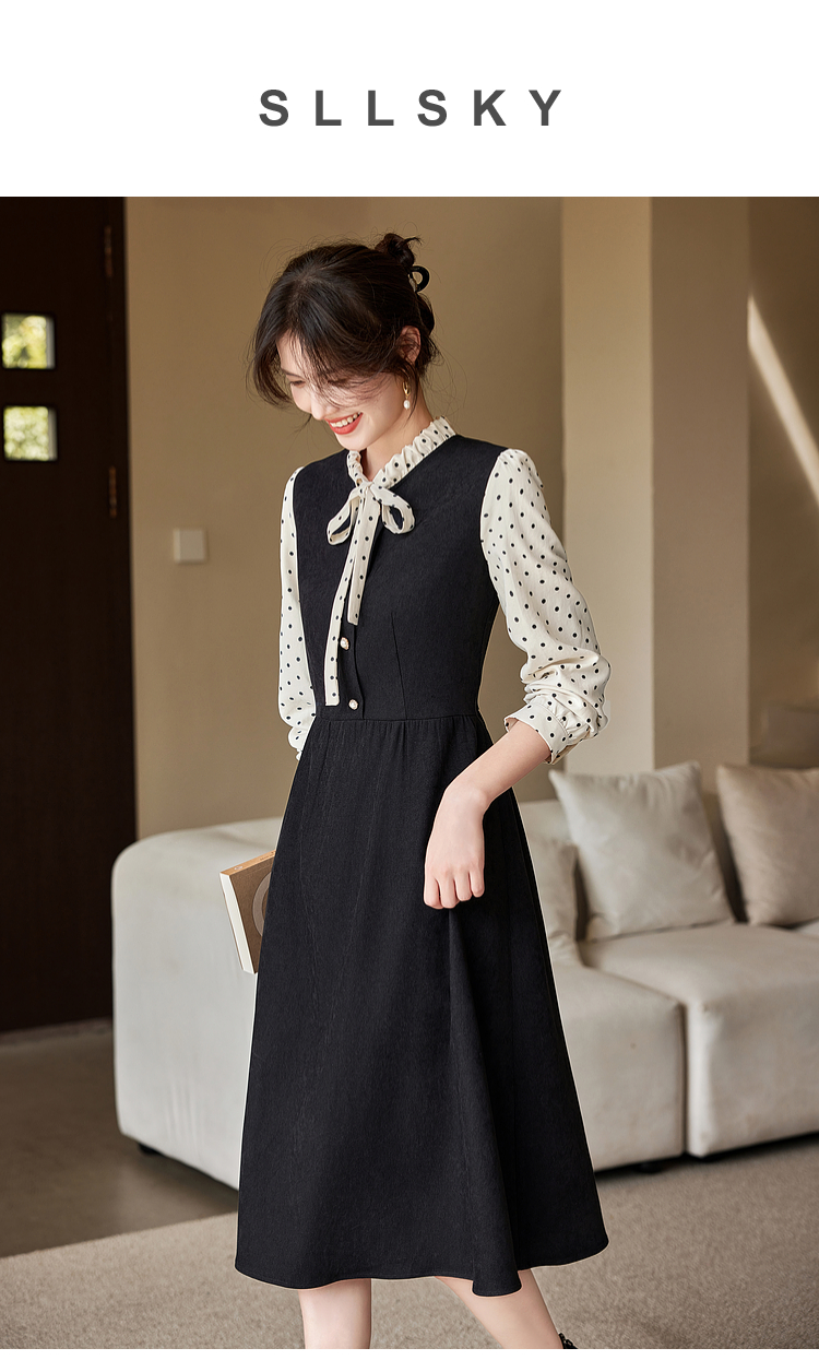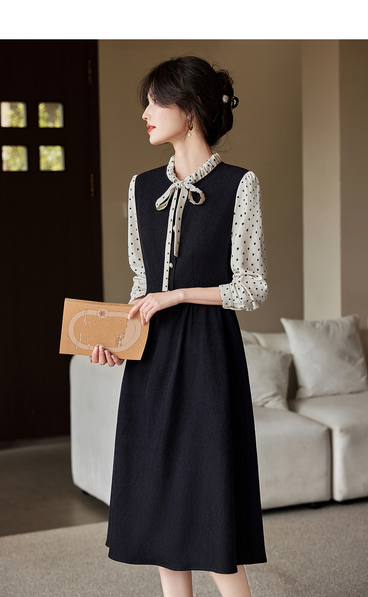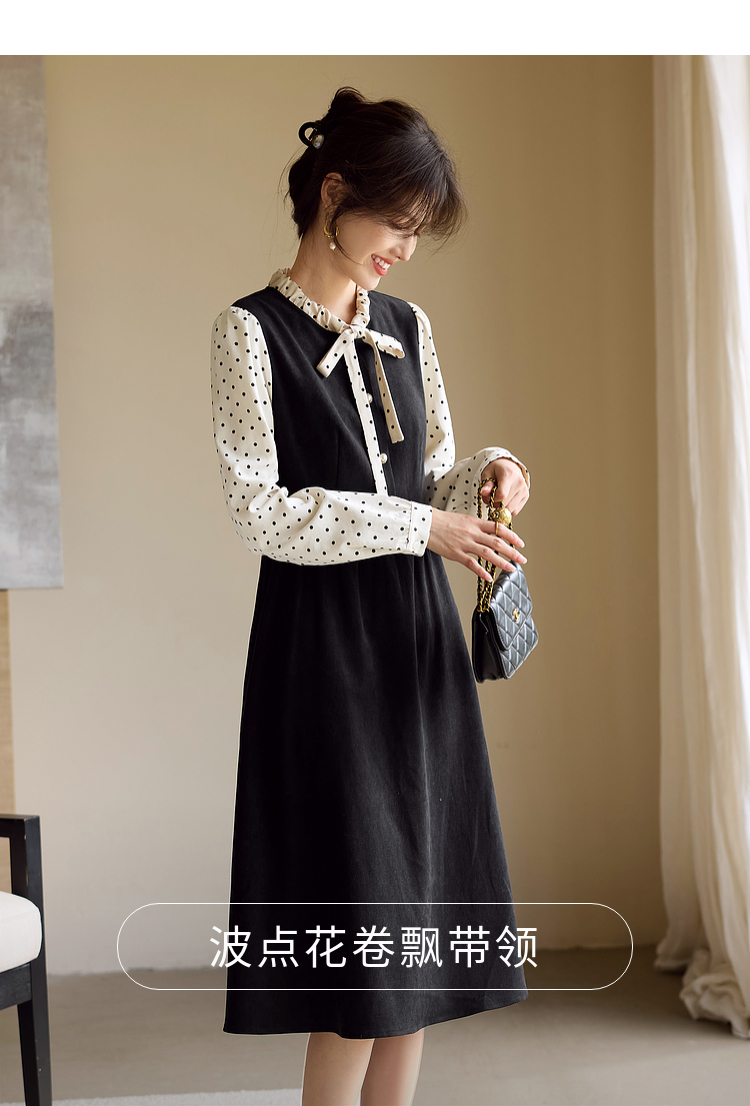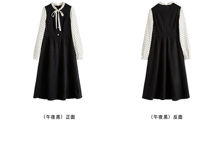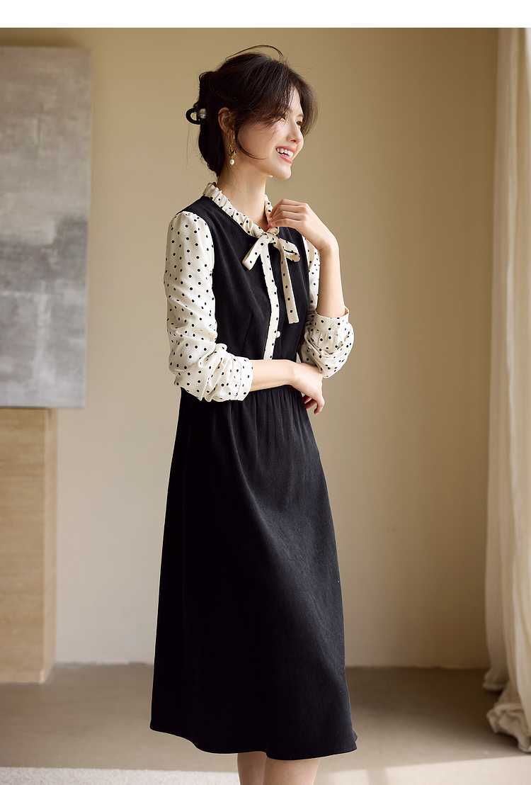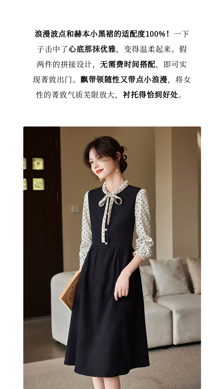 【专属特价】熙世界浪漫优雅赫本风波点蝴蝶结假两件长袖连衣裙女2025秋冬新款