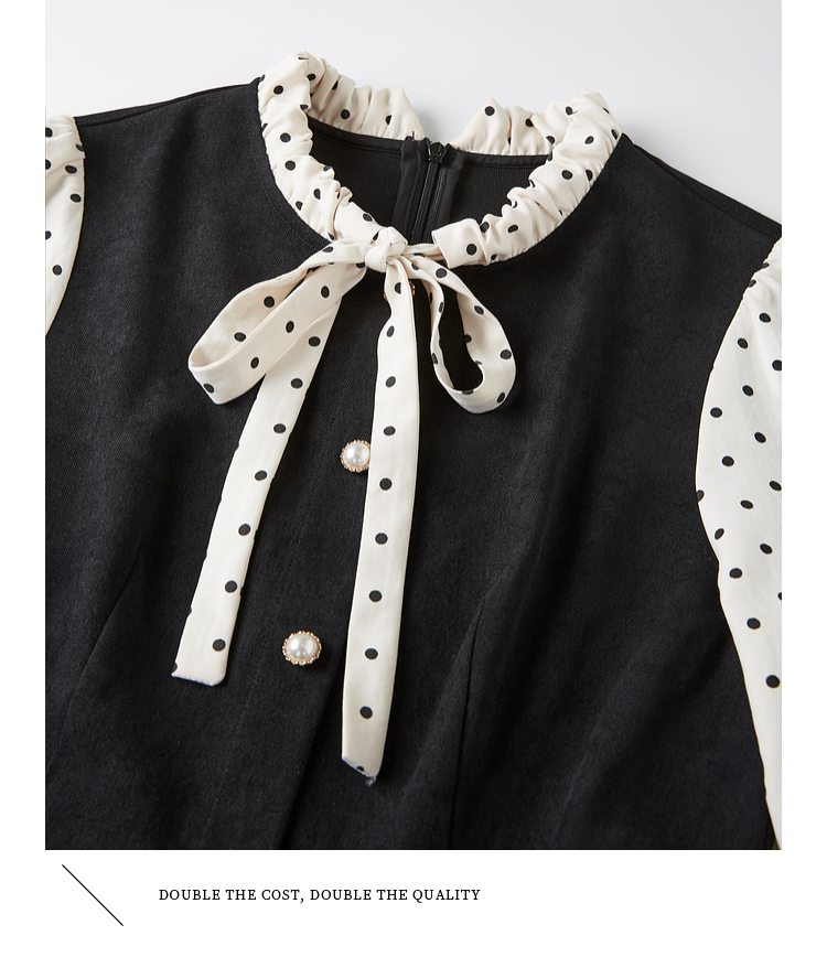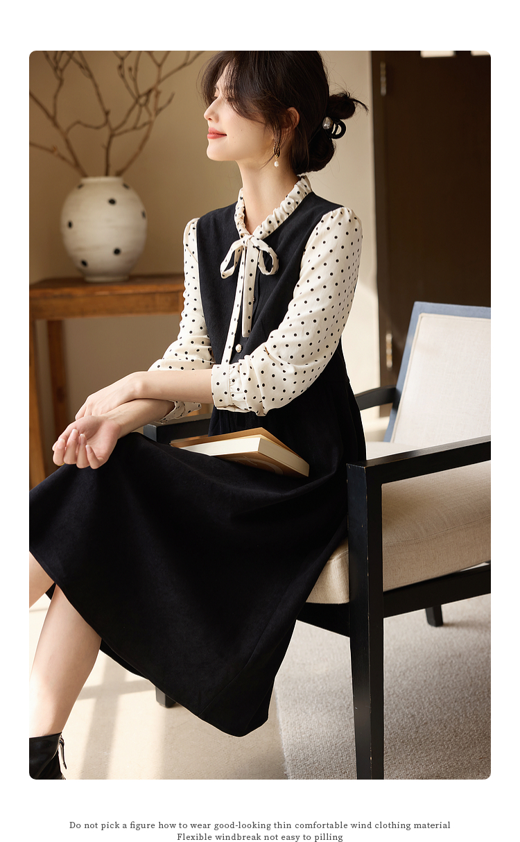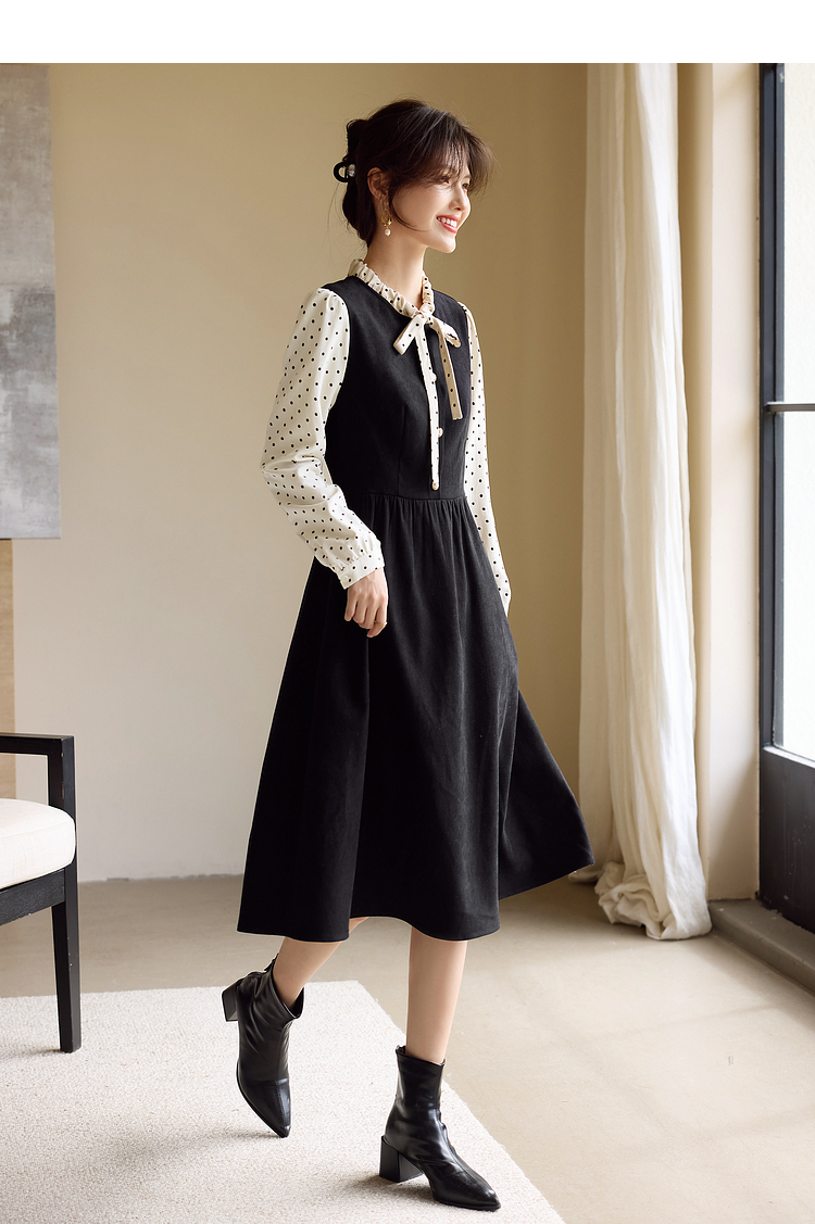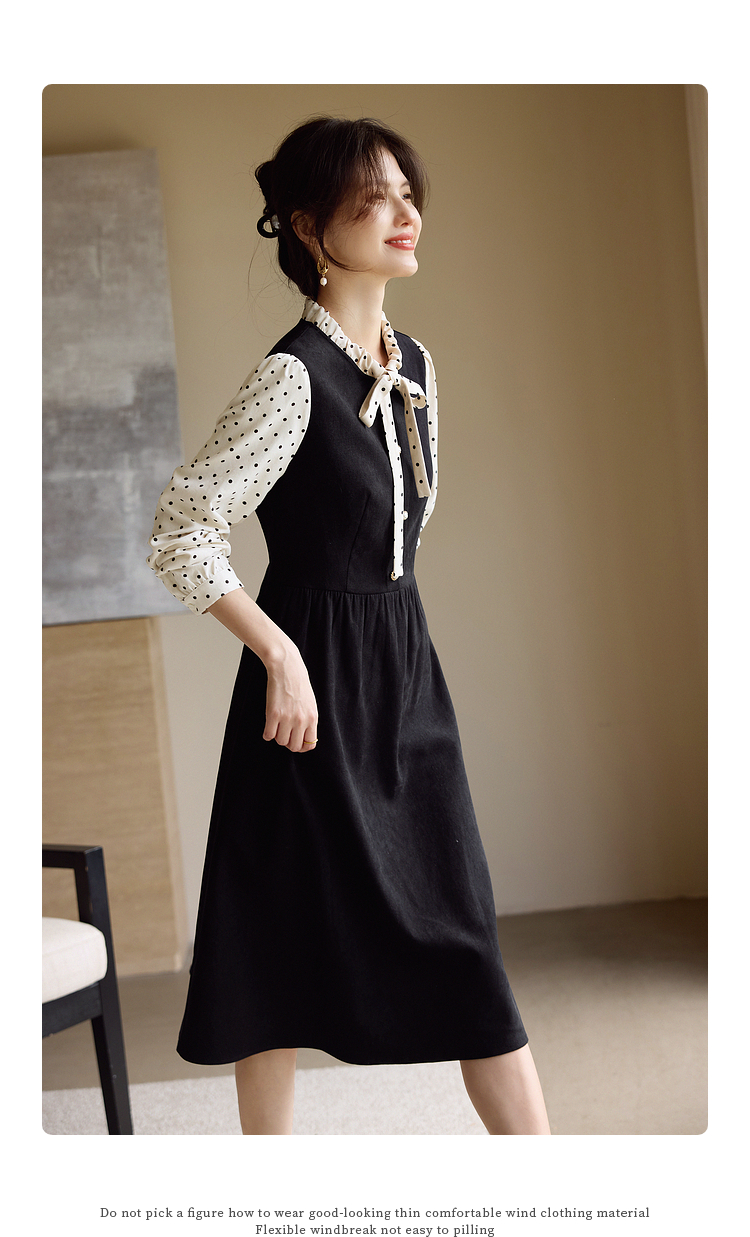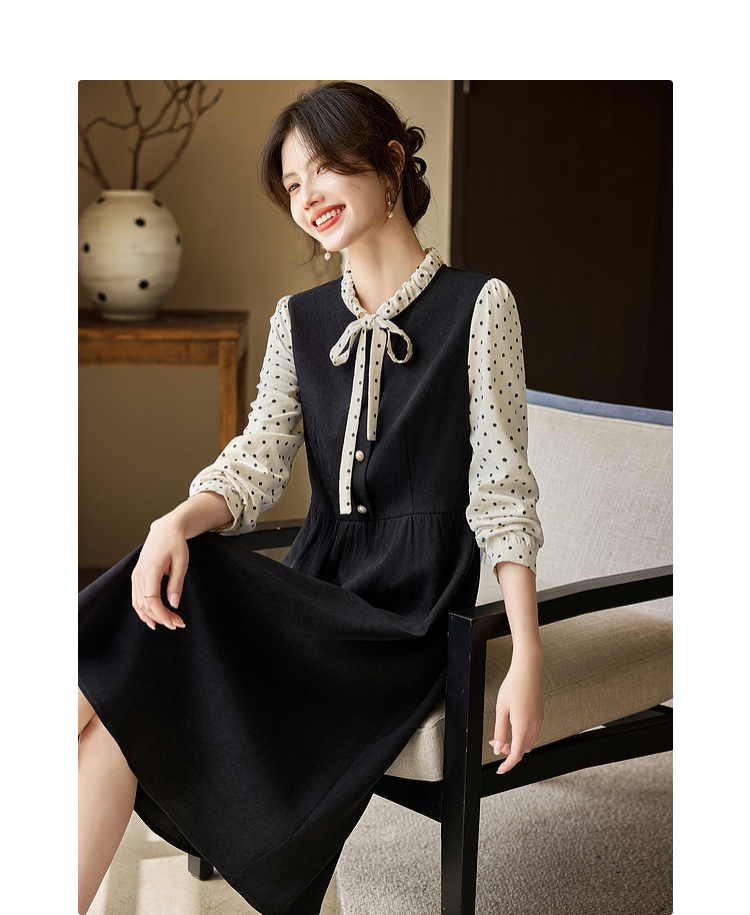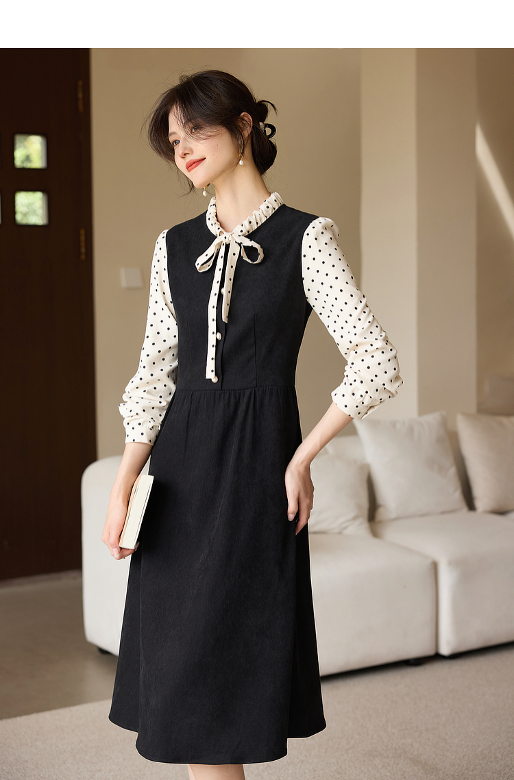 【专属特价】熙世界浪漫优雅赫本风波点蝴蝶结假两件长袖连衣裙女2025秋冬新款