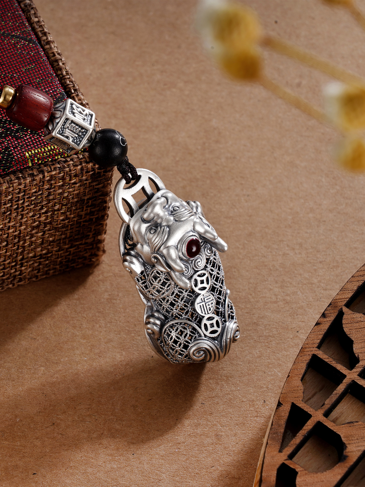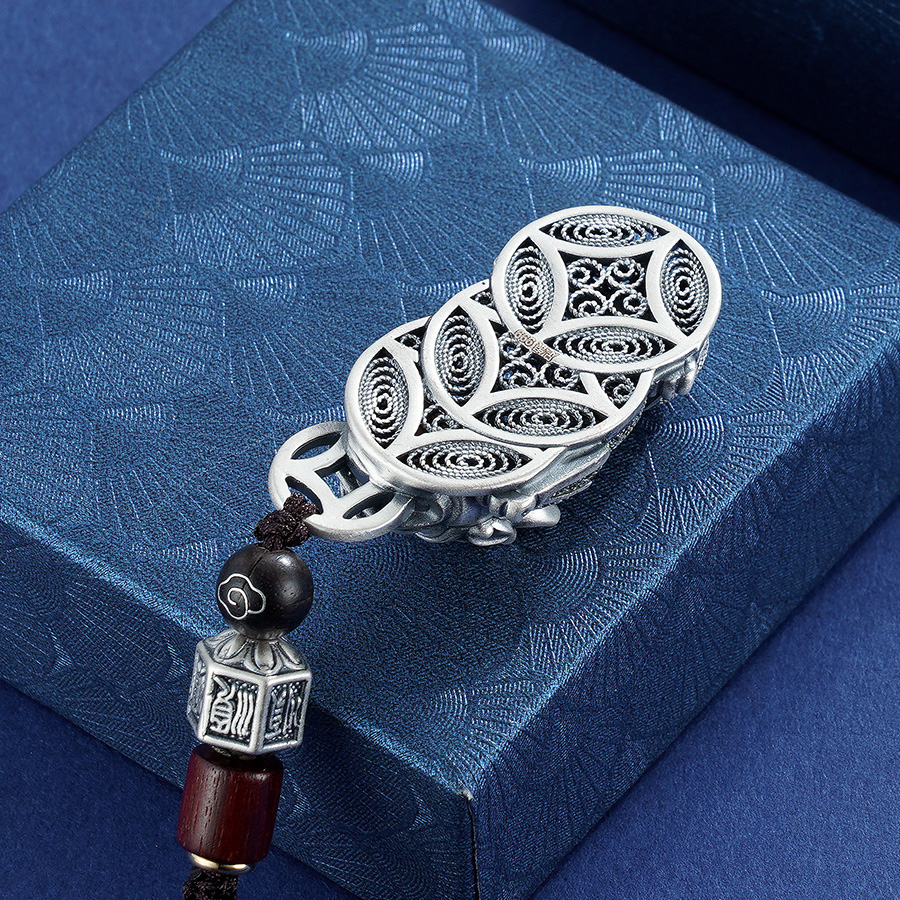 【寓意】:作品灵感源自貔貅,采用银花丝工艺打造,貔貅匍匐于铜钱之上,兼具设计感的同时,寓意招财进宝,吉祥守护。