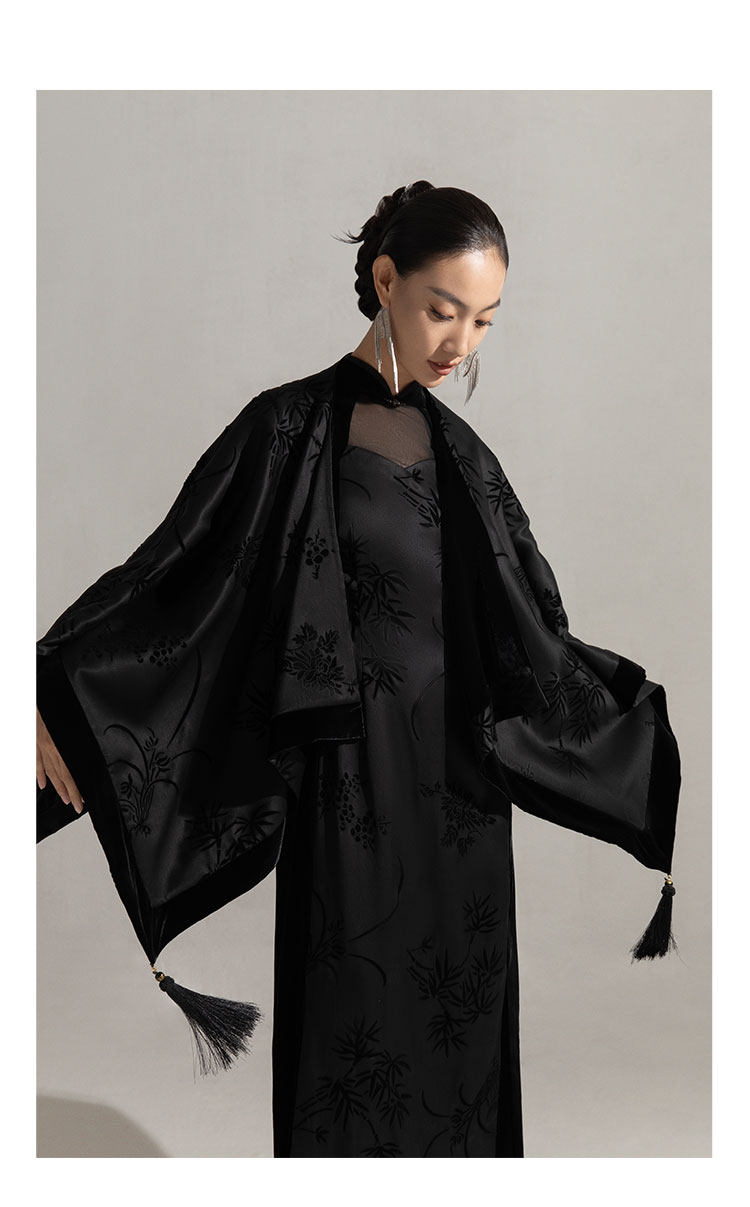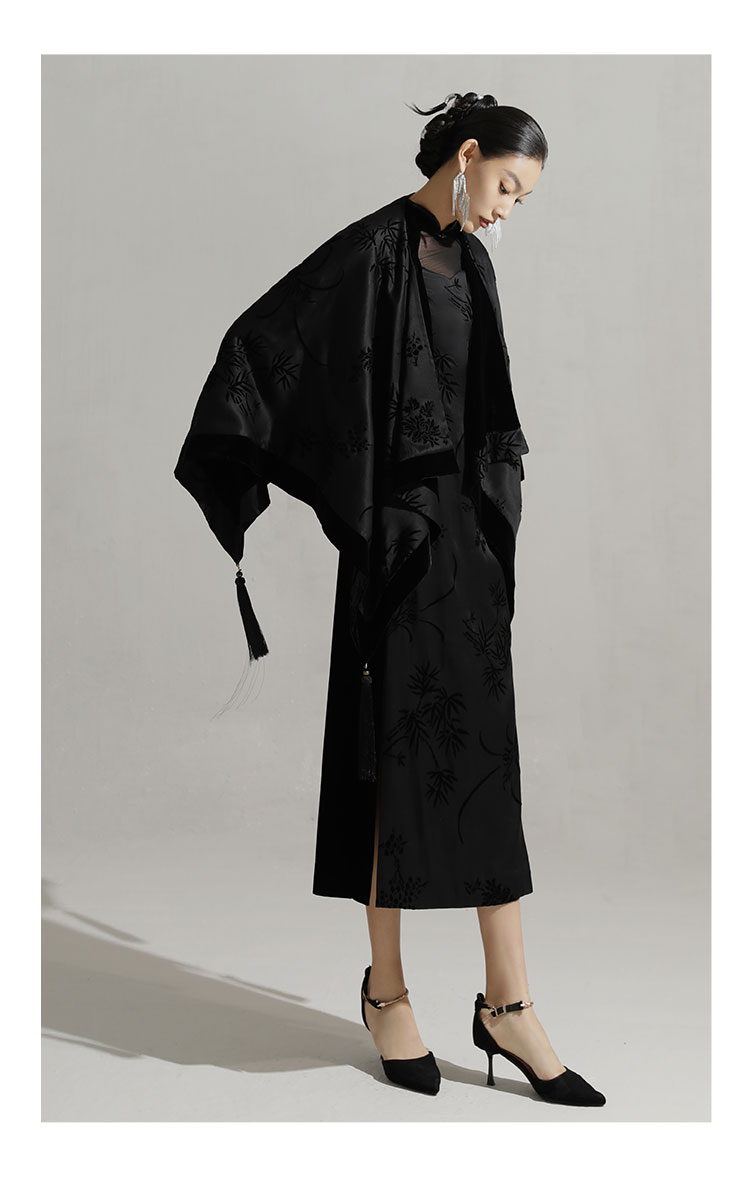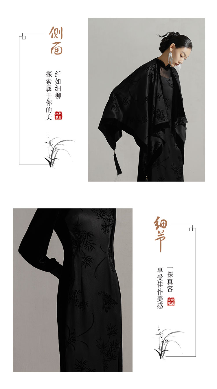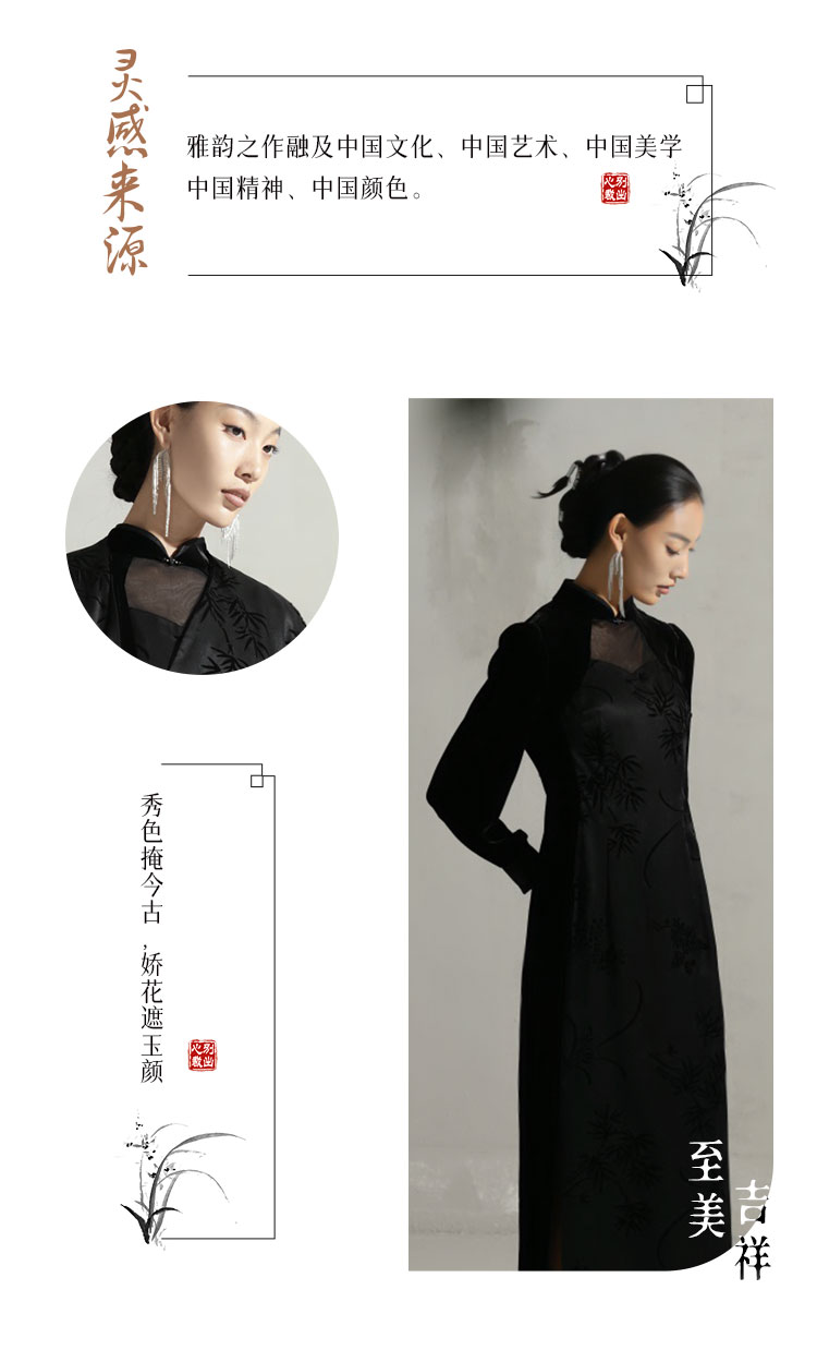 吉祥衣家新中式复古国风气质高端立领女装修身黑色兰之猗香连衣裙